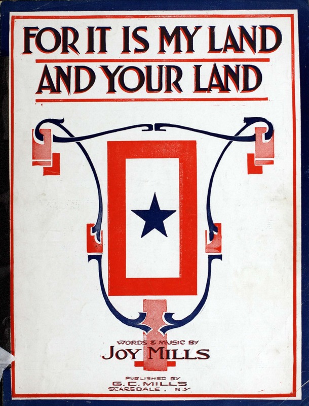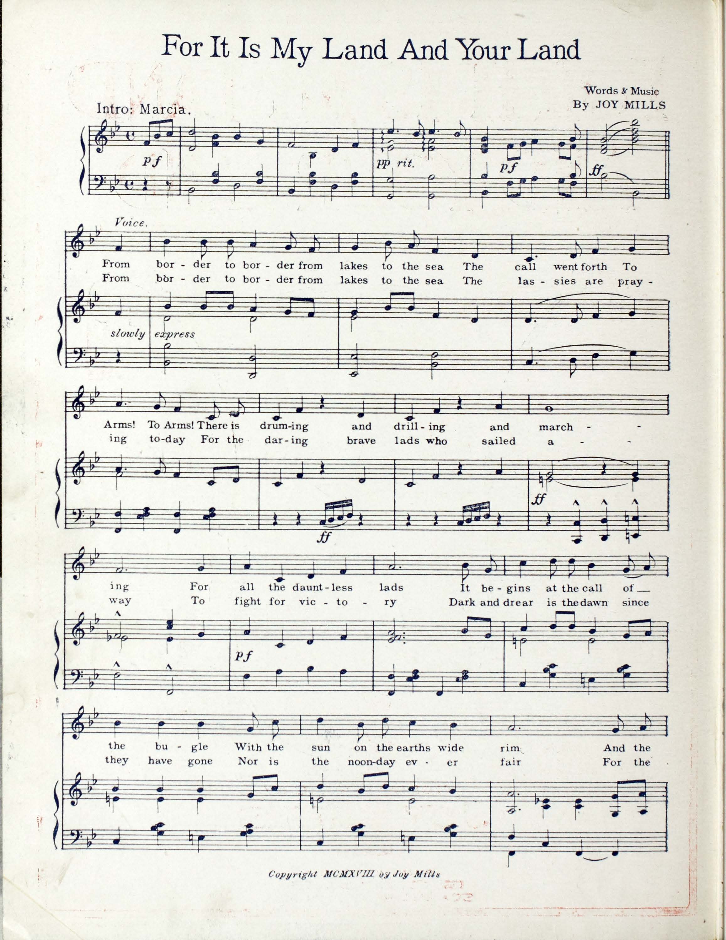 Mills, Joy (Composer). 2000. “For It Is My Land and Your Land Words and Music by Joy Mills”. Scarsdale, N.Y. : published by G.C. Mills, World War I Sheet Music, accessed February 12, 2026, https://digitalexhibits.library.wustl.edu/s/wwimusic/item/35661