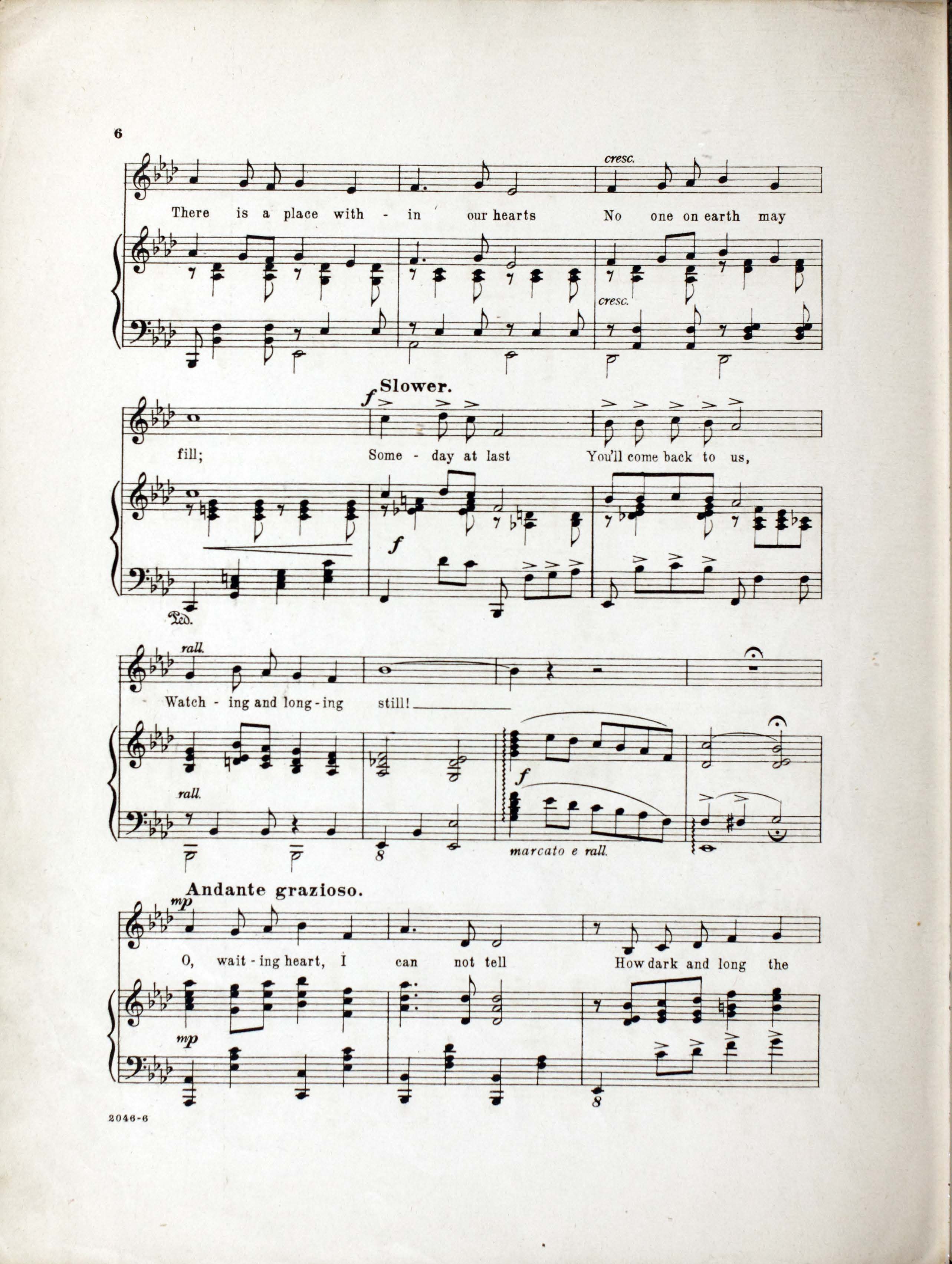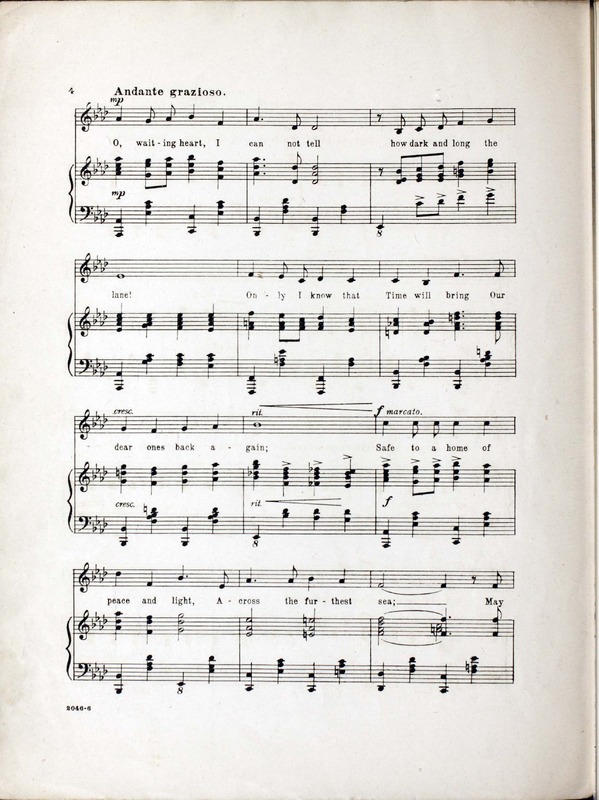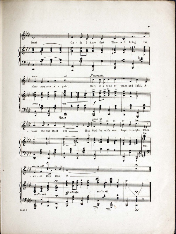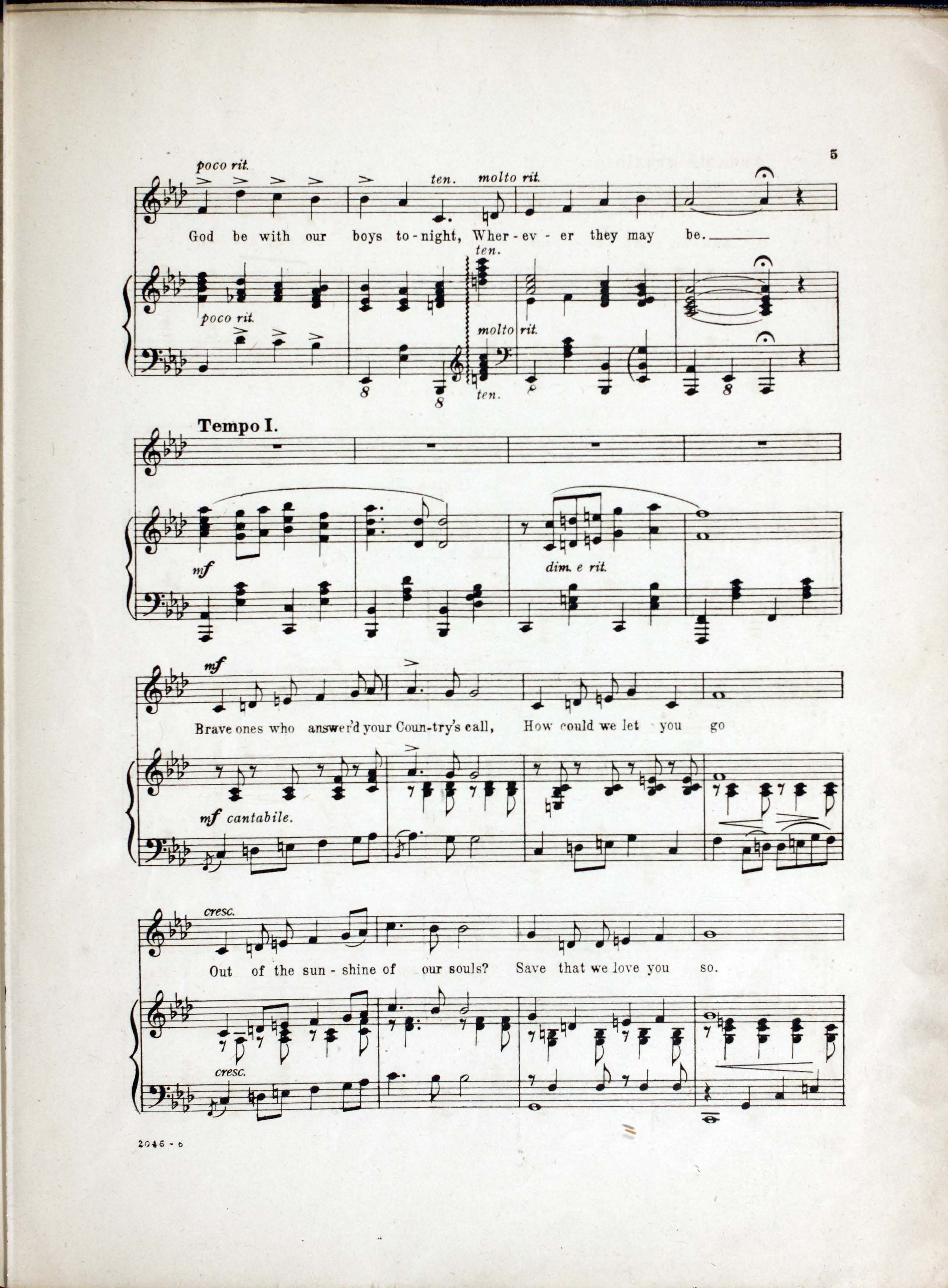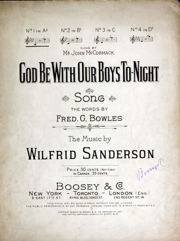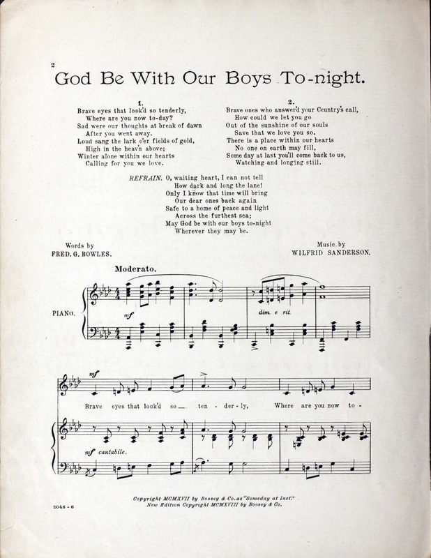 Sanderson, W. (Wilfred). 2000. “God Be With Our Boys Tonight : Song the Words by Fred. G. Bowles ; The Music by Wilfrid Sanderson”. 2015, Washington University in St. Louis, University Libraries. Data Are Freely Accessible.. New York (9 East 17th St.) : Boosey & Co, World War I Sheet Music, accessed February 12, 2026, https://digitalexhibits.library.wustl.edu/s/wwimusic/item/35666