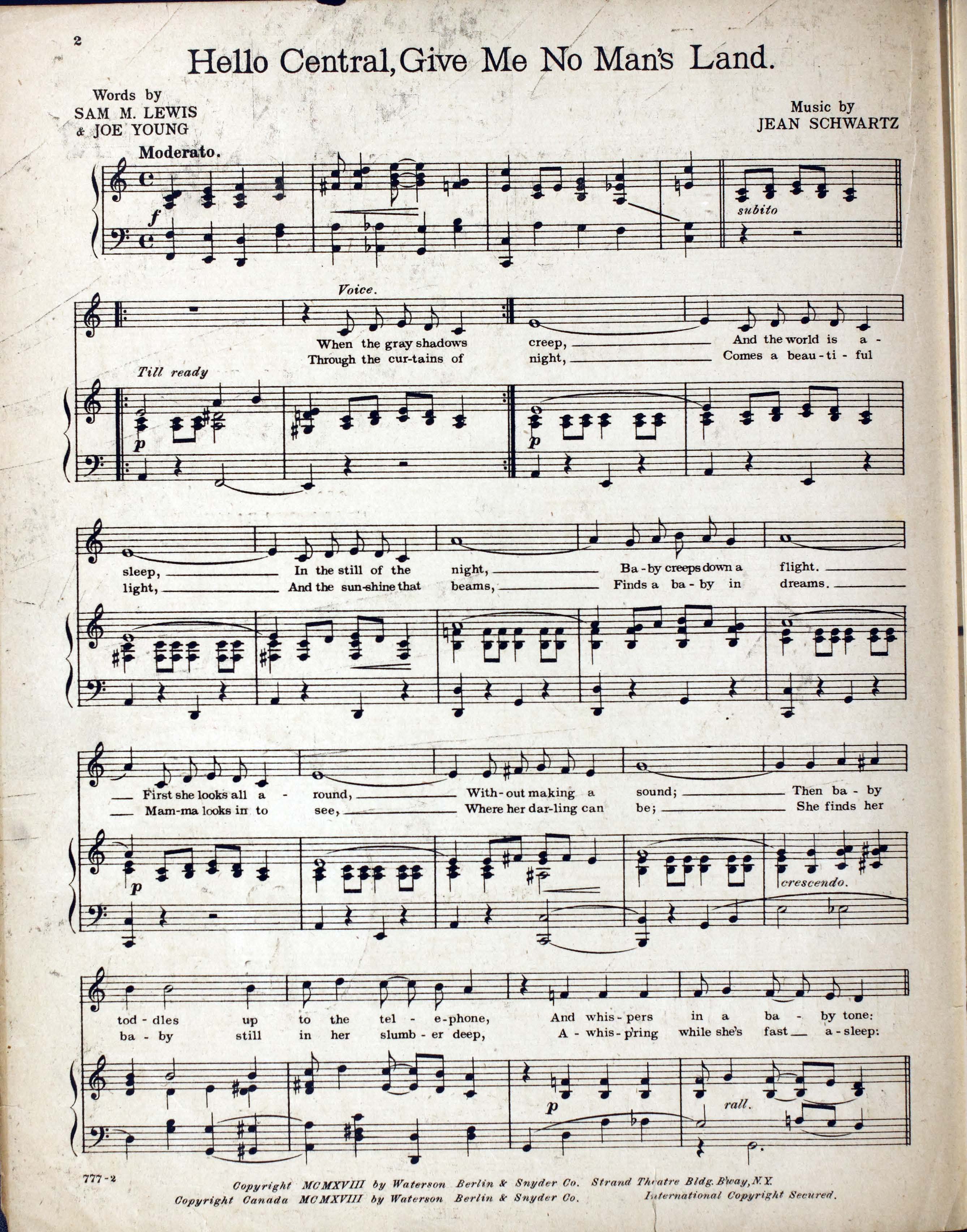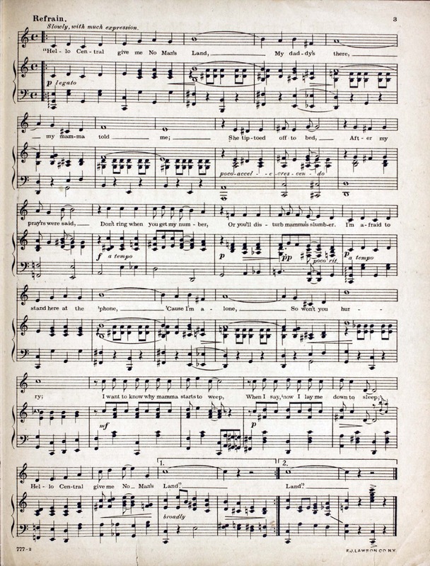 Schwartz, Jean, 1878-1956. 2000. “Hello Central! Give Me No Man’s Land Words by Sam M. Lewis & Joe Young ; Music by Jean Schwartz”. New York (Strand Theatre Bldg., Broadway at 47th St.) : Waterson, Berlin & Snyder Co, World War I Sheet Music, accessed February 12, 2026, https://digitalexhibits.library.wustl.edu/s/wwimusic/item/35670