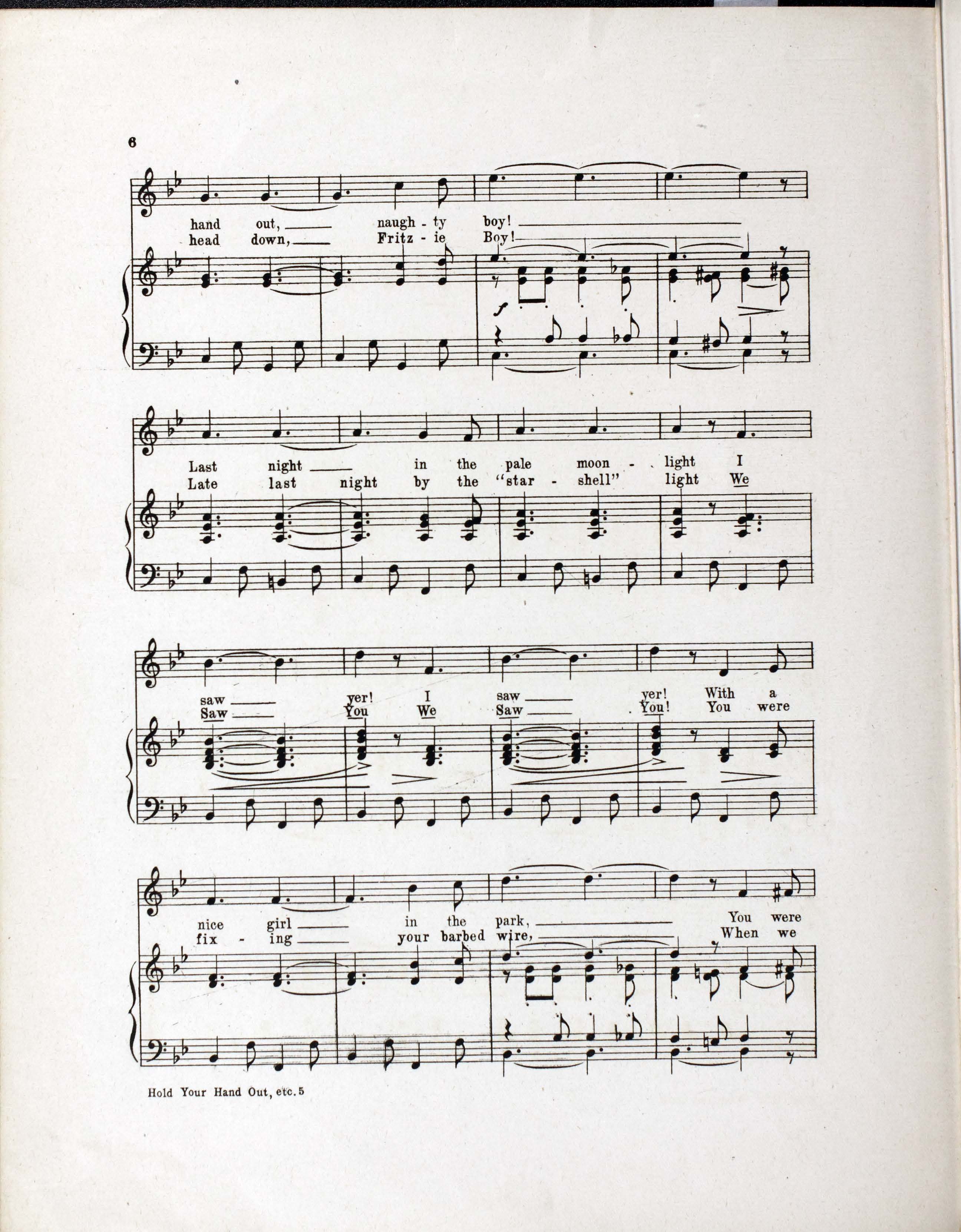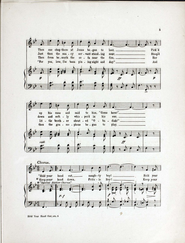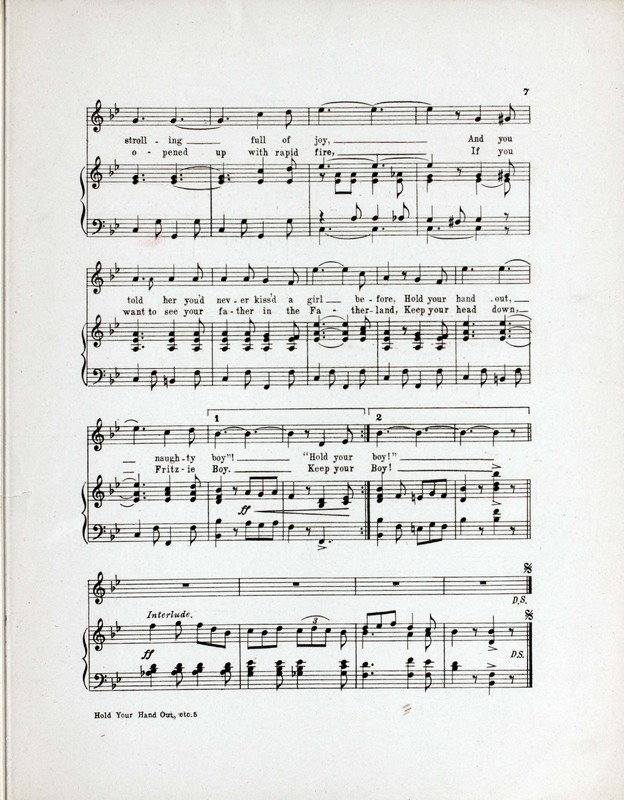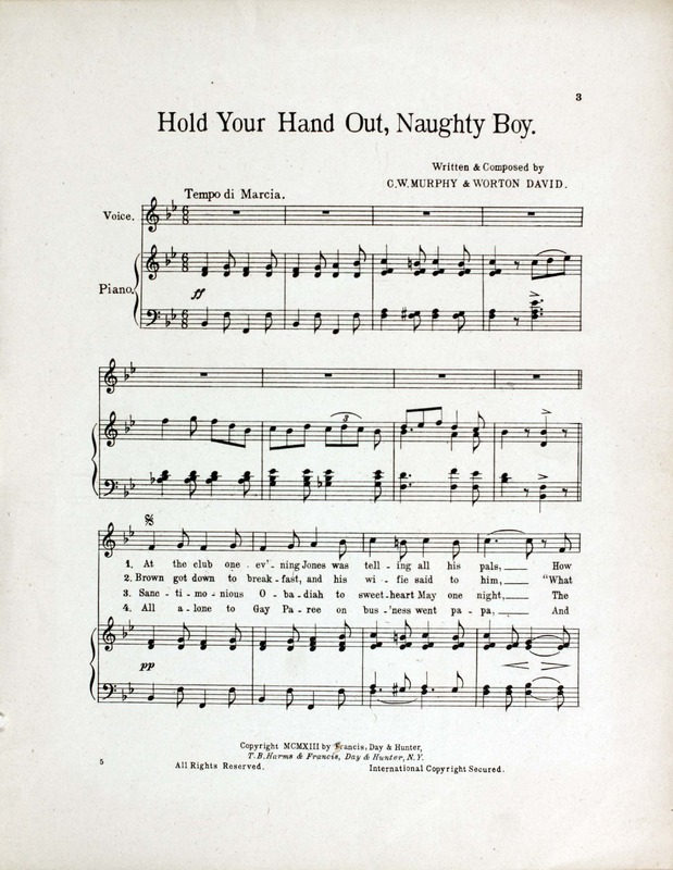 Murphy, C. W., (Clarence Wainwright), 1875-1913. 1917. “Hold Your Hand Out, Naughty Boy Written and Composed by C.W. Murphy and Worton David”. New York : T.B. Harms and : Francis, Day & Hunter, World War I Sheet Music, accessed February 13, 2026, https://digitalexhibits.library.wustl.edu/s/wwimusic/item/35964