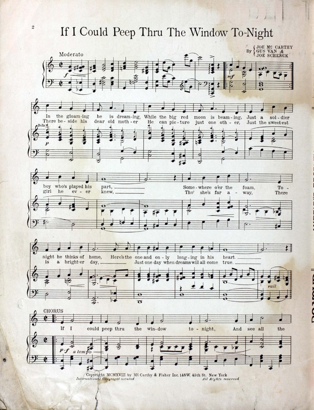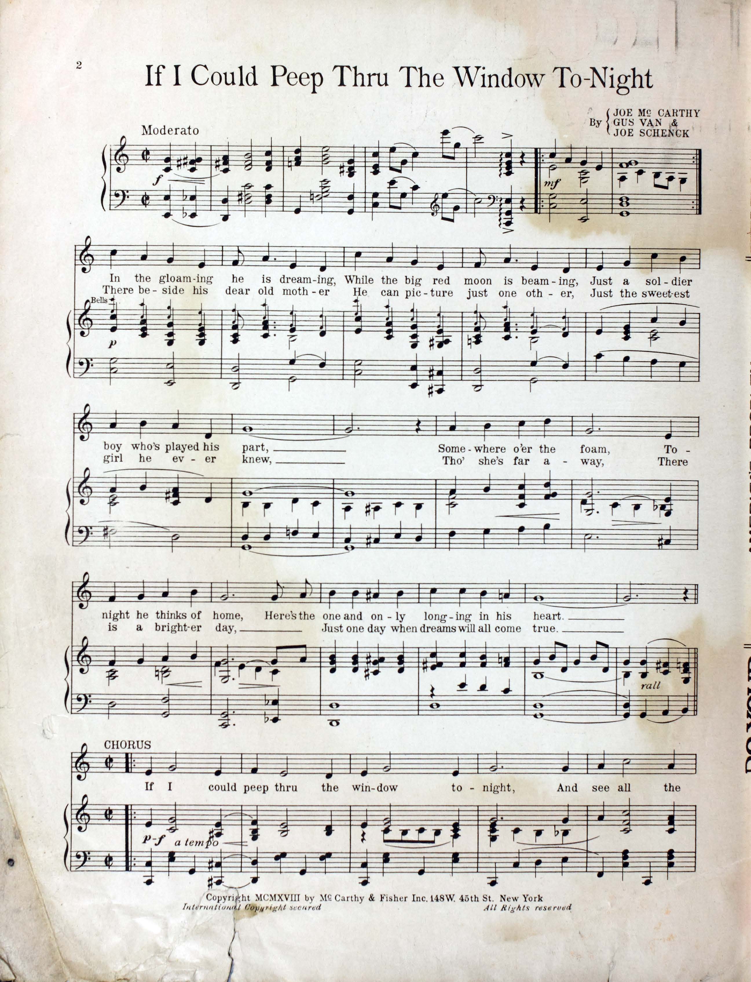 Schenck, Joe, 1891-1930. 2000. “If I Could Peep Thru the Window Tonight By Joe McCarthy, Gus Van & Joe Schenk”. New York (148 W. 45th St.) : McCarthy & Fisher, Inc., music publishers, World War I Sheet Music, accessed April 26, 2026, https://digitalexhibits.library.wustl.edu/s/wwimusic/item/35965