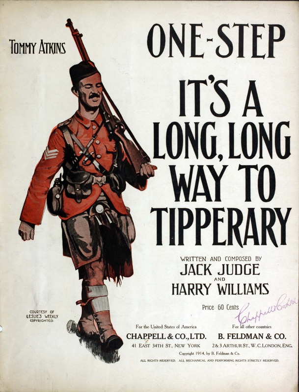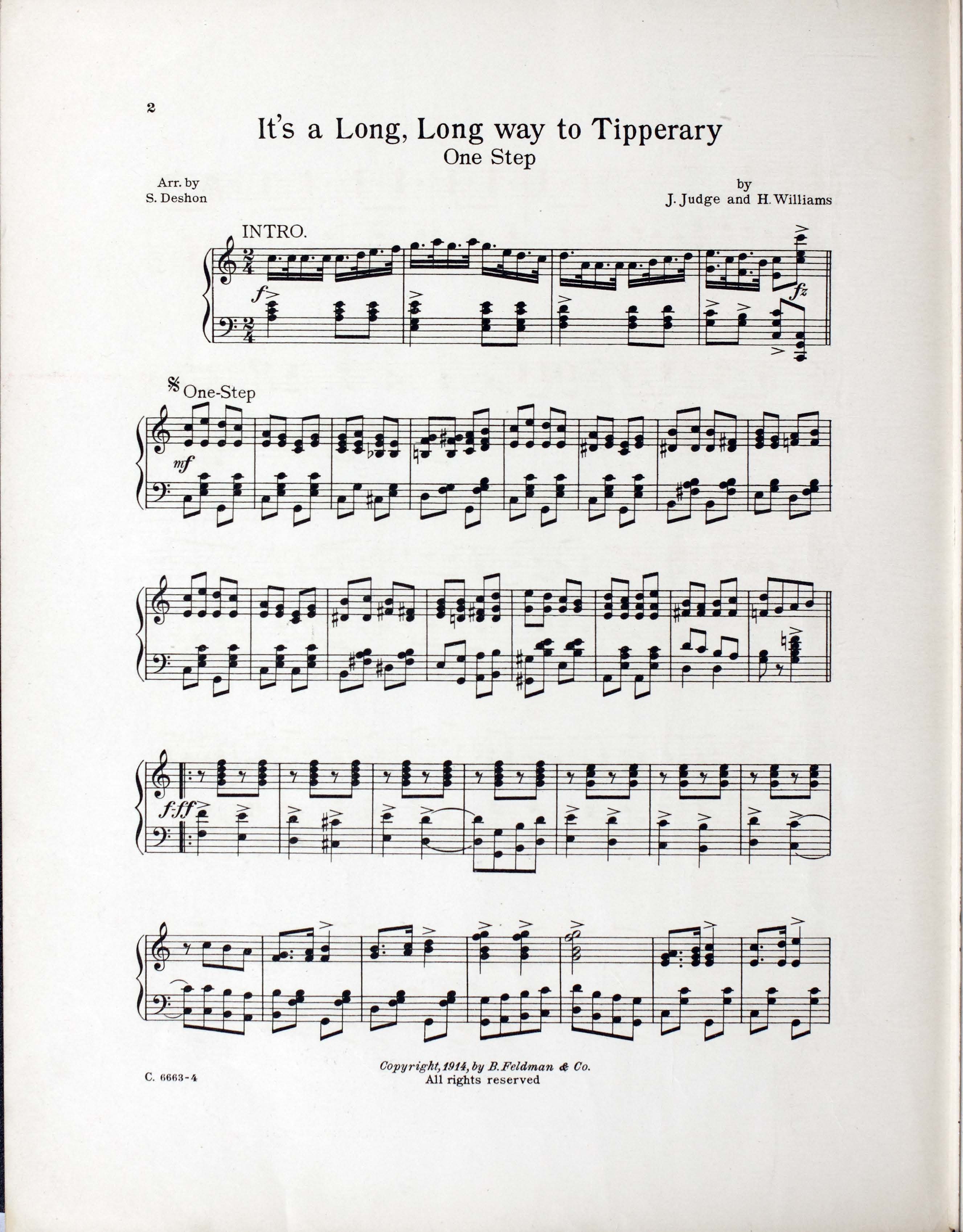Williams, Harry, 1872-1922. 2000. “It’s a Long, Long Way to Tipperary : One-Step Written and Composed by Jack Judge and Harry Williams. ; [arr. By S. Deshon]”. New York (41 East 34th St., New York) : Chappell & Co., Ltd. ; London (2 & 3 Arthur St., W.C., London, Eng.) : B. Feldman & Co, World War I Sheet Music, accessed February 13, 2026, https://digitalexhibits.library.wustl.edu/s/wwimusic/item/35993