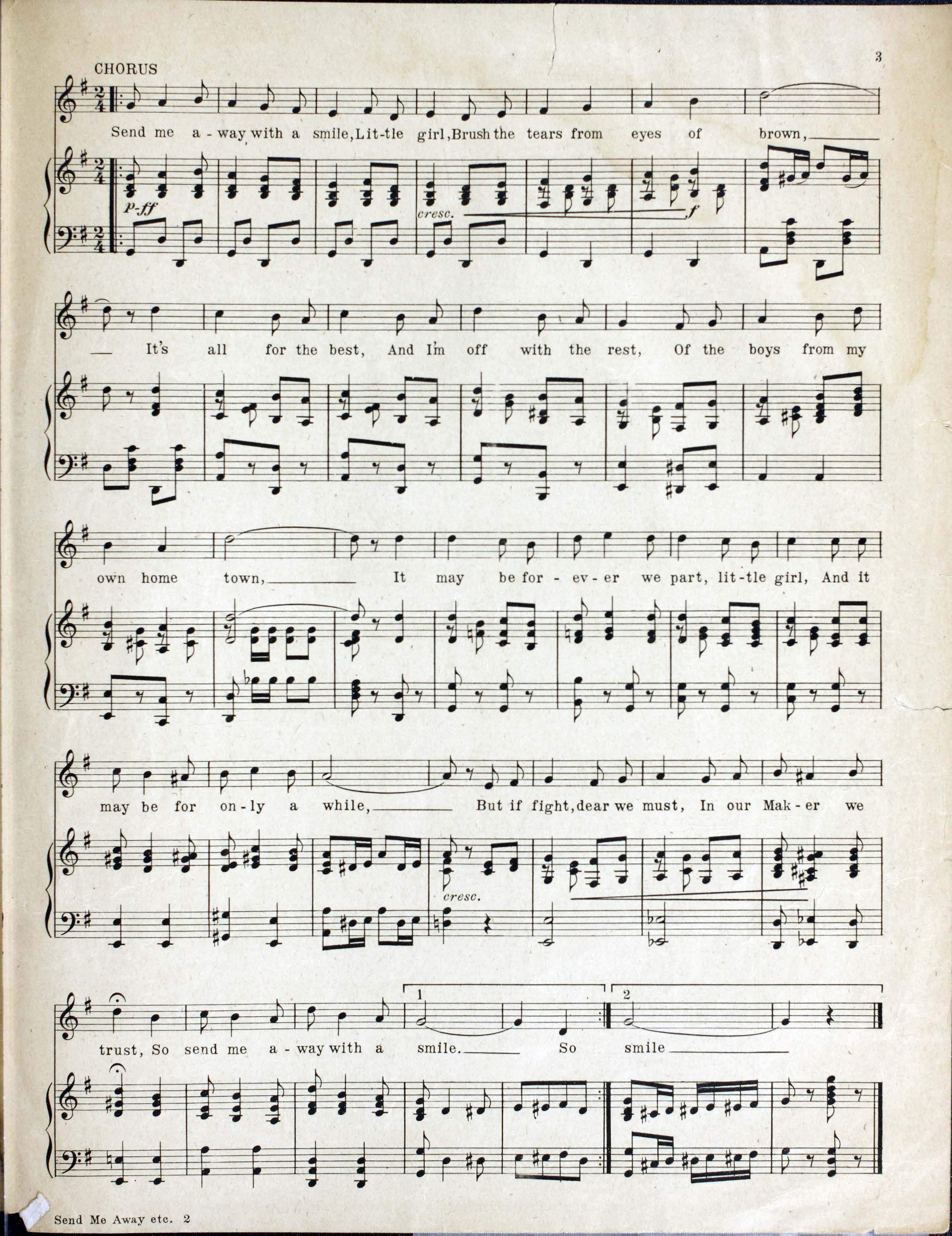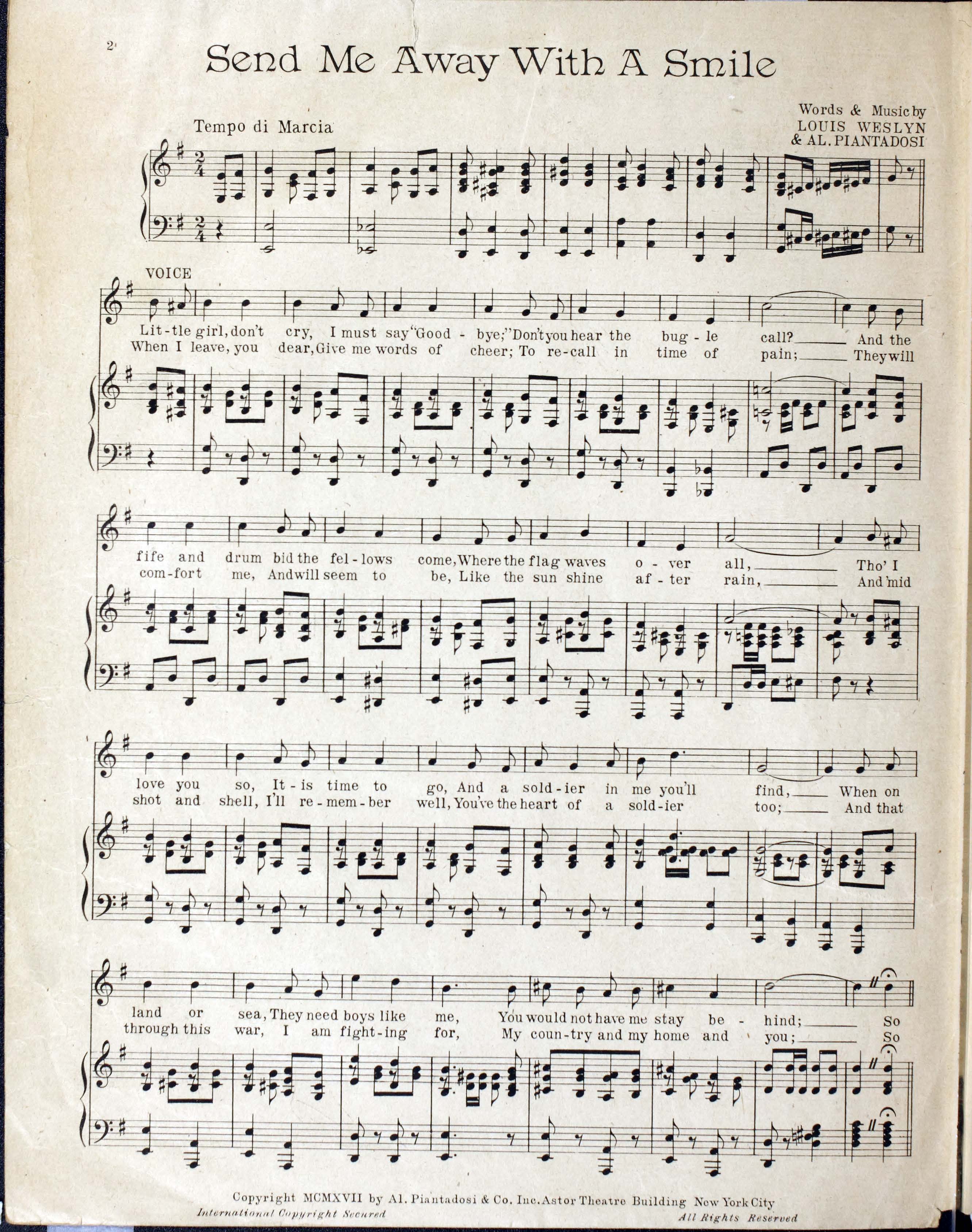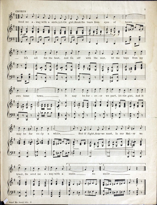 Piantadosi, Al, 1884-1955. 2000. “Send Me Away With a Smile Words & Music by Louis Weslyn and Al Piantadosi”. New York : published by Al Piantodosi & Co., Inc, World War I Sheet Music, accessed February 12, 2026, https://digitalexhibits.library.wustl.edu/s/wwimusic/item/35994