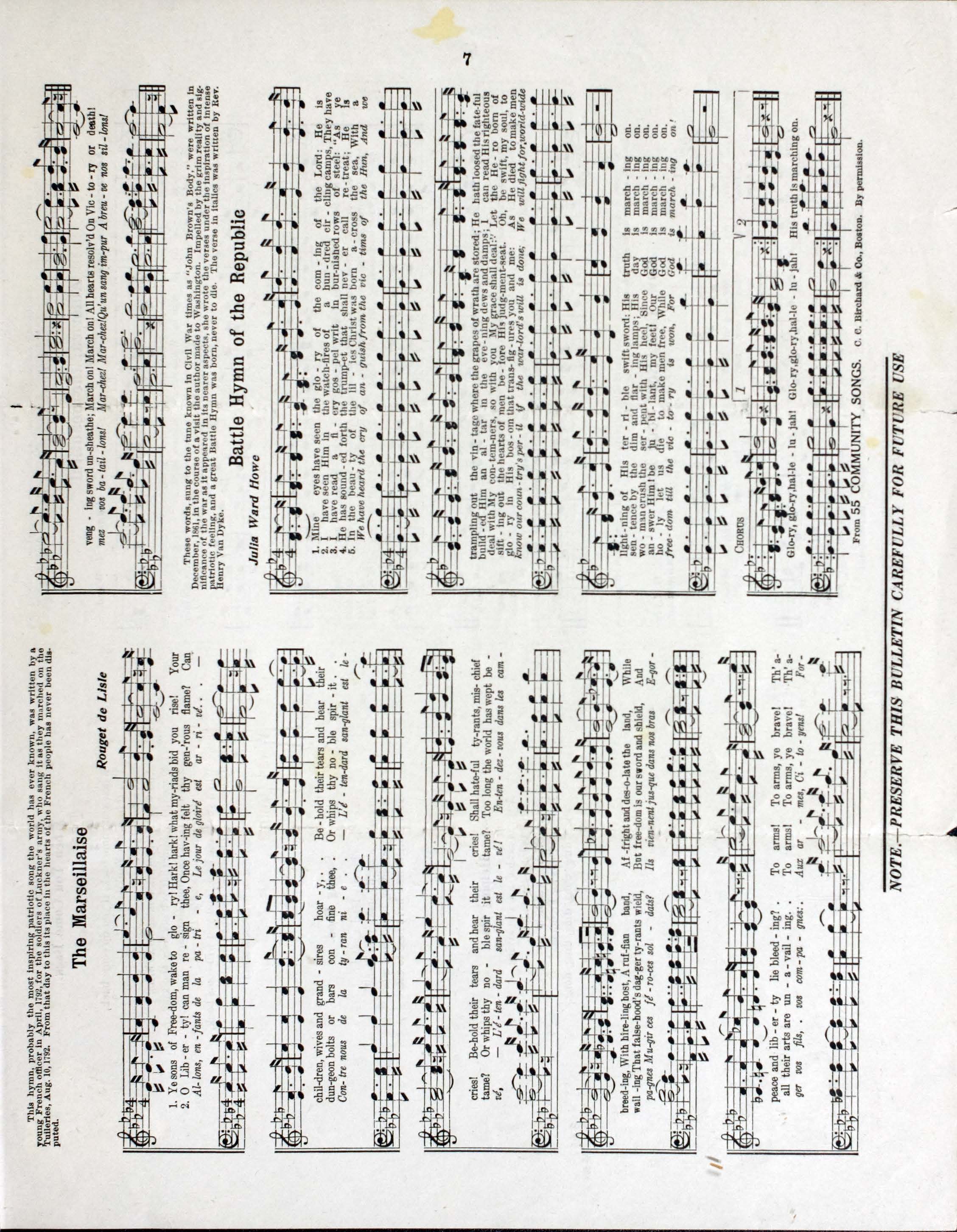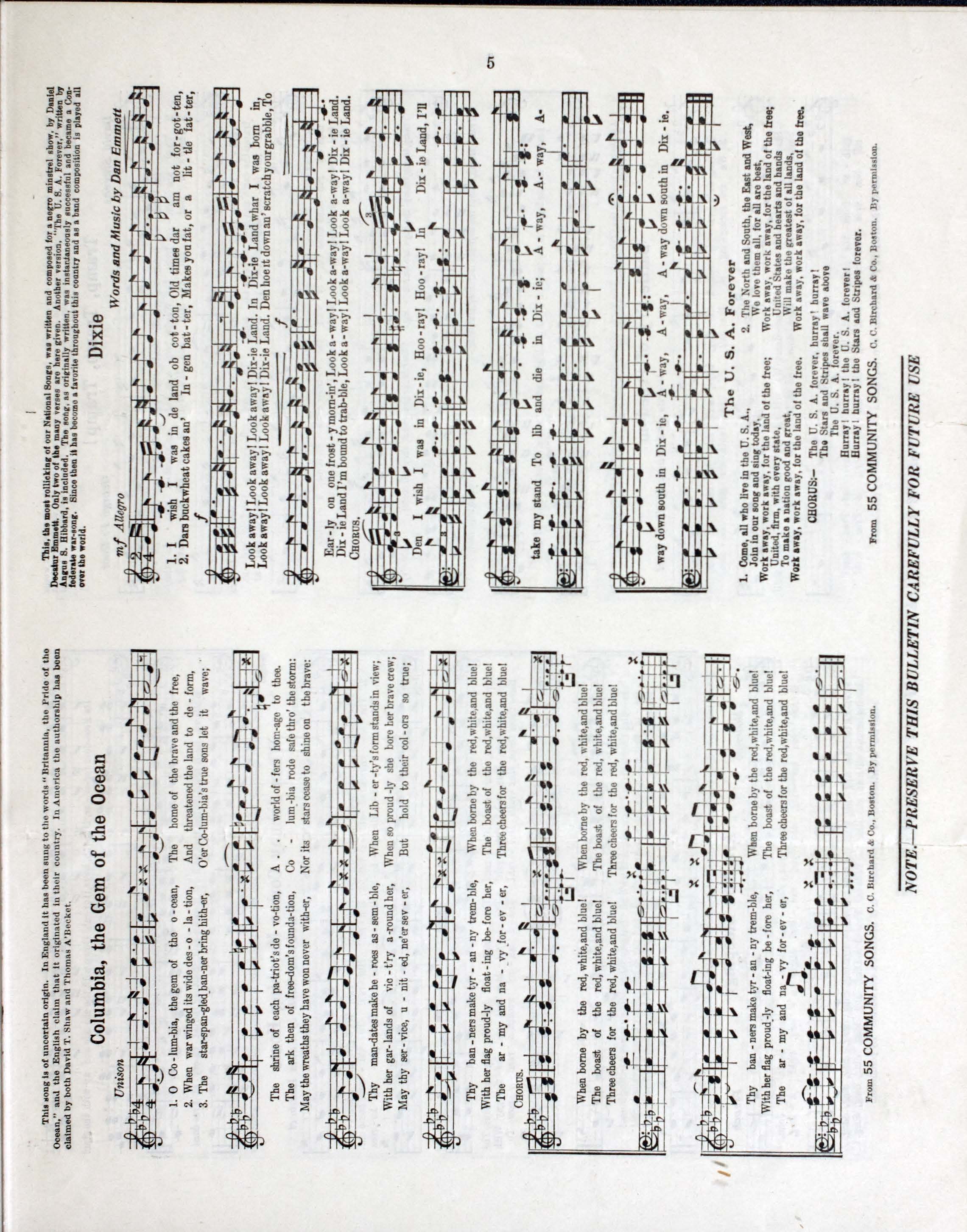 Musical selections: America -- The star-spangled banner -- Columbia, the gem of the ocean -- Dixie -- Tramp, tramp tramp! -- Battle cry of freedom -- When Johnny comes marching home -- Are you sleeping? -- The Marseillaise -- Battle hymn of the Republic -- America the beautiful -- Row, row, row your boat.
