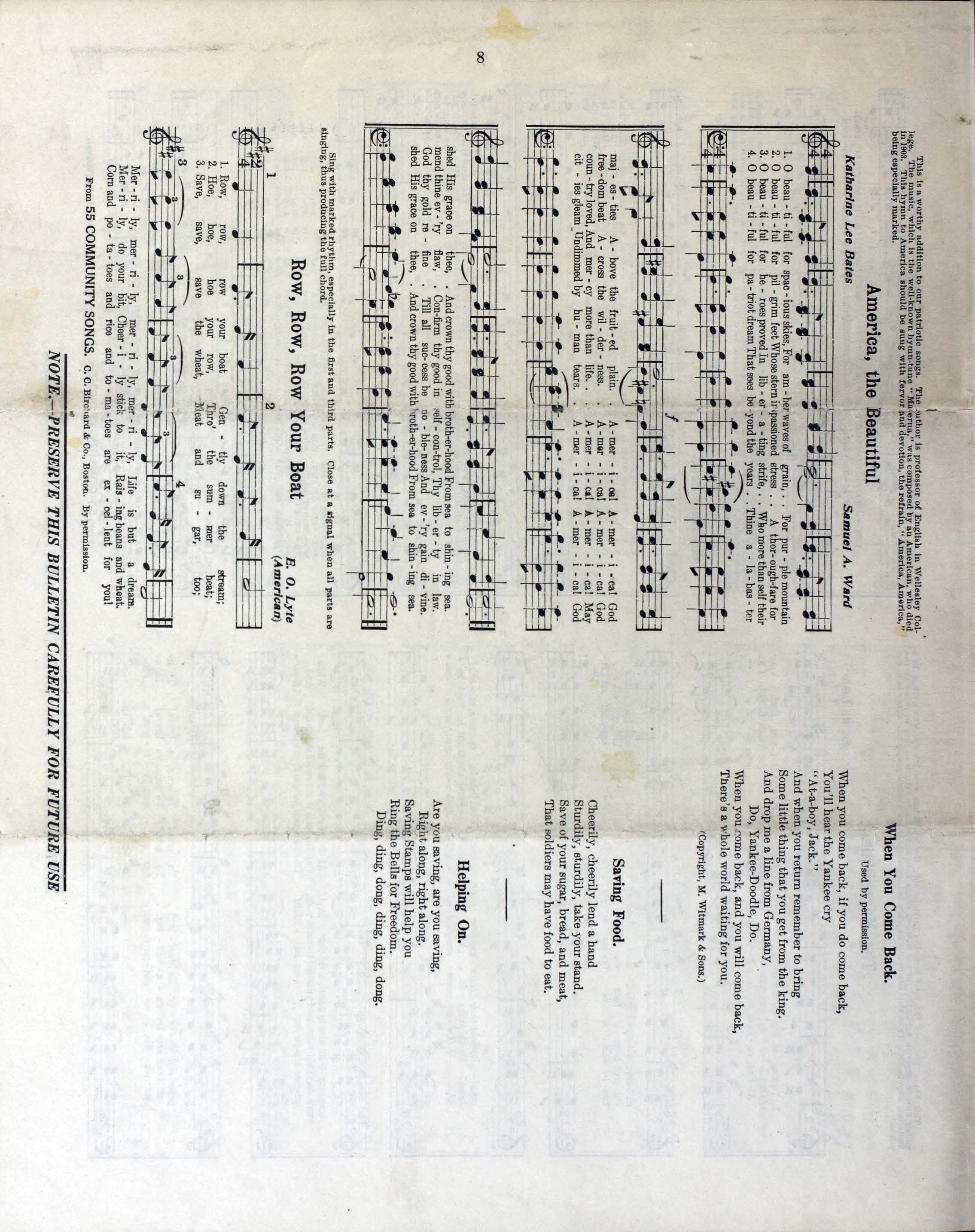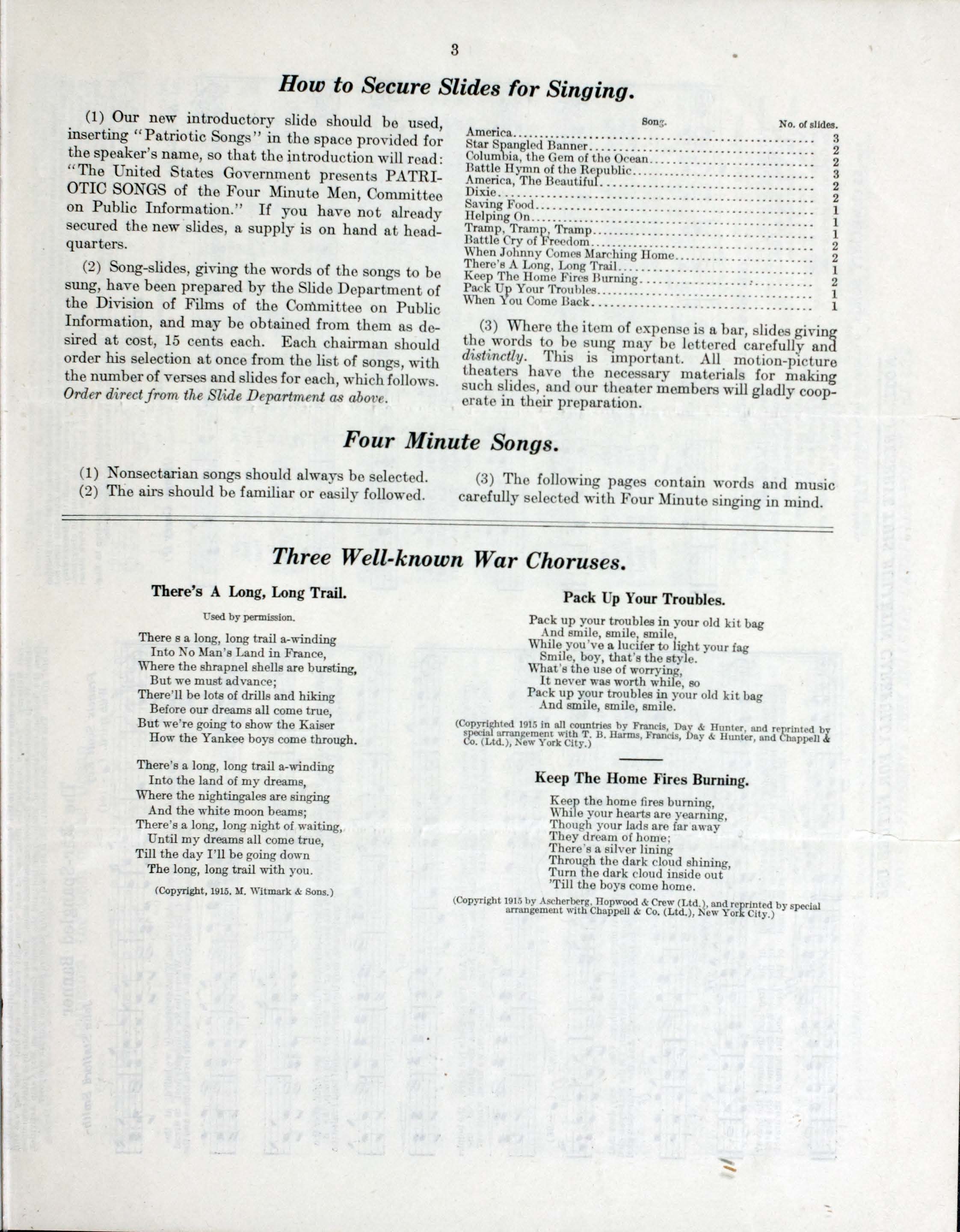 Song lyrics only: There's a long, long trail -- Pack up your troubles -- Keep the home fires burning -- When you come back -- Saving food -- Helping on.