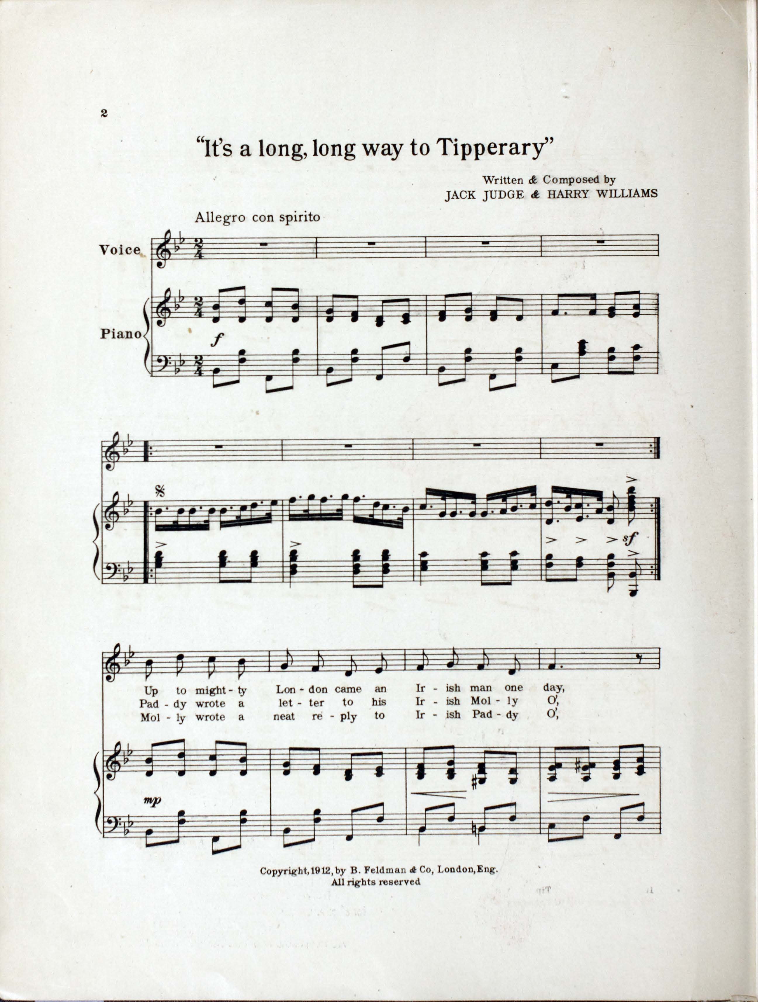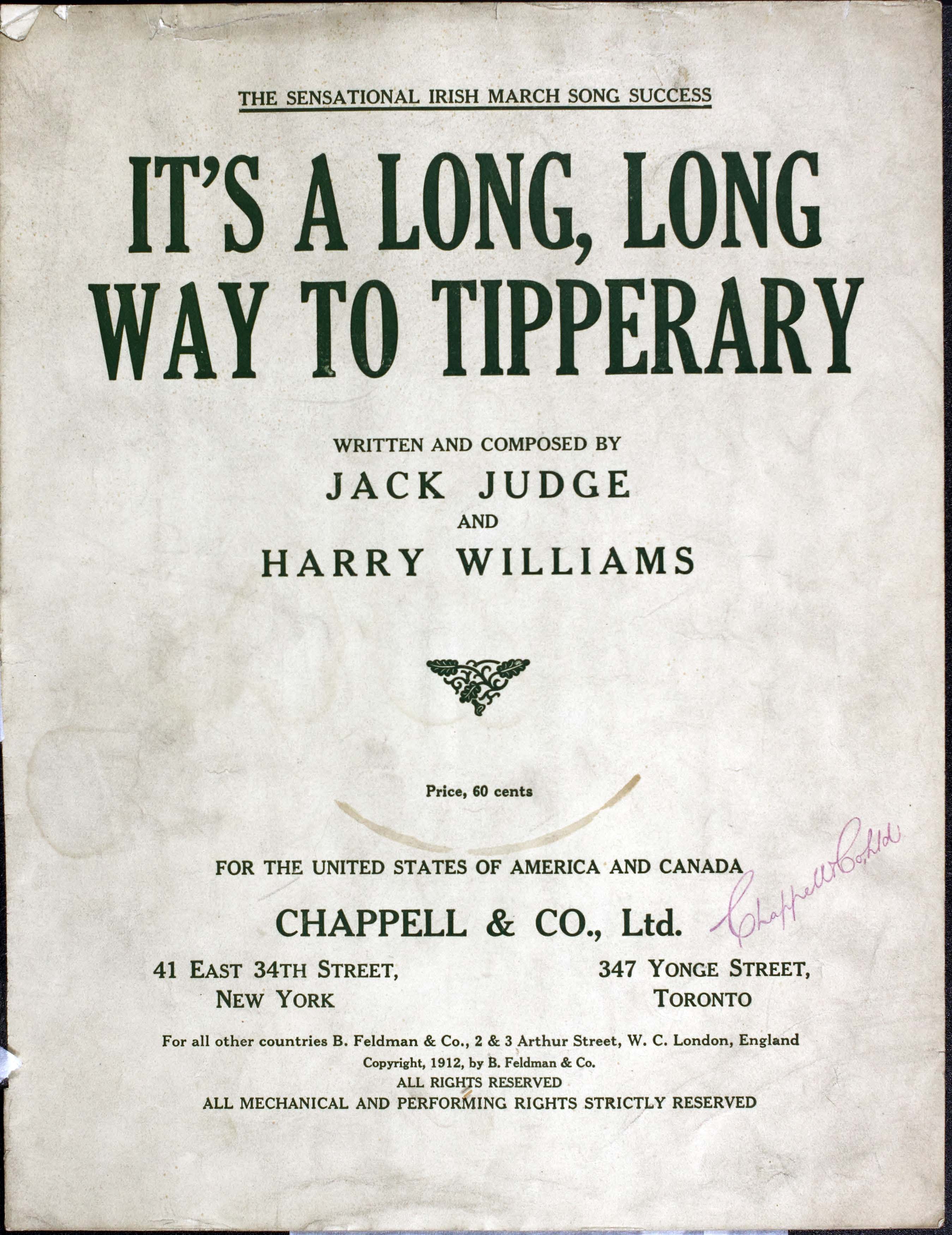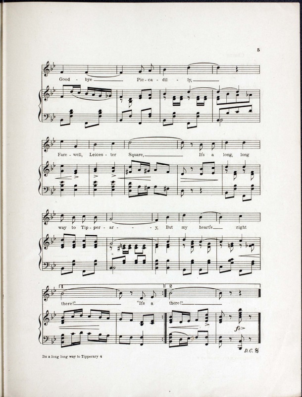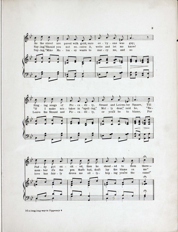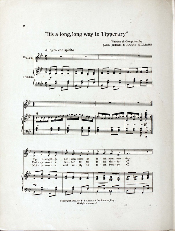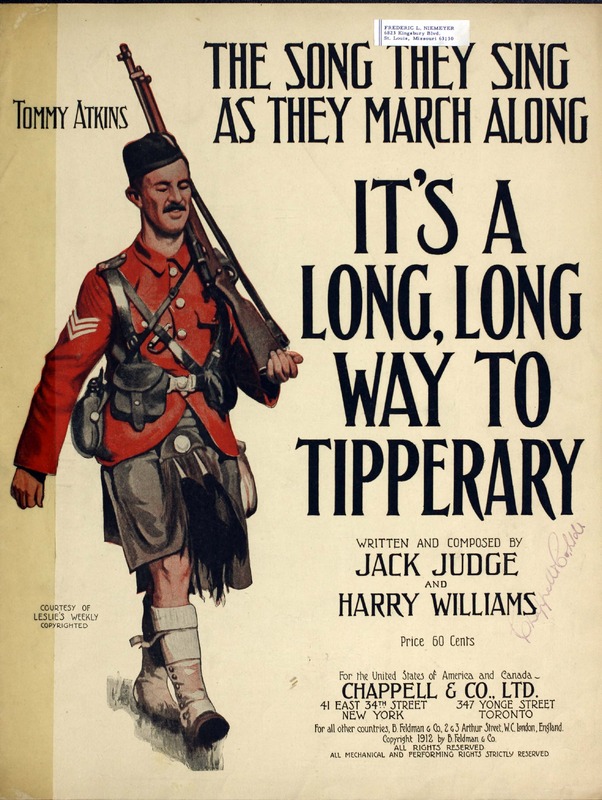 Williams, Harry, 1872-1922. 2000. “It’s a Long, Long Way to Tipperary Written and Composed by Jack Judge and Harry Williams”. New York (41 East 34th Street) : for the United States of America and Canada, Chappell & Co., Ltd, World War I Sheet Music, accessed February 11, 2026, https://digitalexhibits.library.wustl.edu/s/wwimusic/item/35997
