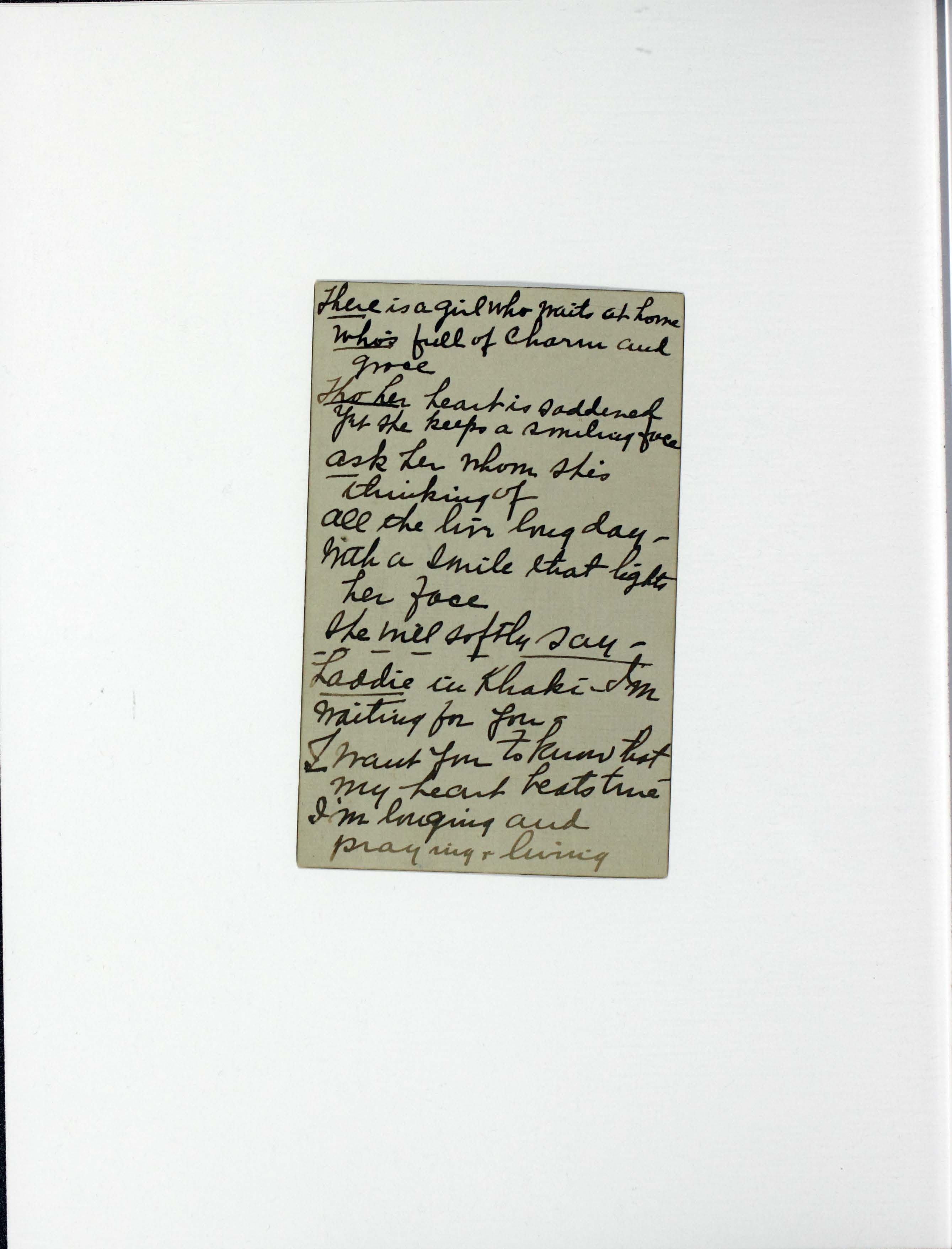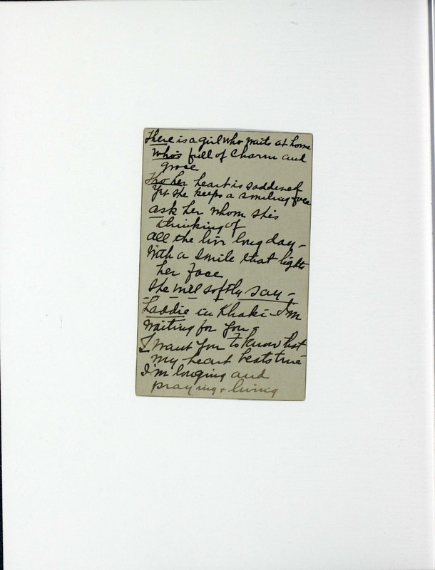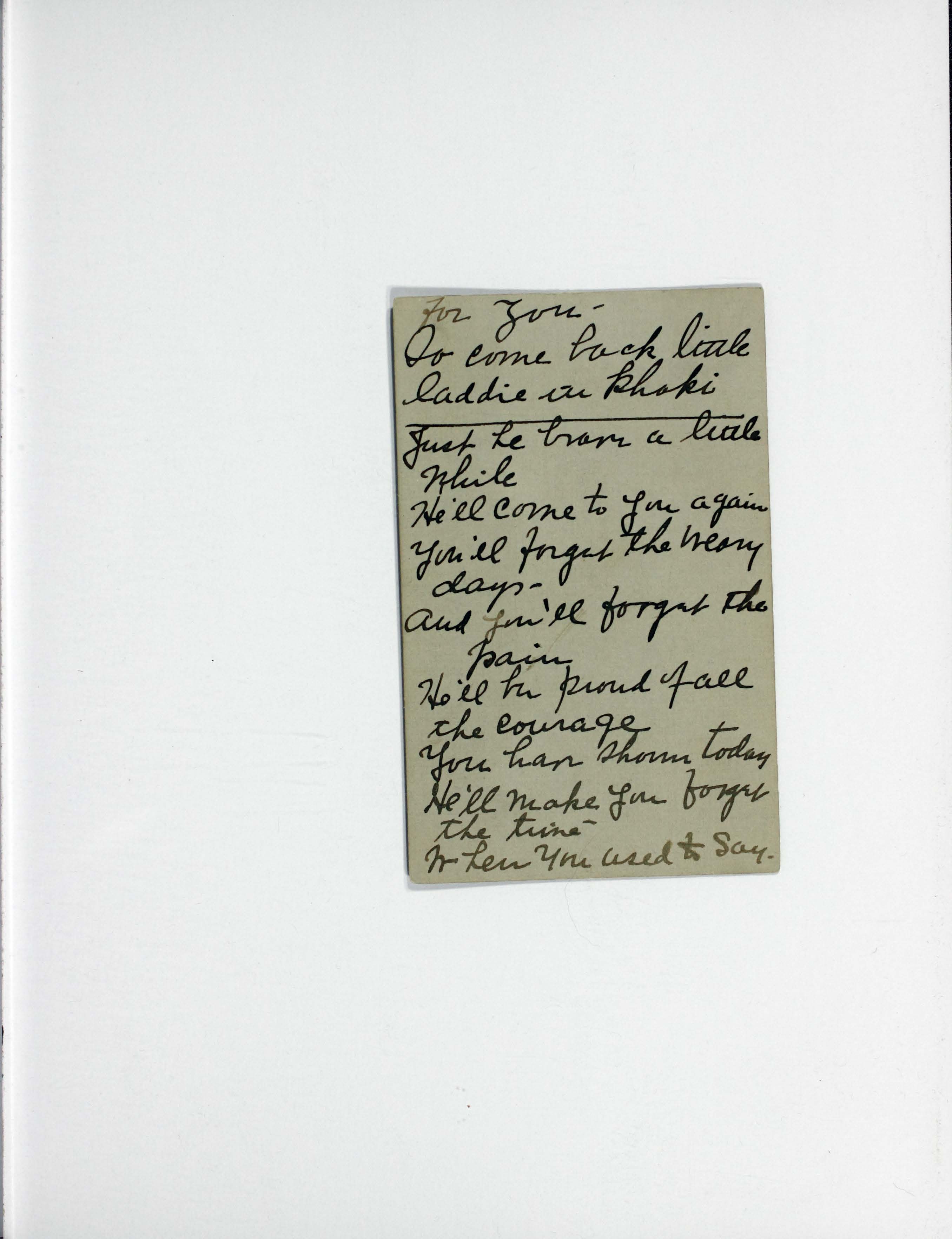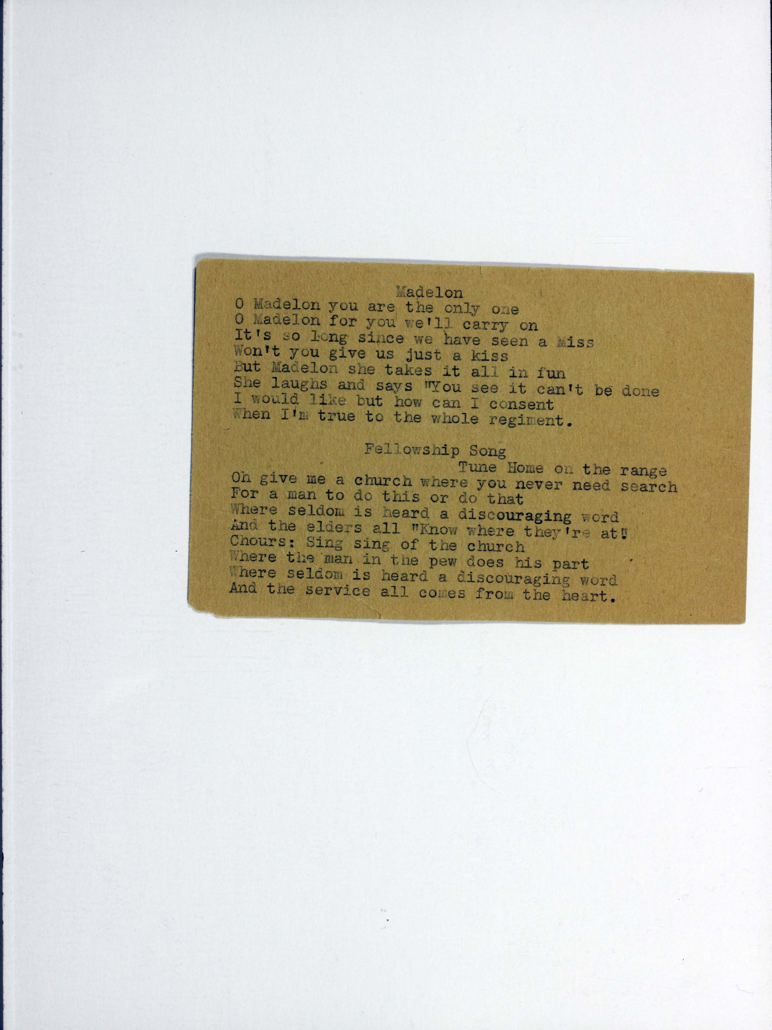 - Contains "For You" in handwritten ink, and a card of two typed stanzas entitled "Madelon" and "Fellowship Song" (to be sung to the tune of Home on the Range."