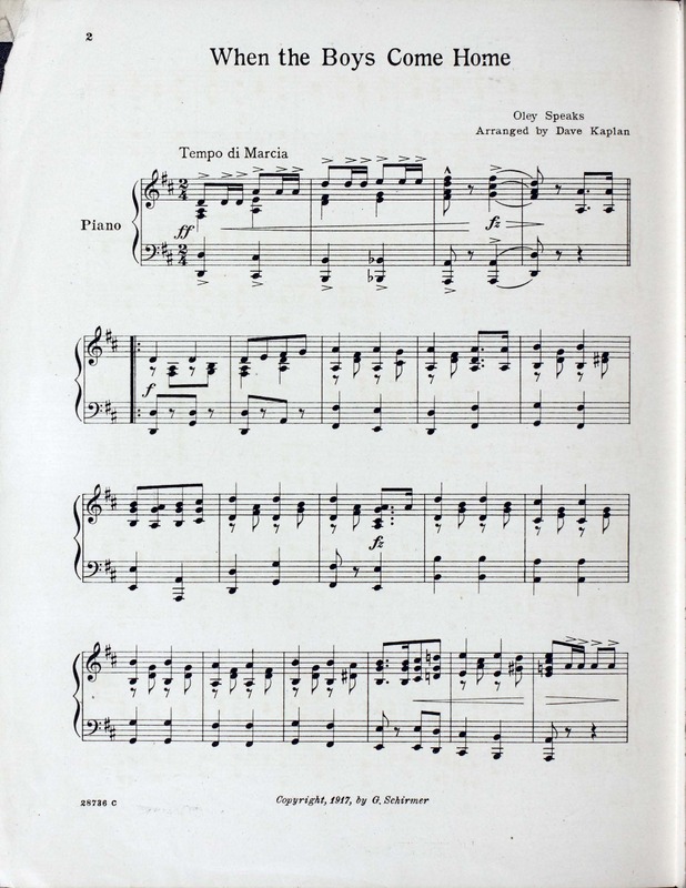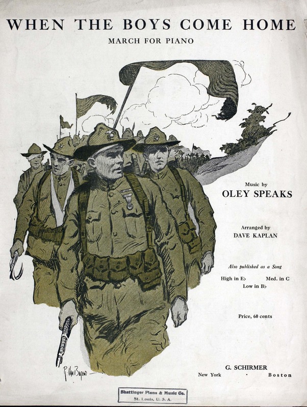 Speaks, Oley, 1876-1948. 2000. “When the Boys Come Home Words by John Hay ; Music by Oley Speaks”. New York : G. Schirmer, World War I Sheet Music, accessed February 11, 2026, https://digitalexhibits.library.wustl.edu/s/wwimusic/item/36006