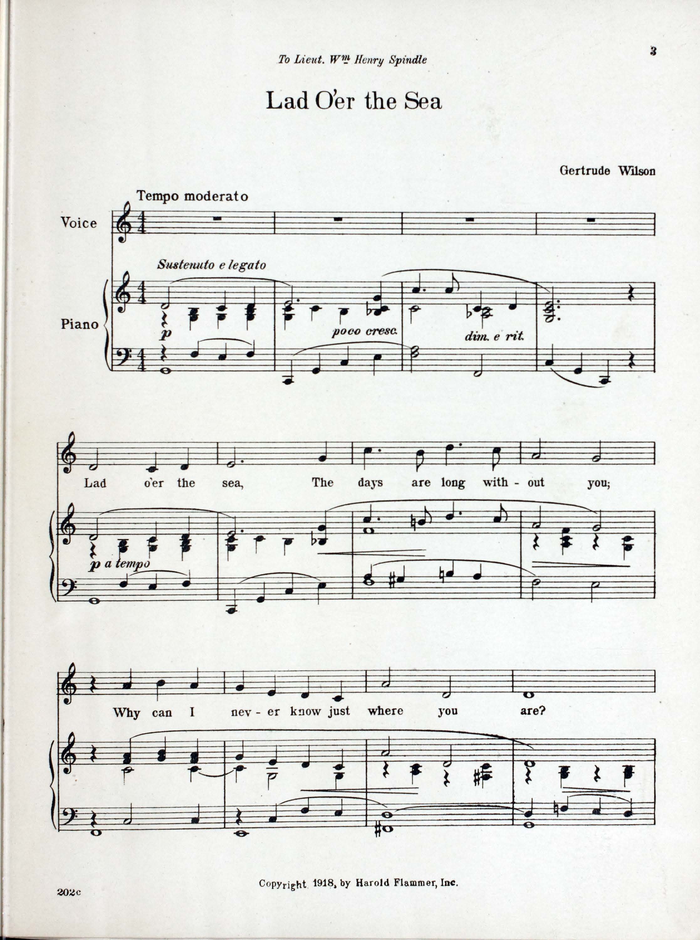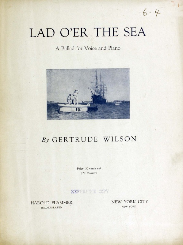 Wilson, Gertrude, 1895-1982. 2000. “Lad o’er the Sea : a Ballad for Voice and Piano By Gertrude Wilson”. New York (56 West 45th Street) : Harold Flammer Incorporated, World War I Sheet Music, accessed February 11, 2026, https://digitalexhibits.library.wustl.edu/s/wwimusic/item/36007