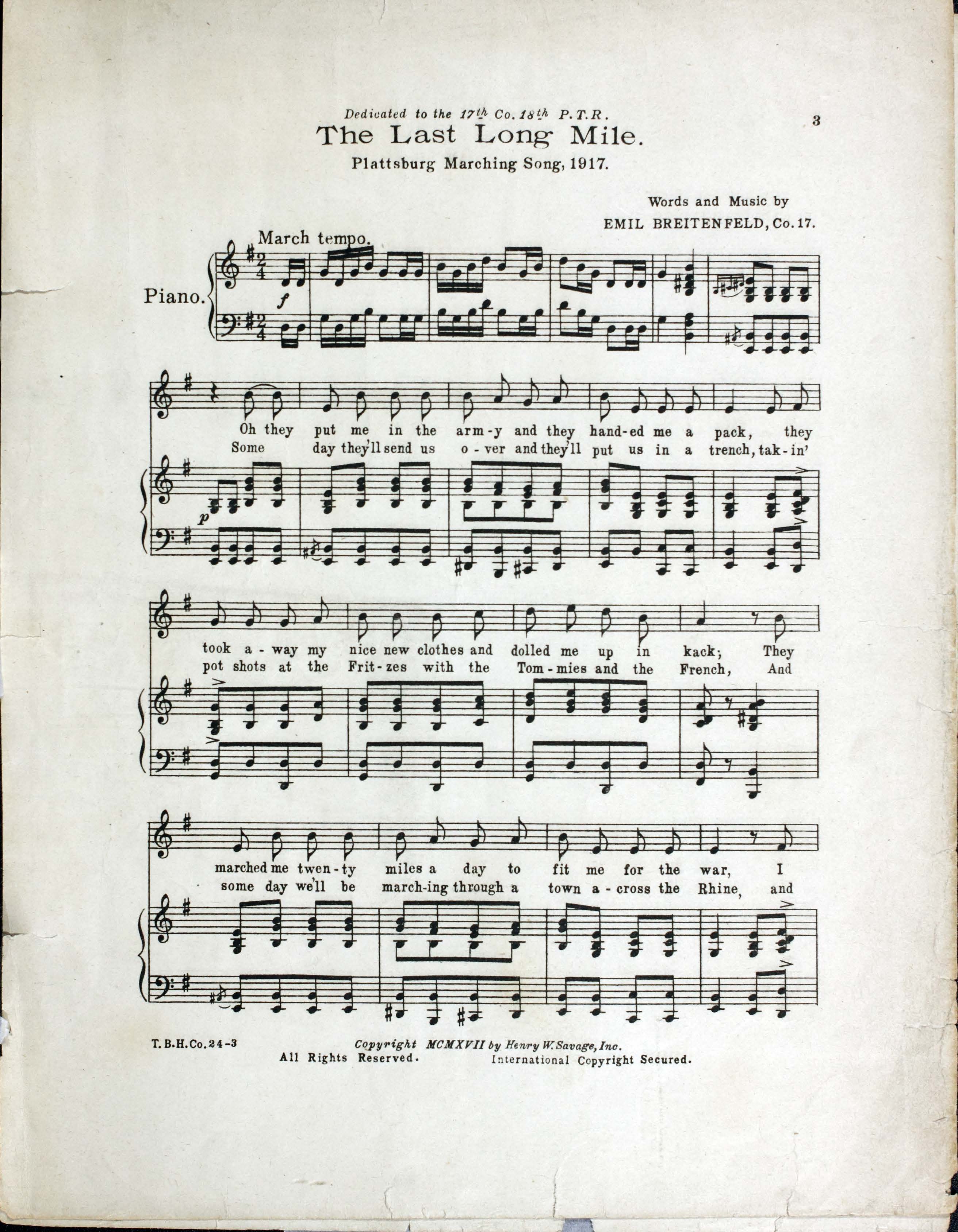 Breitenfeld, Emil. 2000. “The Last Long Mile : Plattsburg Marching Song, 1917”. New York : T.B. Harms Co, World War I Sheet Music, accessed February 11, 2026, https://digitalexhibits.library.wustl.edu/s/wwimusic/item/36010