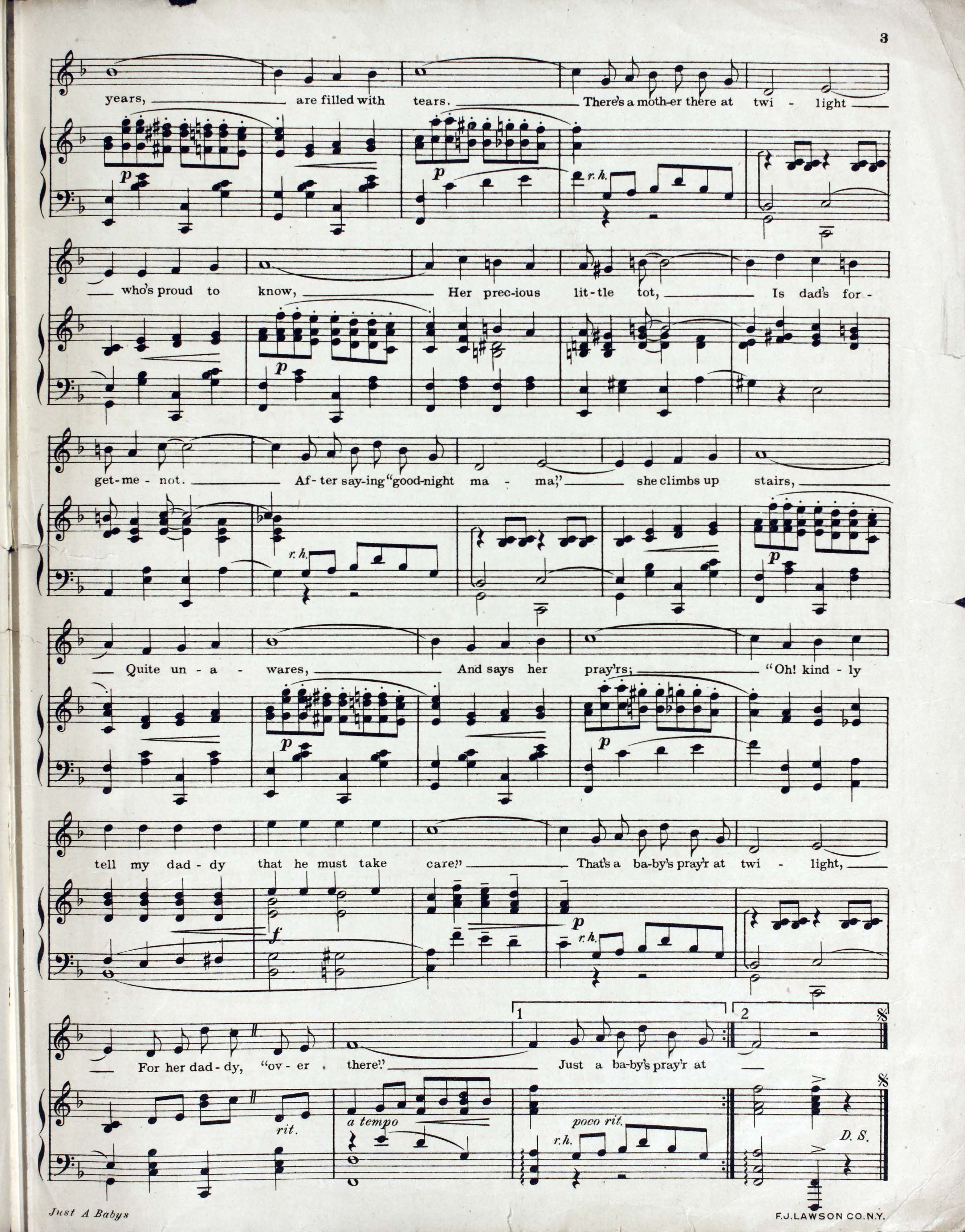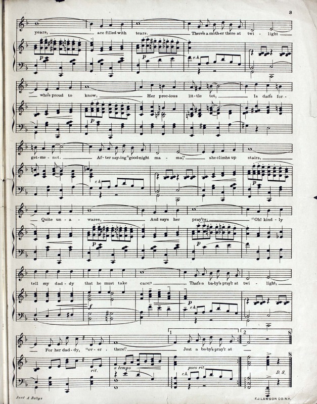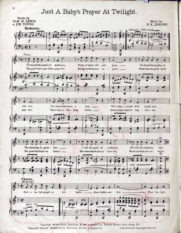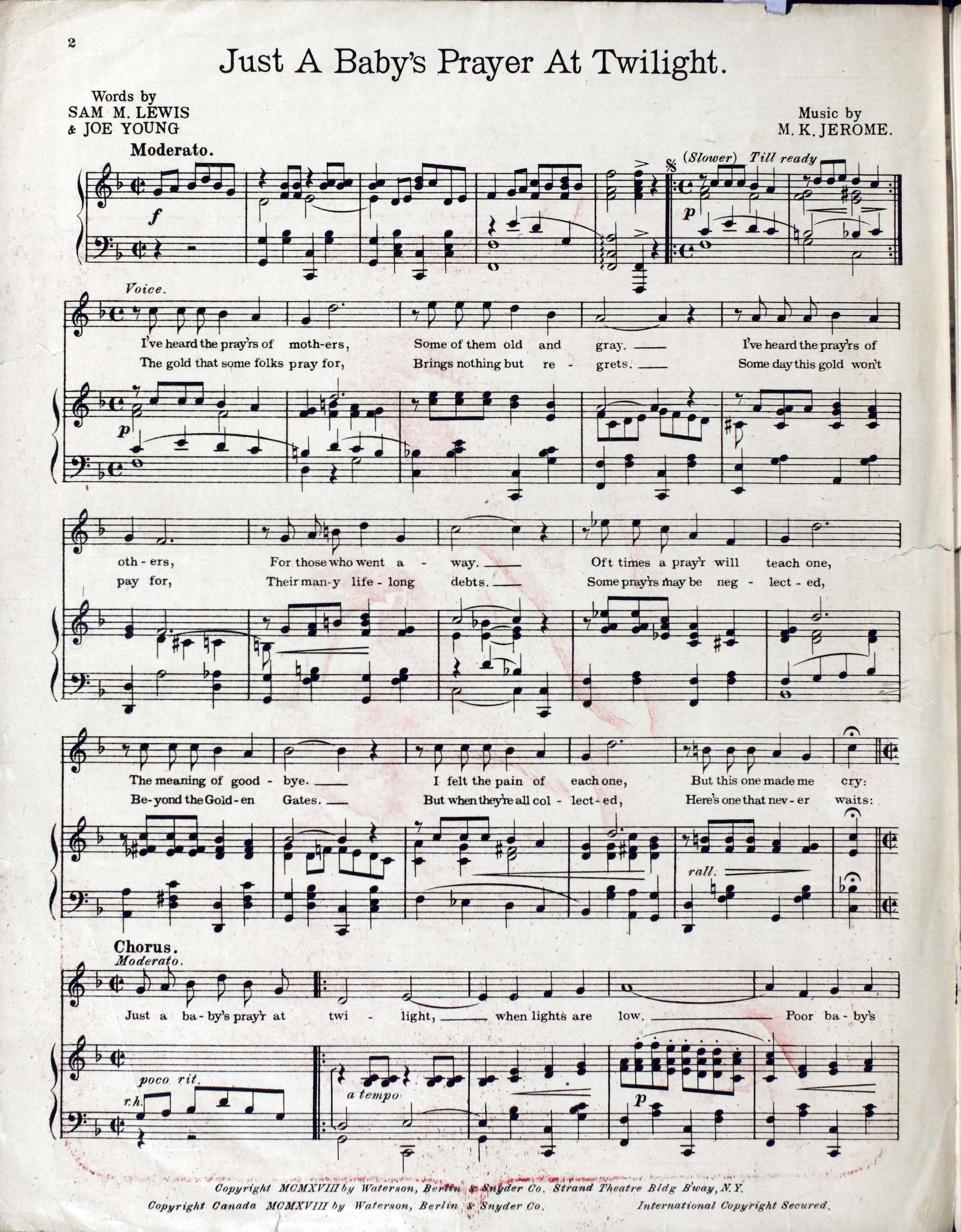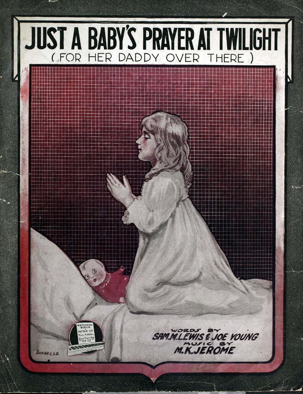 Jerome, M. K., 1893-1977. 2000. “Just a baby’s Prayer at Twilight : (for Her Daddy over There) Words by Sam. M. Lewis & Joe Young ; Music by M. K. Jerome”. New York (Strand Theatre Bldg., Broadway at 47th St.) : Waterson, Berlin & Snyder Co, World War I Sheet Music, accessed February 11, 2026, https://digitalexhibits.library.wustl.edu/s/wwimusic/item/36330