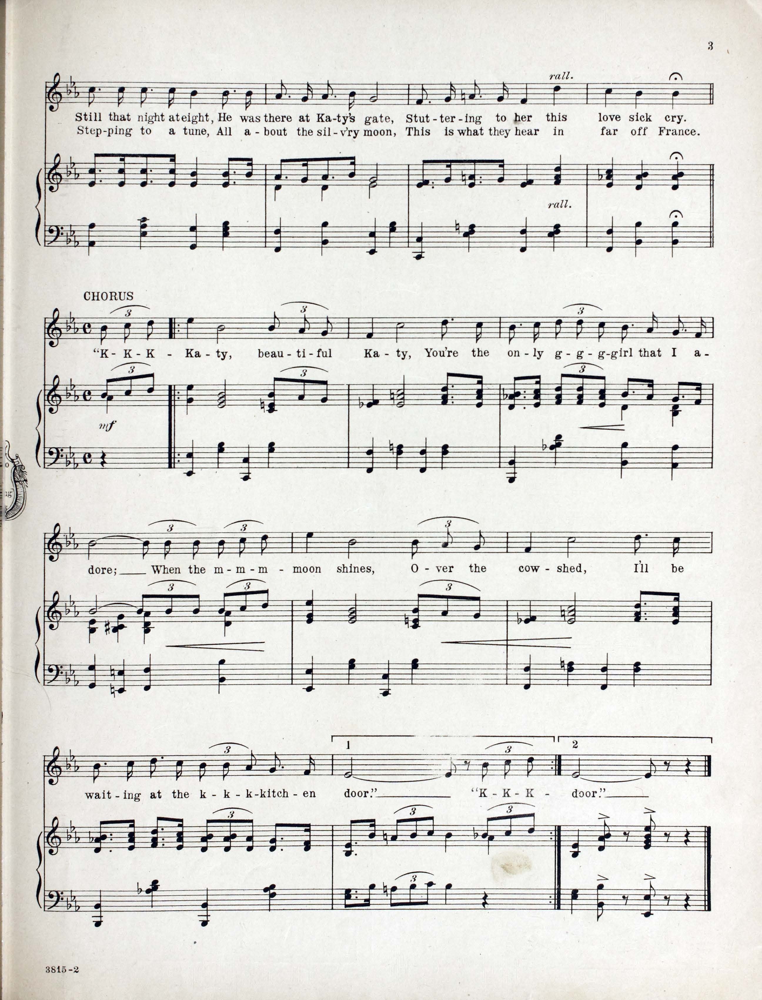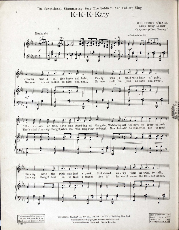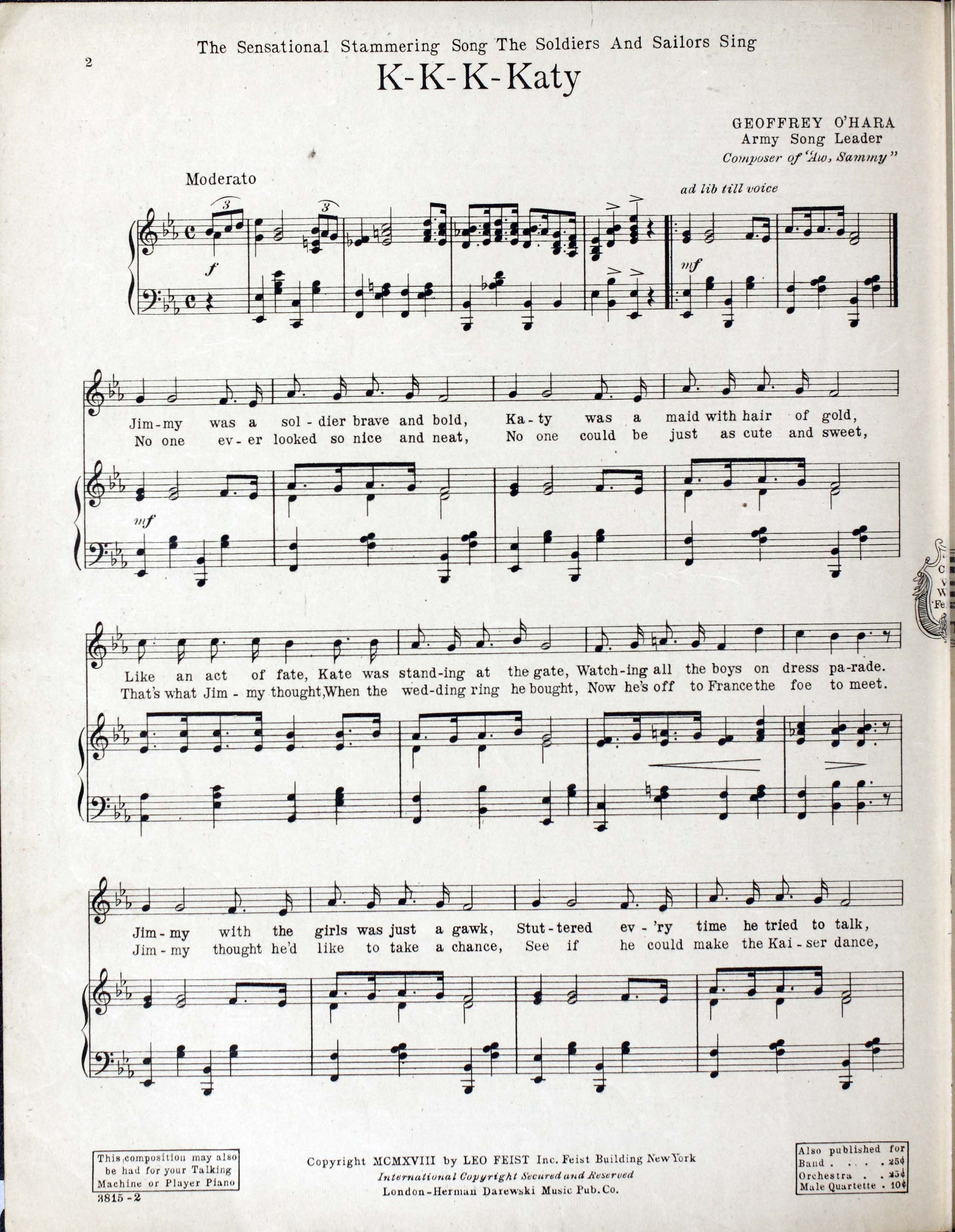 O’Hara, Geoffrey, 1882-1967. 2000. “K-K-K-Katy Geoffrey O’Hara, Army Song Leader, Composer of ‘Aw, Sammy’”. New York : Leo Feist, Inc, World War I Sheet Music, accessed February 11, 2026, https://digitalexhibits.library.wustl.edu/s/wwimusic/item/36331