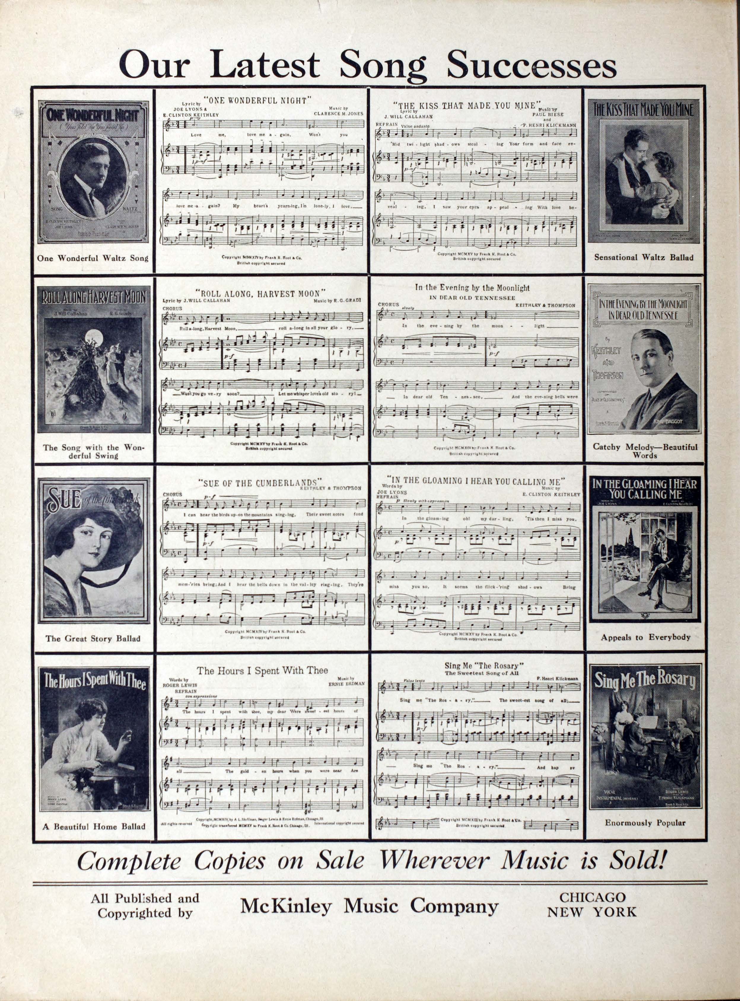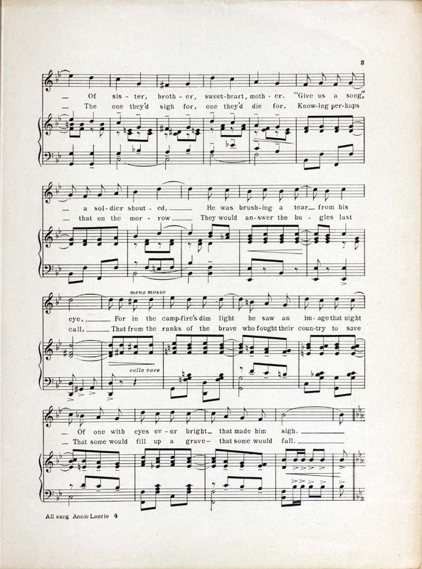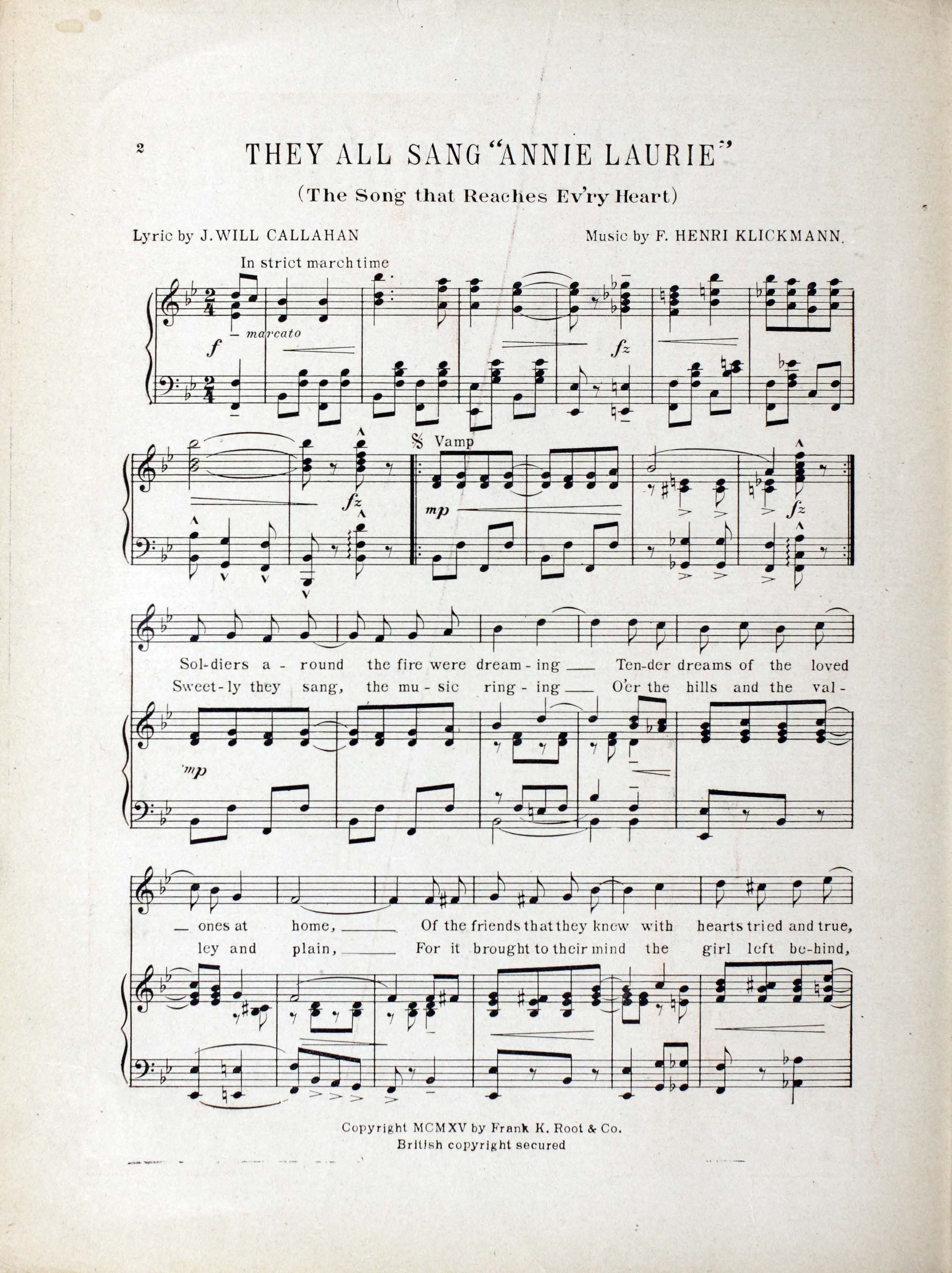 Klickmann, F. Henri (Frank Henri), 1885-1966. 2000. “They All Sang Annie Laurie Words by J. Will Callahan ; Music by F. Henri Klickmann”. Chicago : Frank K. Root & Co, World War I Sheet Music, accessed April 3, 2026, https://digitalexhibits.library.wustl.edu/s/wwimusic/item/36334