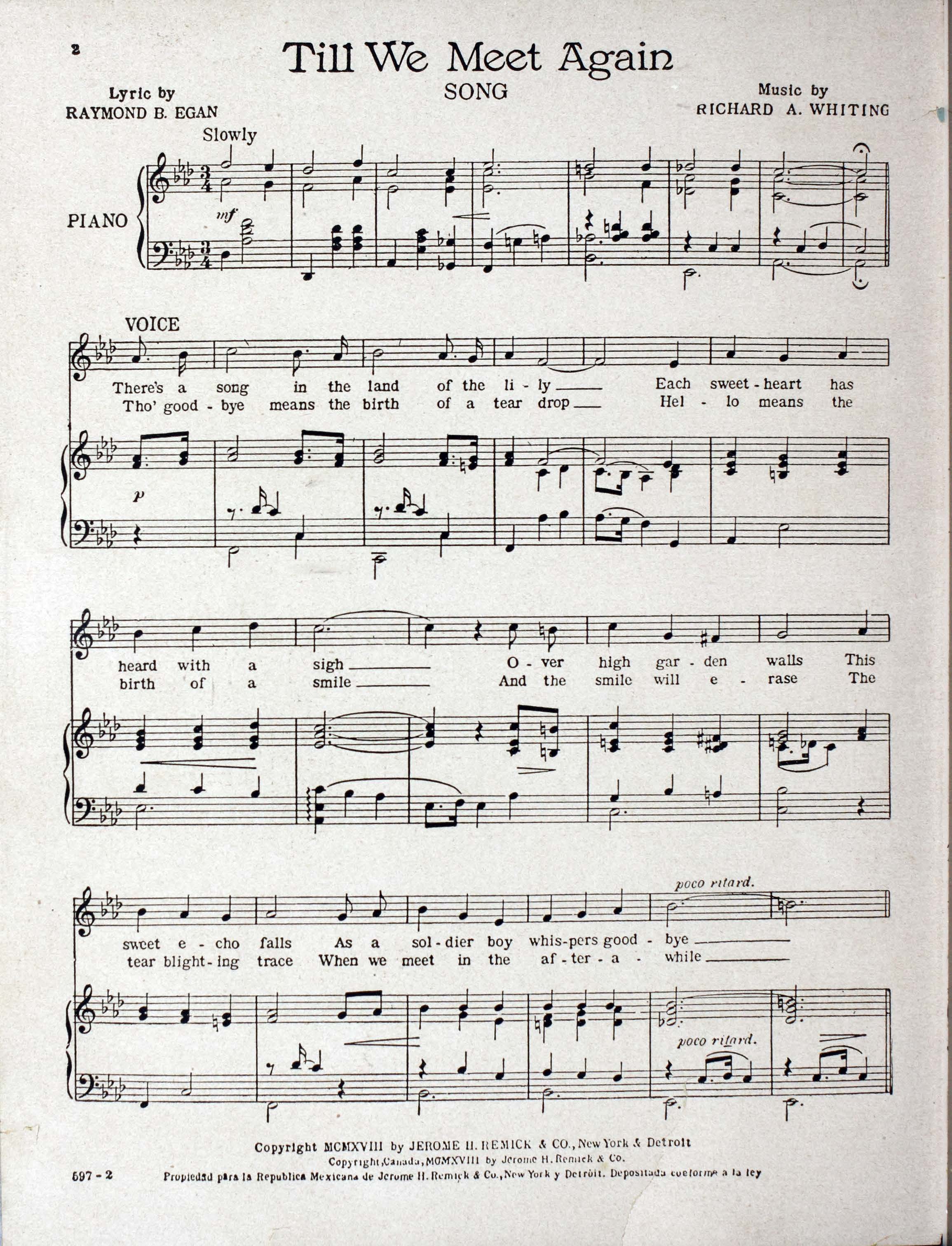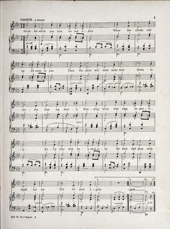 Whiting, Richard A., 1891-1938. 2000. “Till We Meet Again : Song Lyric by Raymond B. Egan ; Music by Richard A. Whiting”. Detroit : Jerome H. Remick & Co, World War I Sheet Music, accessed February 11, 2026, https://digitalexhibits.library.wustl.edu/s/wwimusic/item/36337