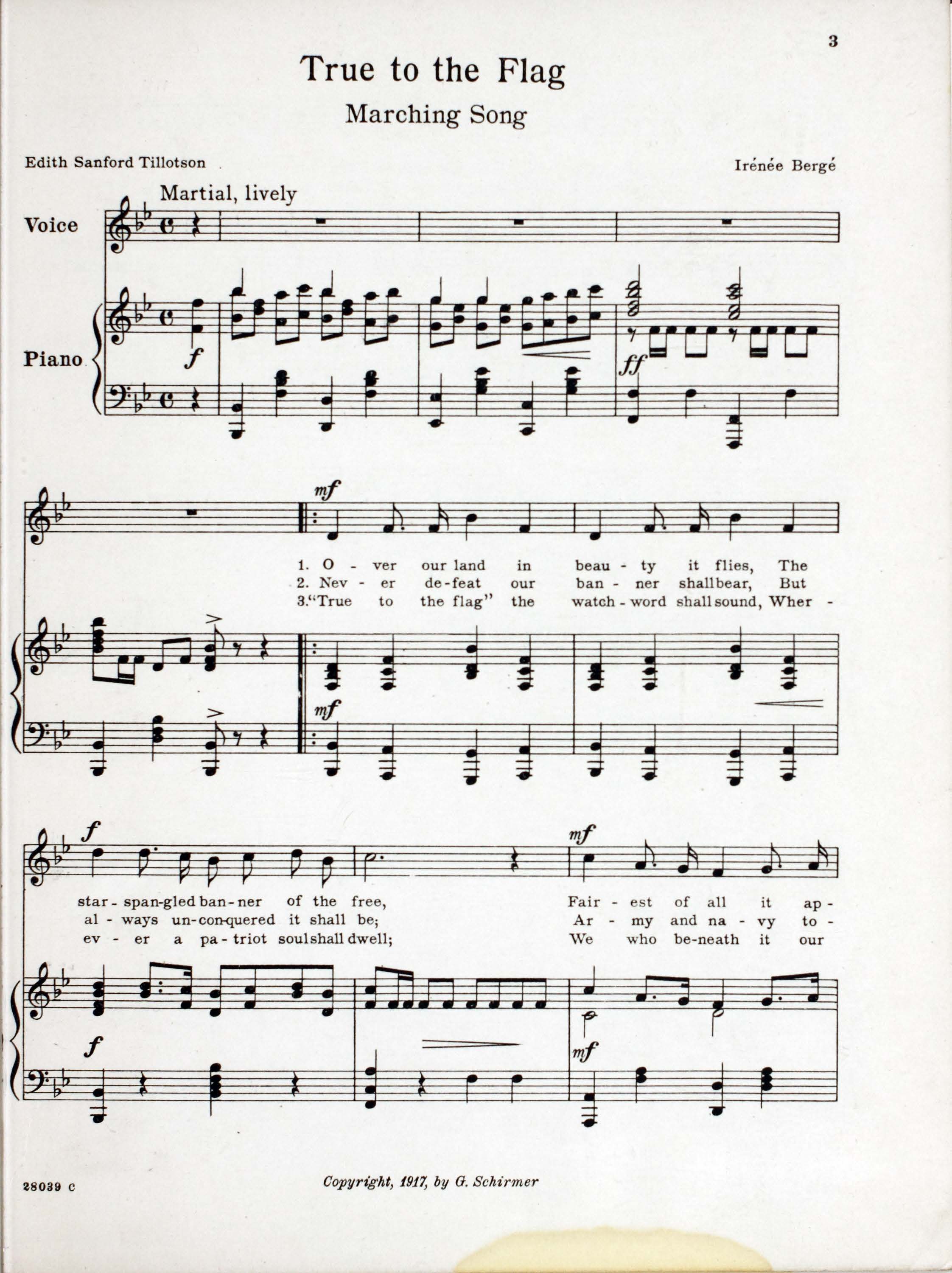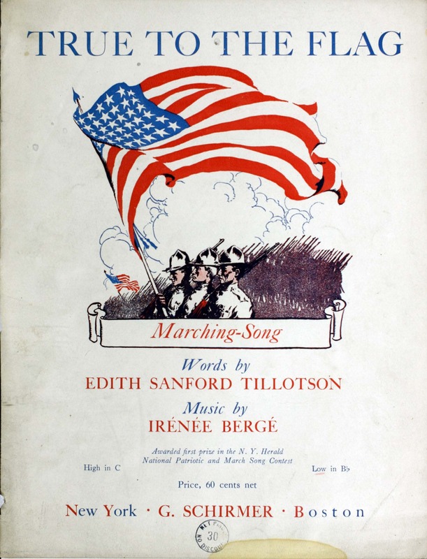 - True to the flag : marching-song / words by Edith Sanford Tillotson ; music by Irénée Bergé.