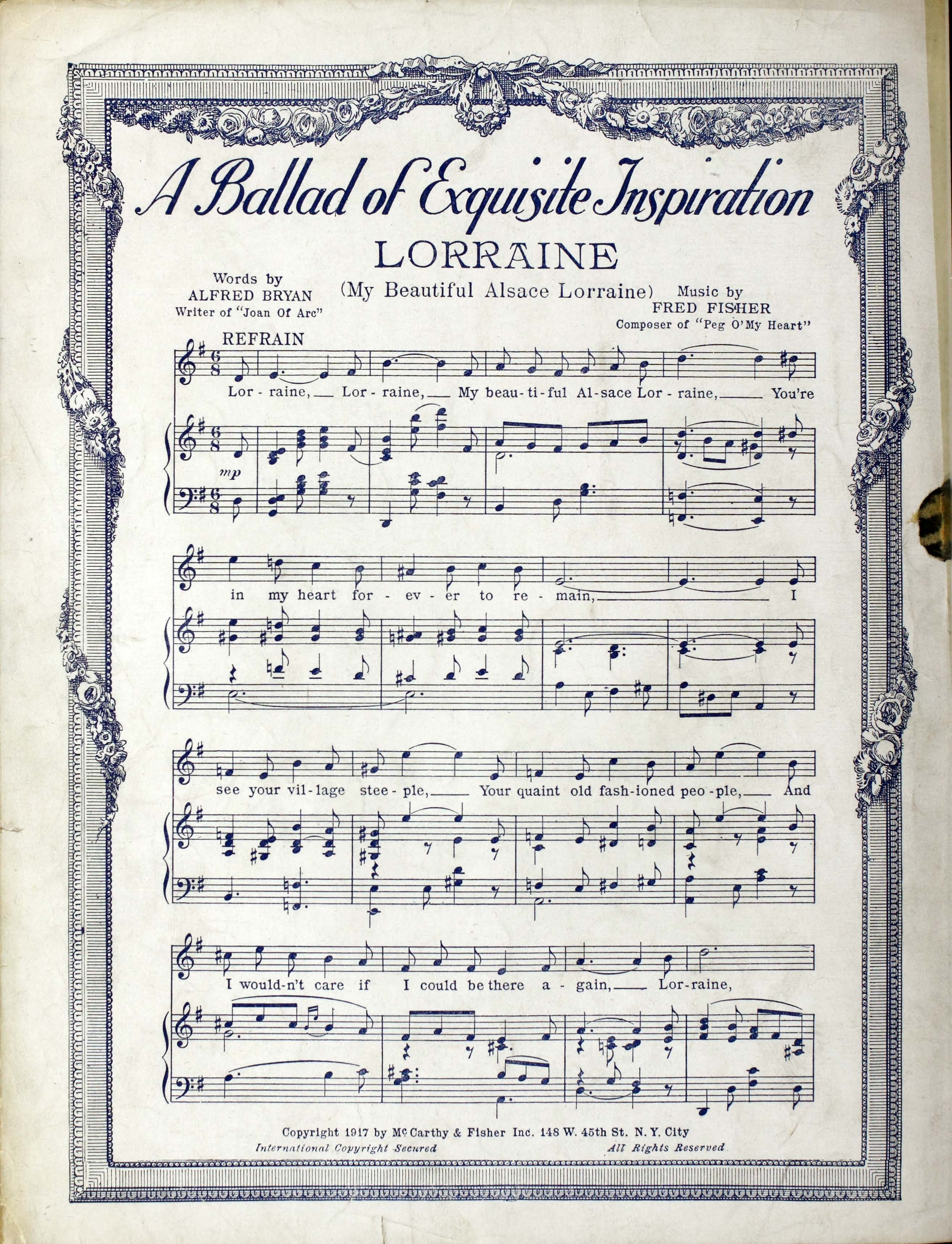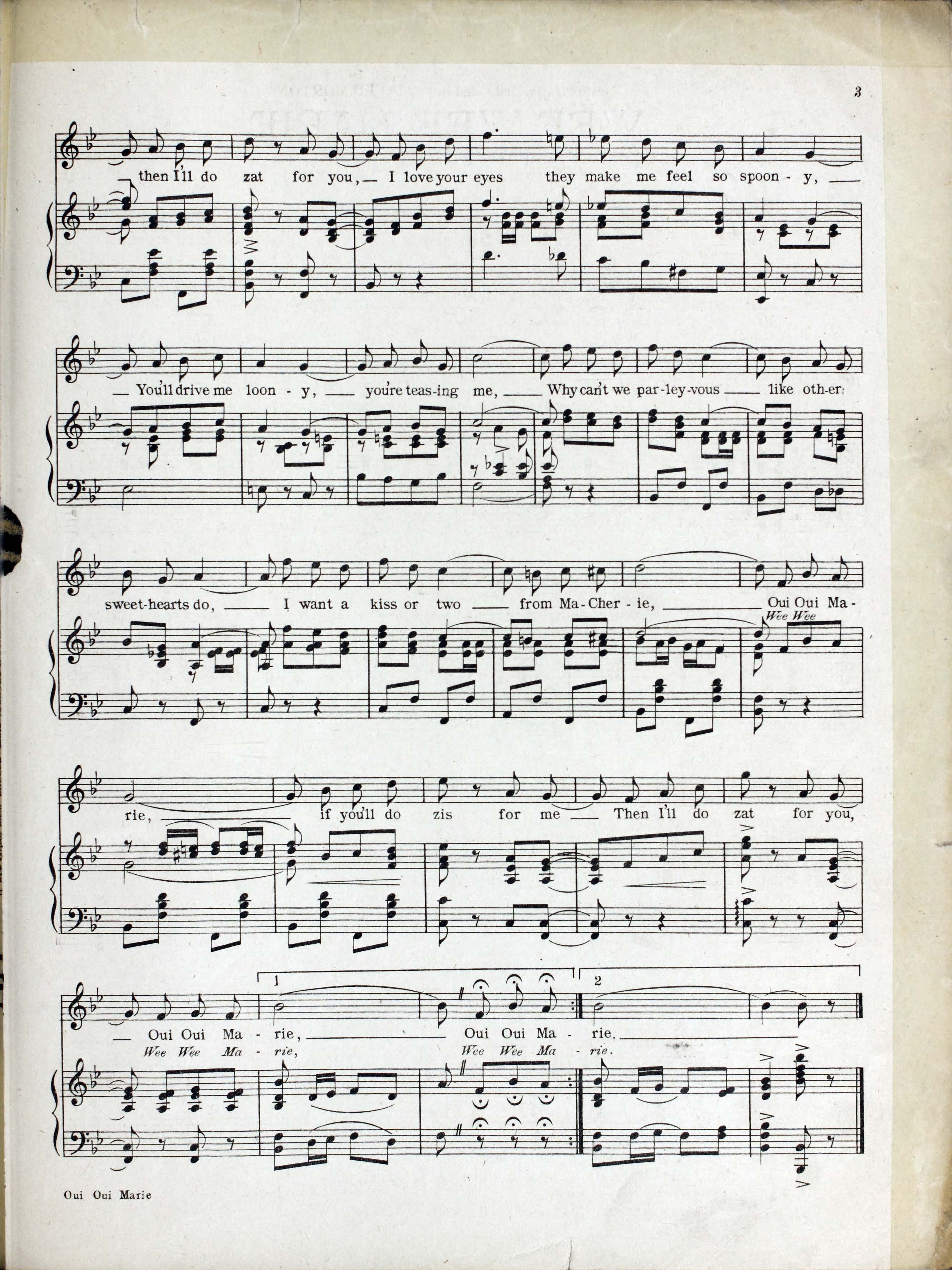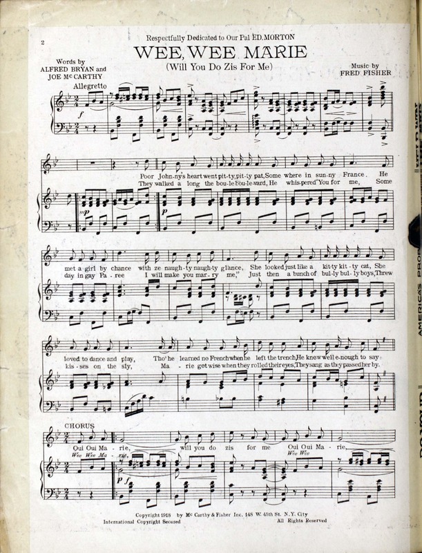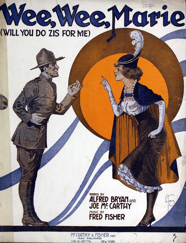 Fisher, Fred, 1875-1942. 2000. “Wee, Wee, Marie : (will You Do Zis for Me) Words by Alfred Bryan and Joe McCarthy ; Music by Fred Fisher”. New York (148 W. 45th St.) : McCarthy and Fisher, Inc, World War I Sheet Music, accessed February 11, 2026, https://digitalexhibits.library.wustl.edu/s/wwimusic/item/36346