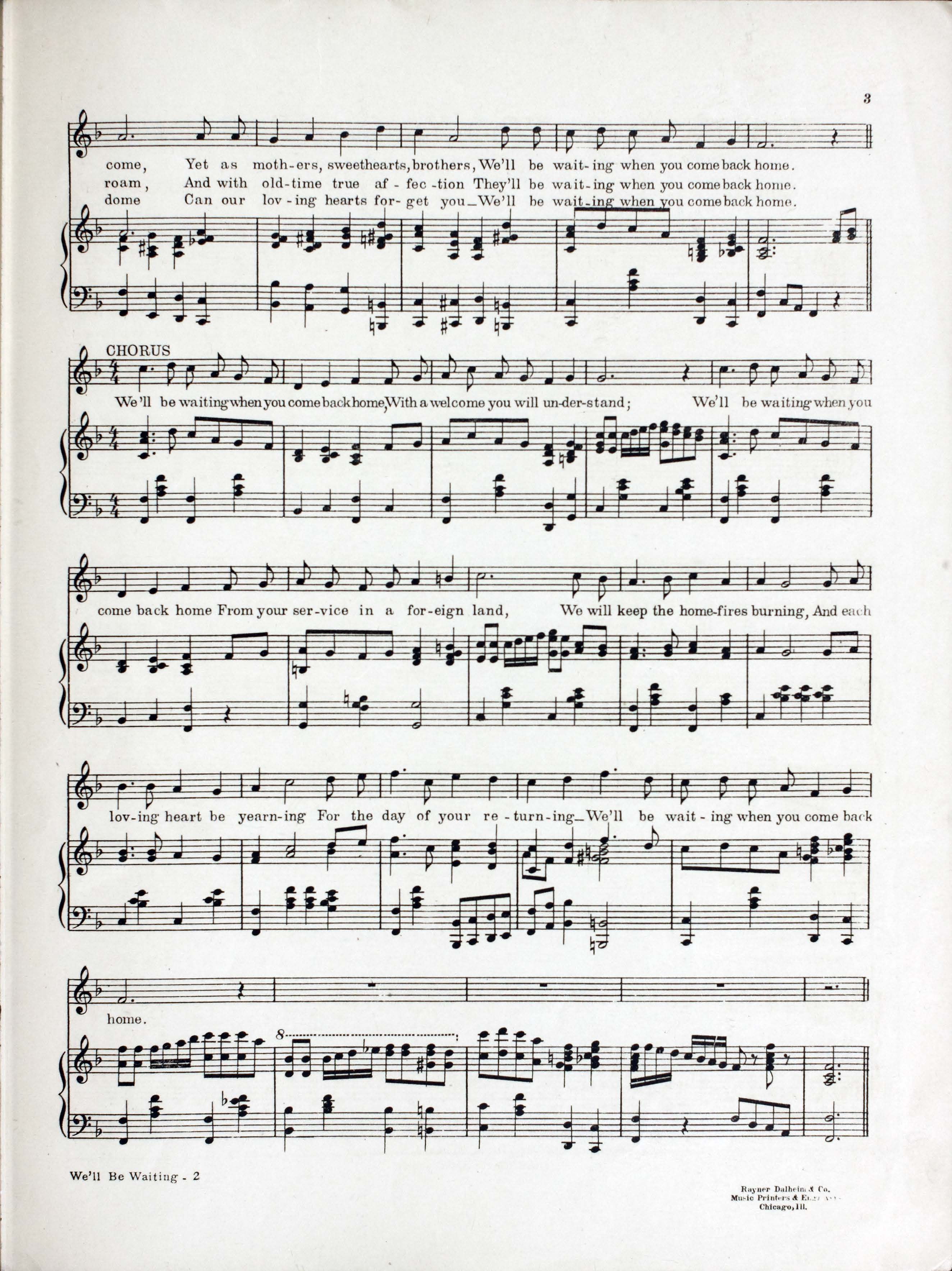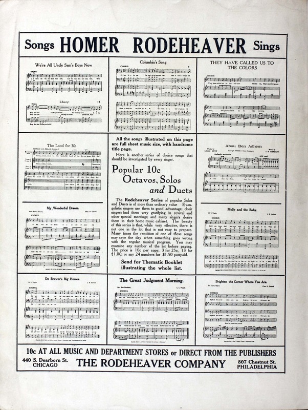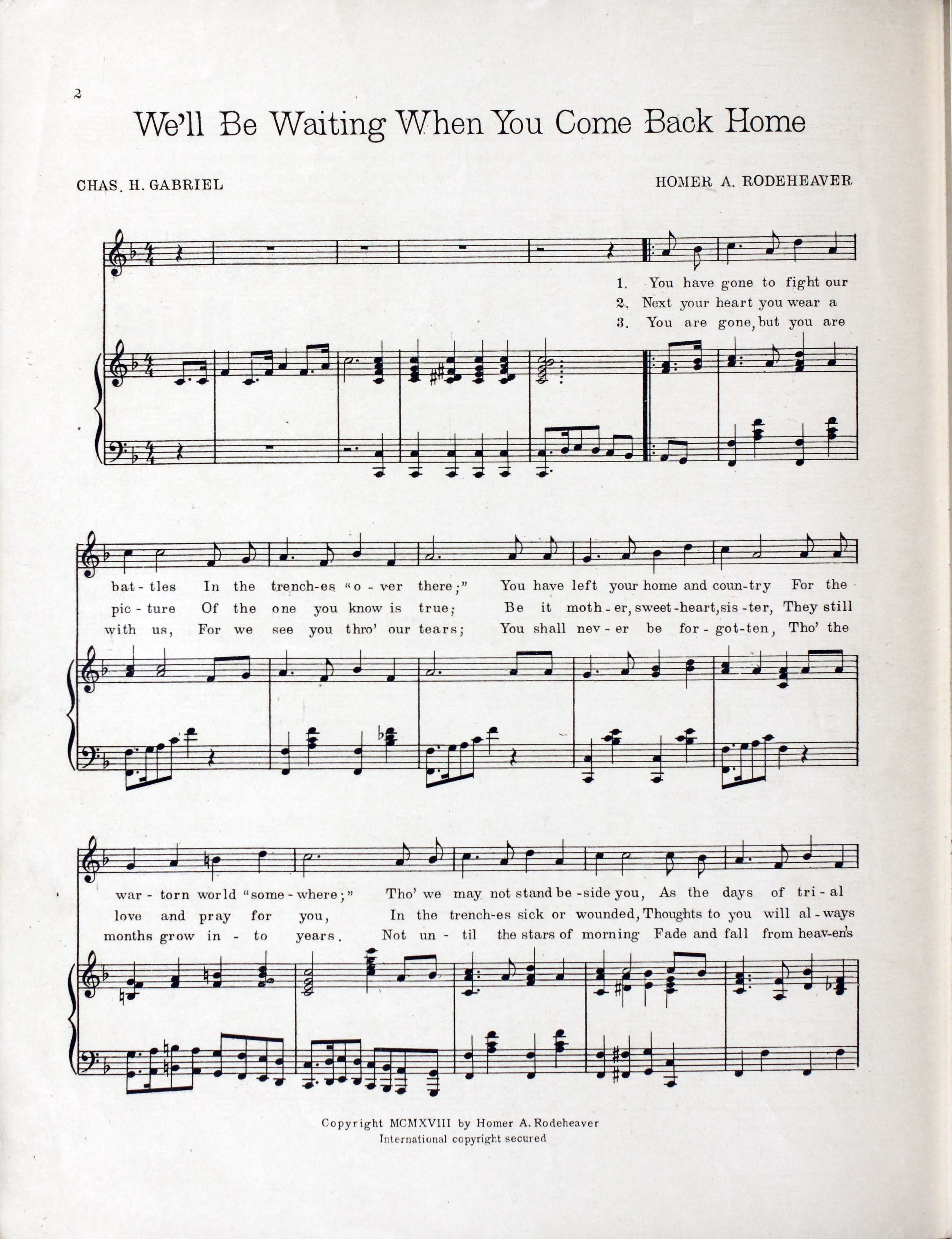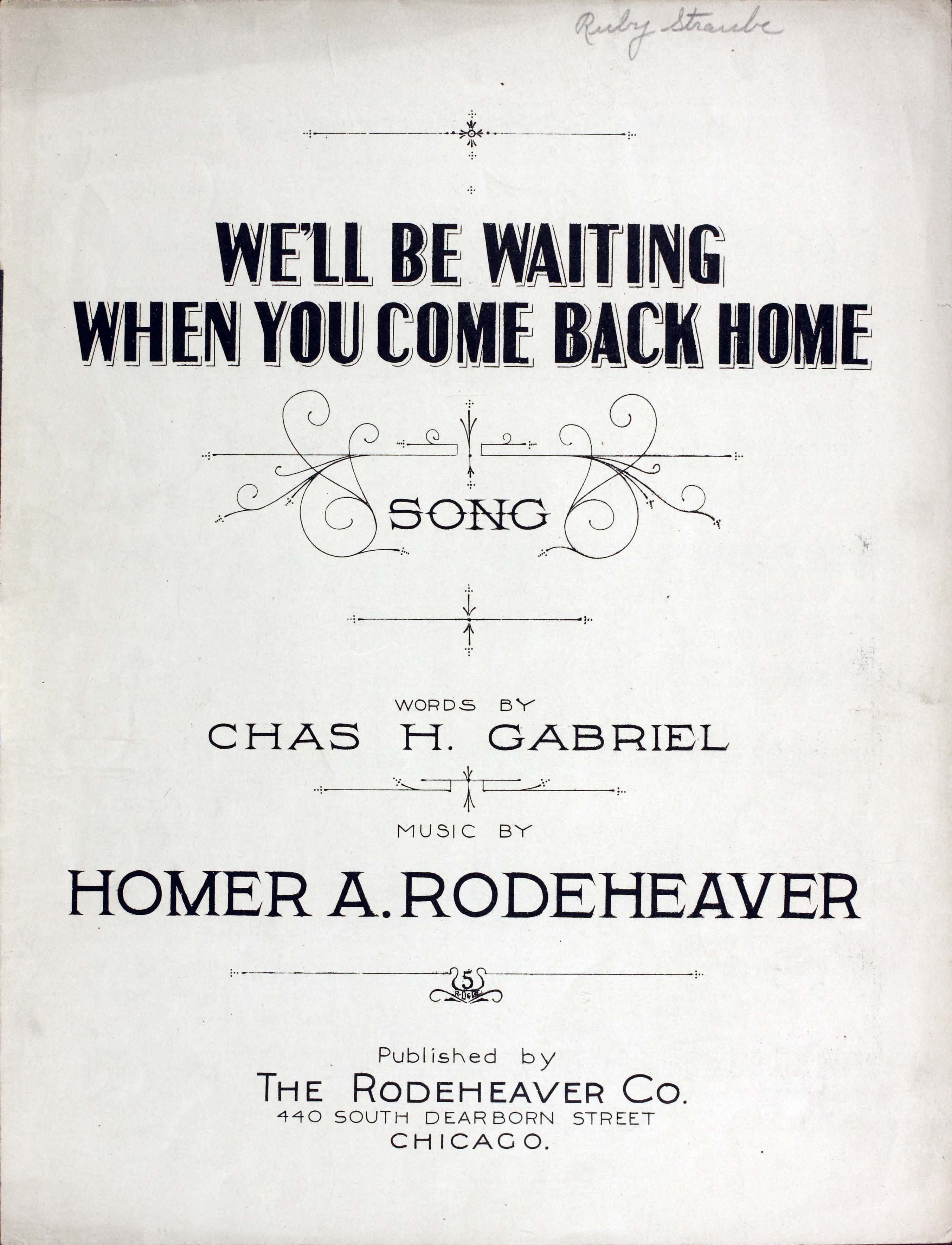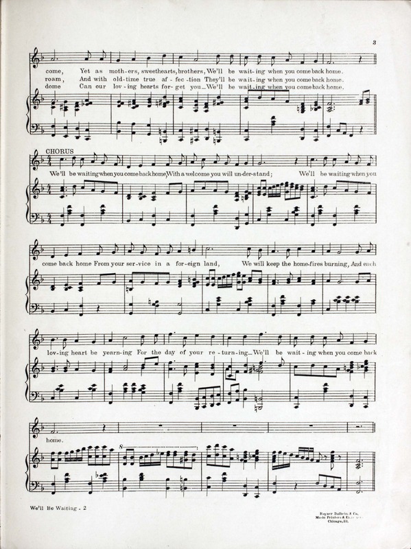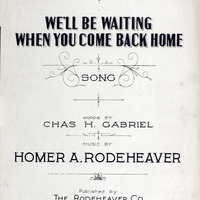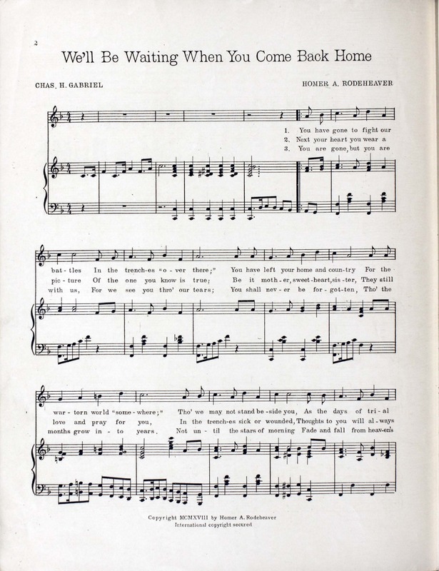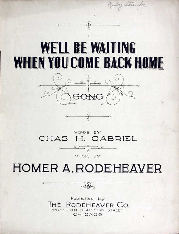 Rodeheaver, Homer A. (Homer Alvan), 1880-1955. 2000. “We’ll Be Waiting When You Come Back Home : Song Words by Chas. H. Gabriel ; Music by Homer A. Rodeheaver”. Chicago (440 South Dearborn Street) : published by the Rodeheaver Co, World War I Sheet Music, accessed February 11, 2026, https://digitalexhibits.library.wustl.edu/s/wwimusic/item/36347