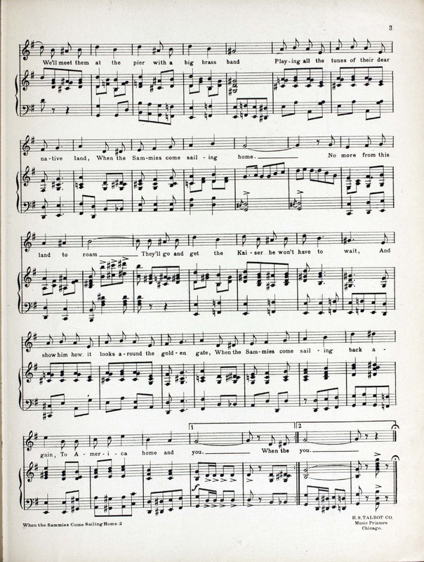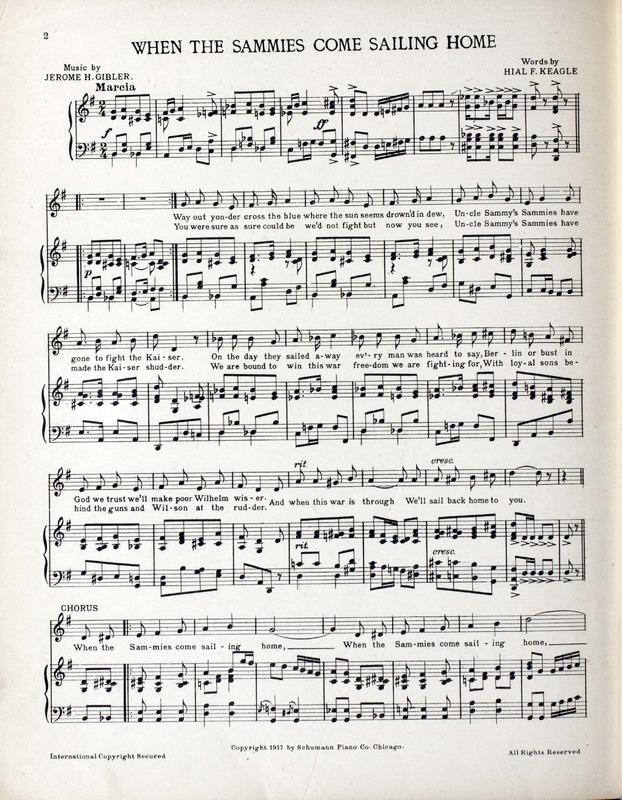 Gibler, Jerome H. 2000. “When the Sammies Come Sailing Home Words by Hial F. Keagle With the 122d Artillery ; Arranged by Bob Gibler ; Music by Jerome H. Gibler”. Chicago : published by Schumann Piano Co, World War I Sheet Music, accessed February 11, 2026, https://digitalexhibits.library.wustl.edu/s/wwimusic/item/36352