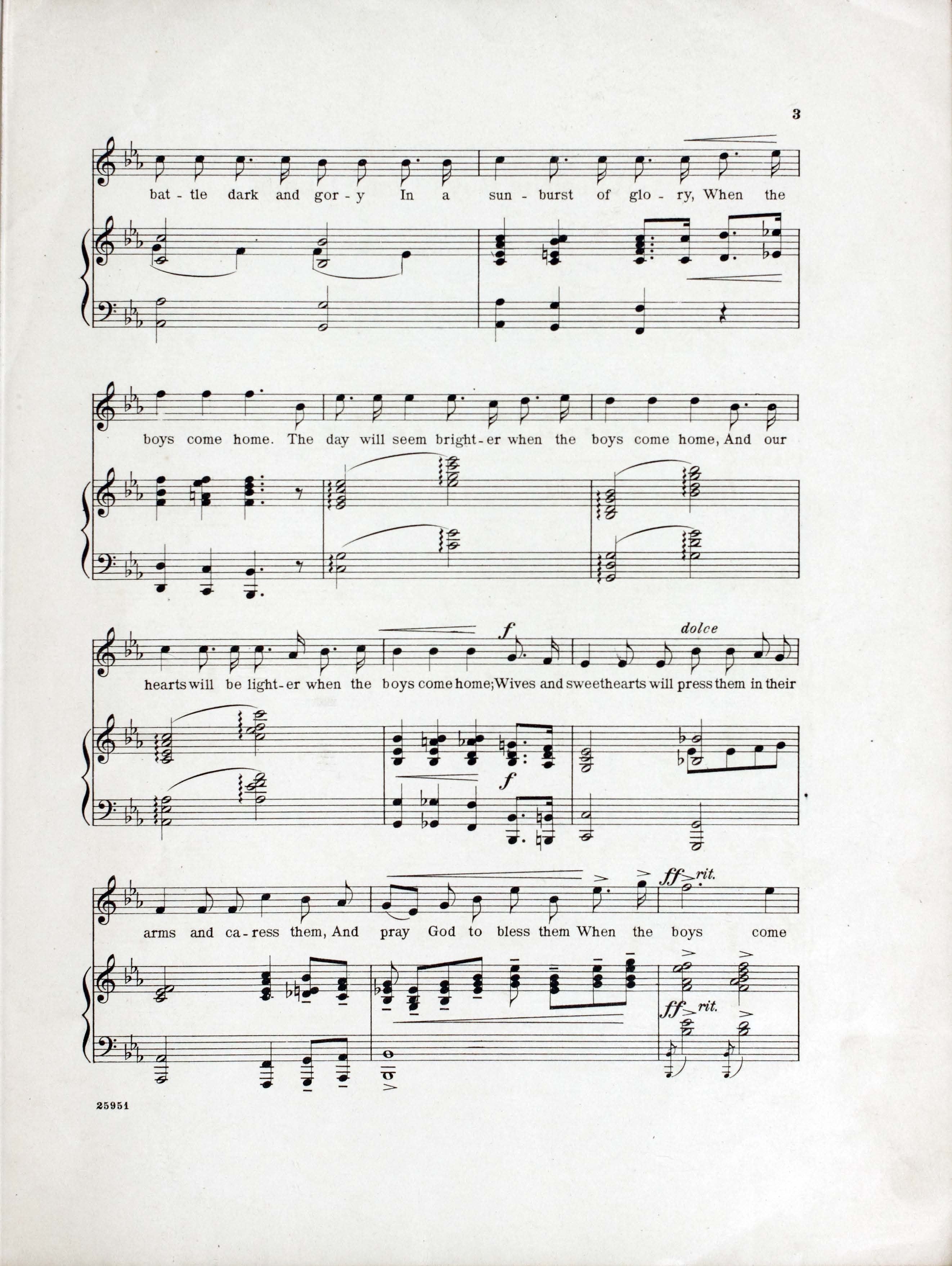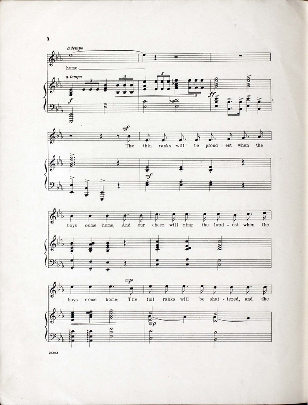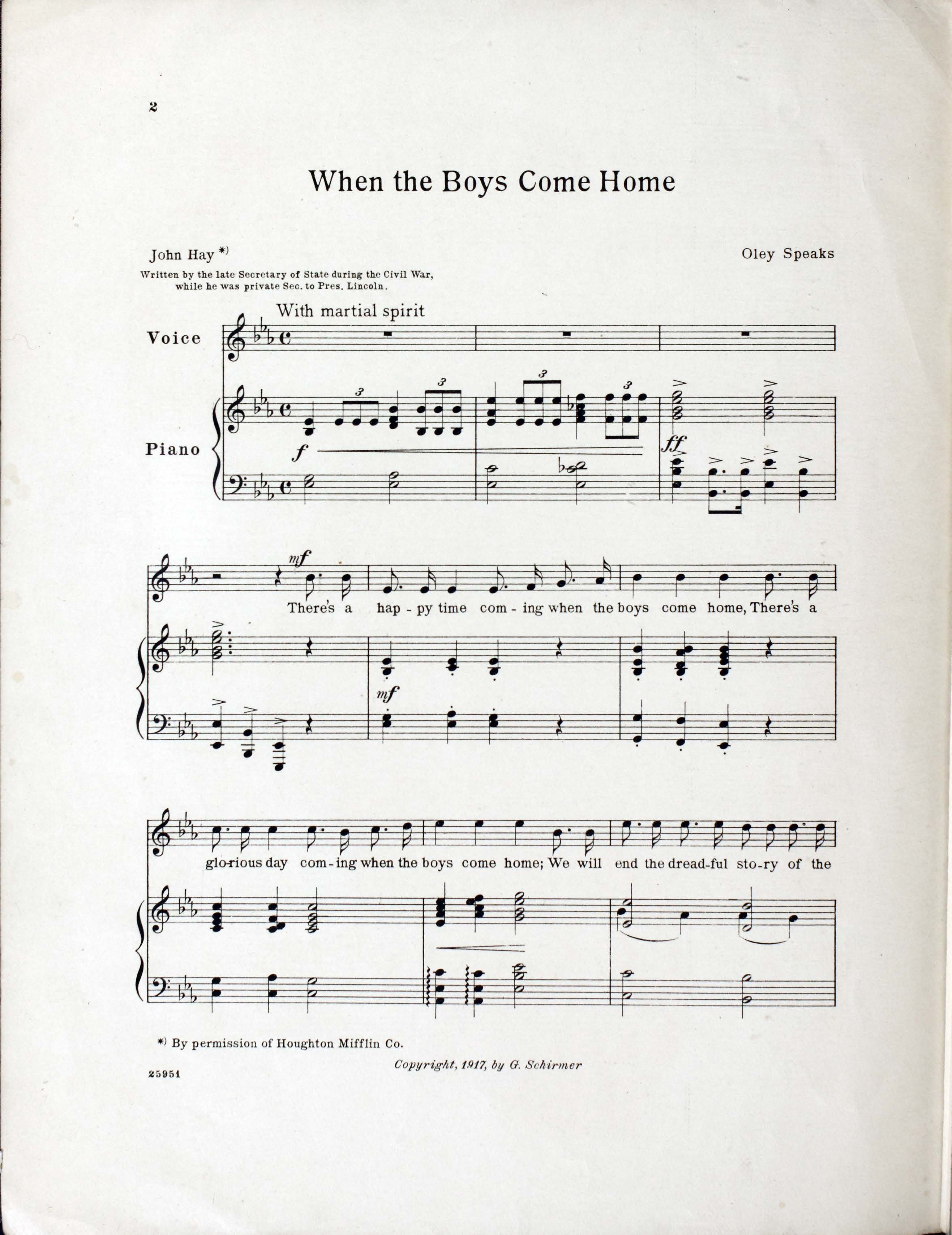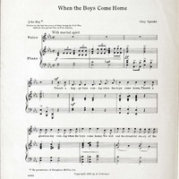 Speaks, Oley, 1876-1948. 2000. “When the Boys Come Home Words by John Hay ; Music by Oley Speaks”. New York : G. Schirmer, World War I Sheet Music, accessed February 11, 2026, https://digitalexhibits.library.wustl.edu/s/wwimusic/item/36353