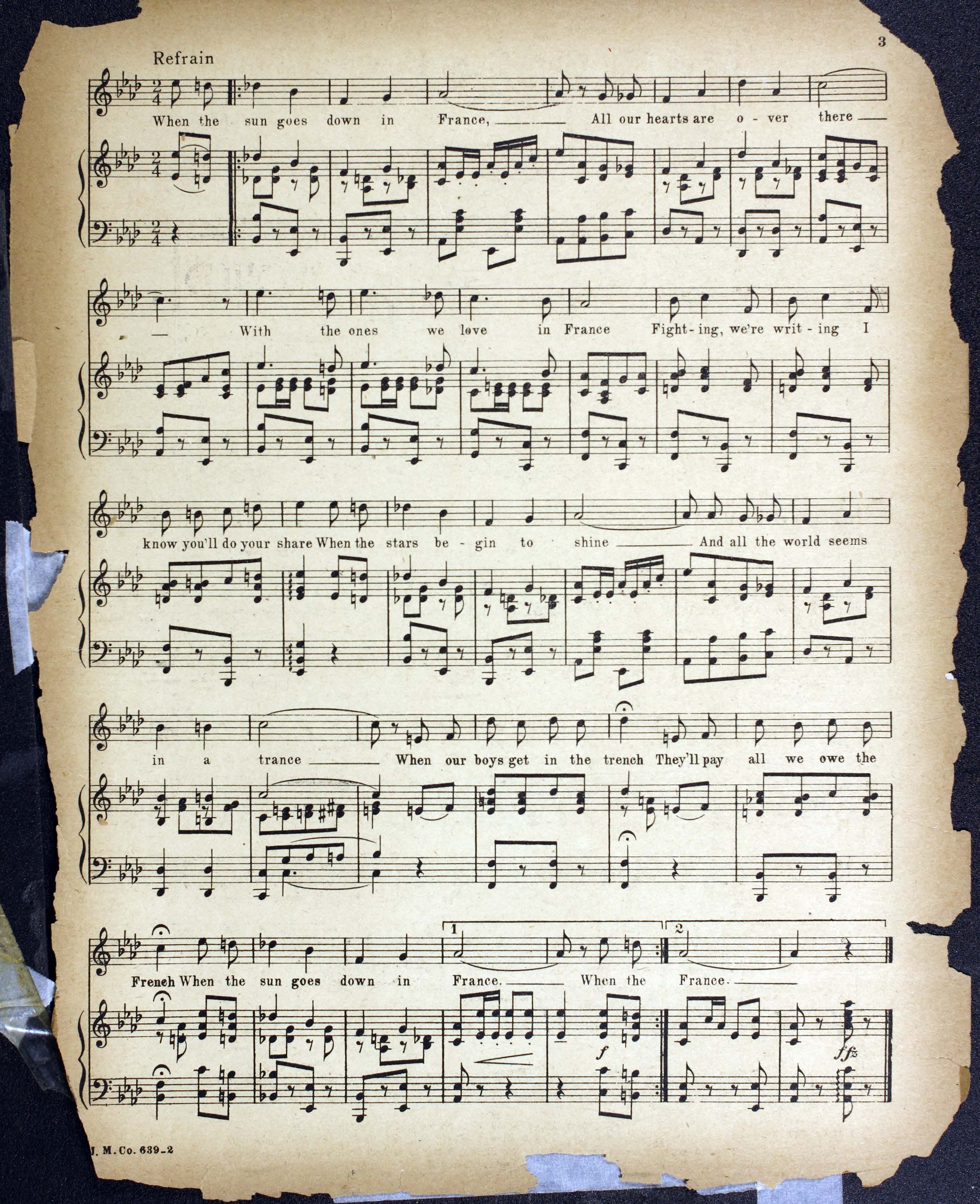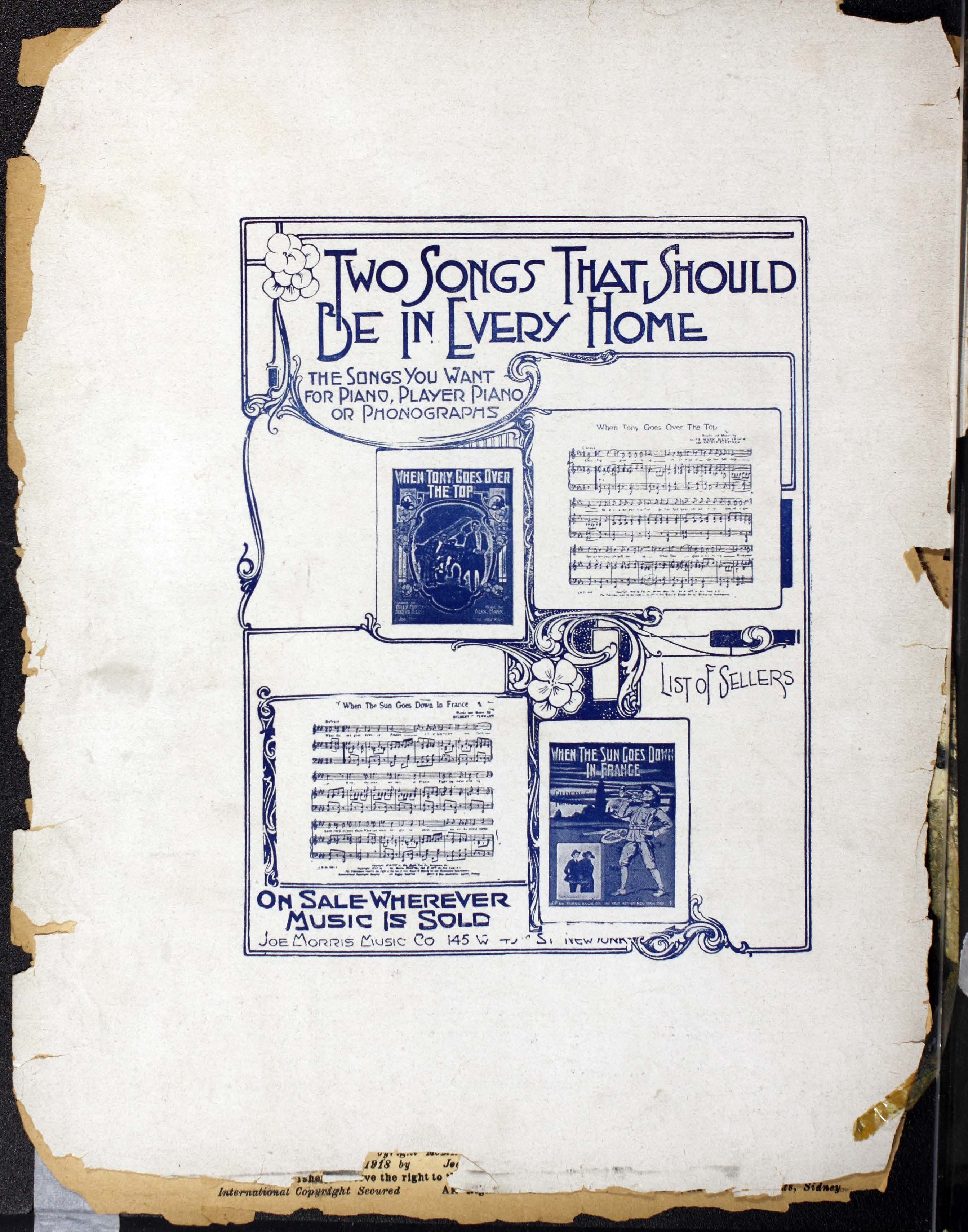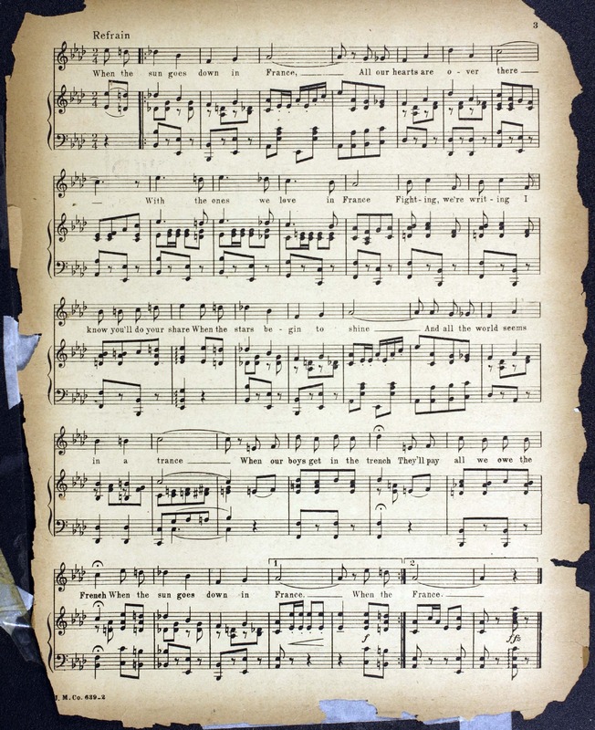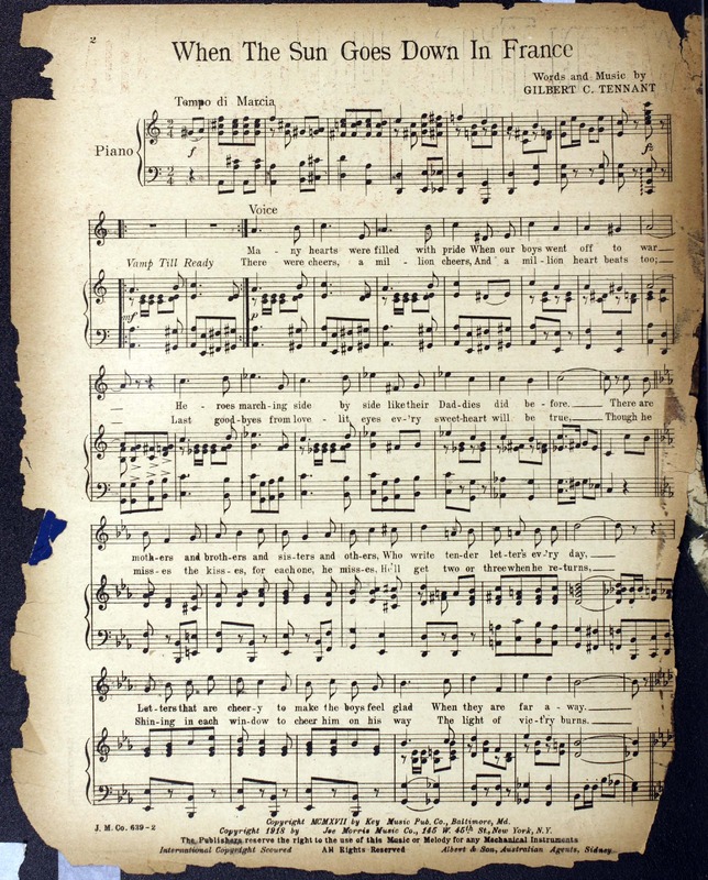 Tennant, Gilbert C. “When the Sun Goes down in France Words and Music by Gilbert C. Tennant”. New York City (145 West 45th St) : Joe Morris Music Co, World War I Sheet Music, accessed February 12, 2026, https://digitalexhibits.library.wustl.edu/s/wwimusic/item/36354