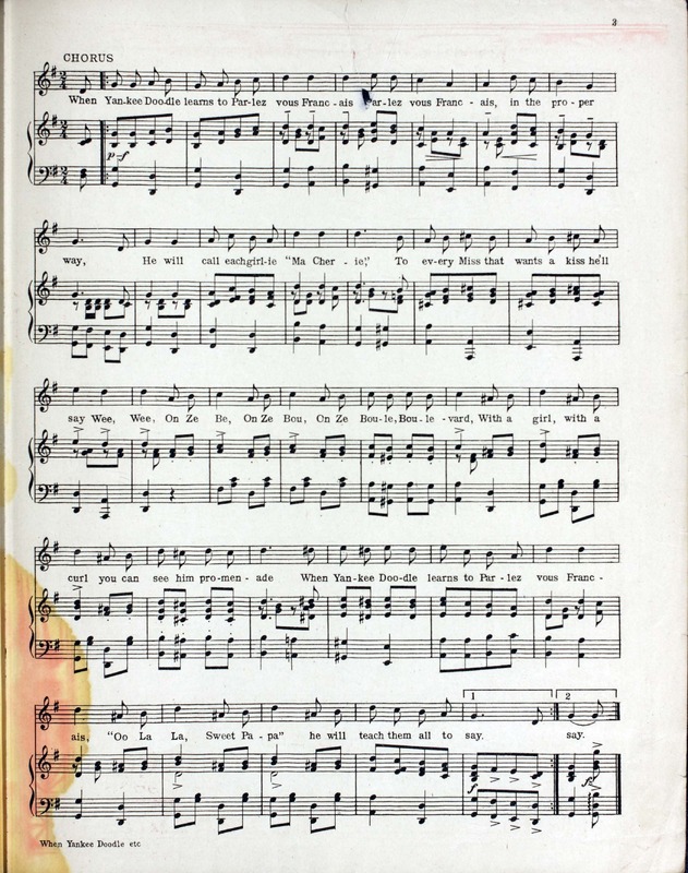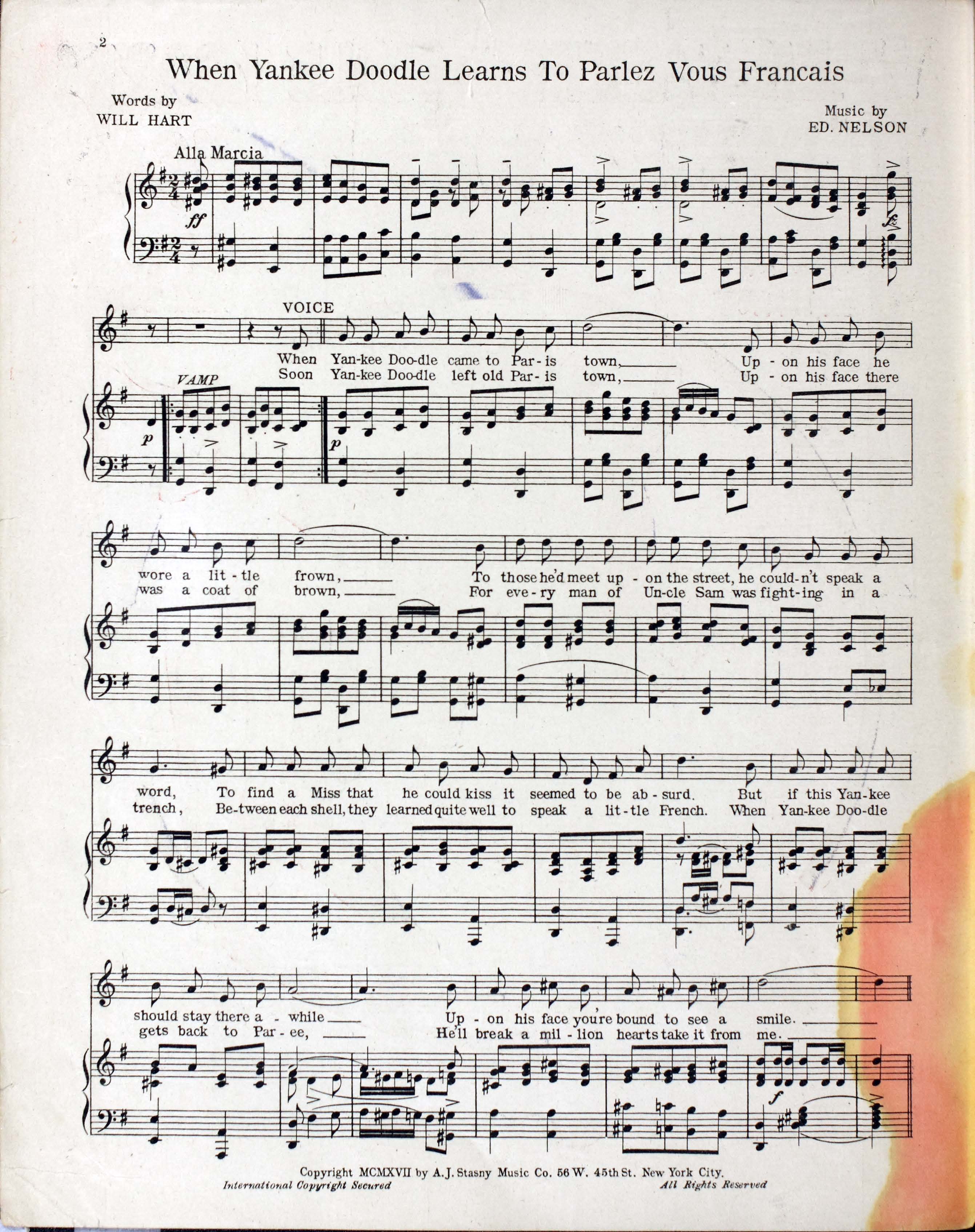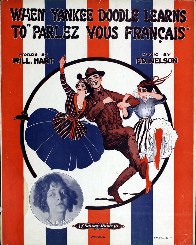 Nelson, Ed, 1885-1969. 2000. “When Yankee Doodle Learns to ‘Parlez Vous français’ Words by Will Hart ; Music by Ed Nelson”. New York : A.J. Stasny Music Co, World War I Sheet Music, accessed February 11, 2026, https://digitalexhibits.library.wustl.edu/s/wwimusic/item/36358