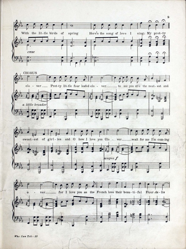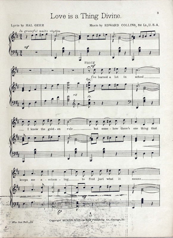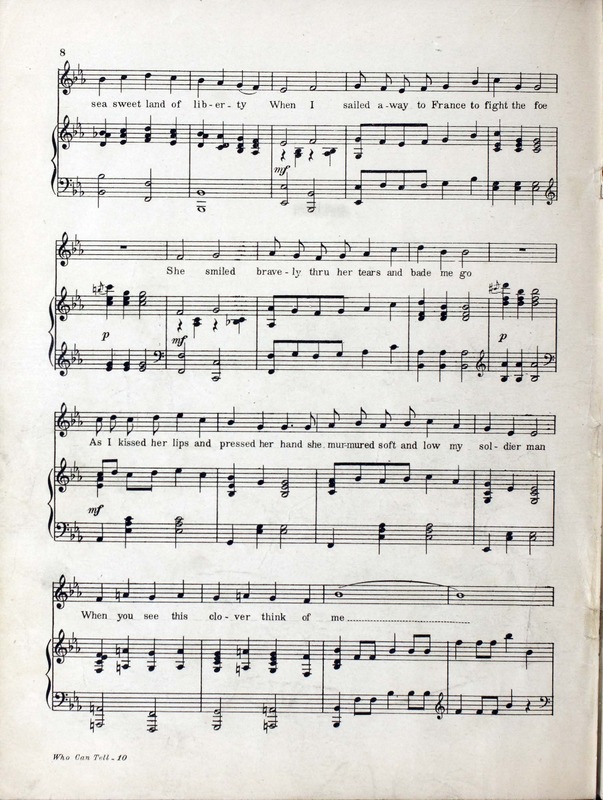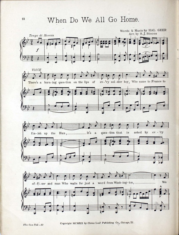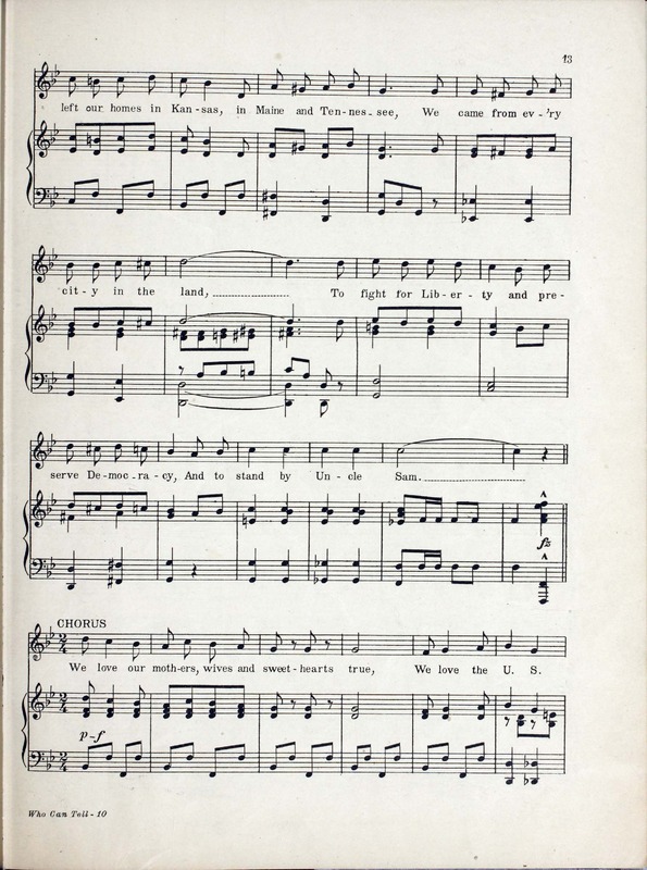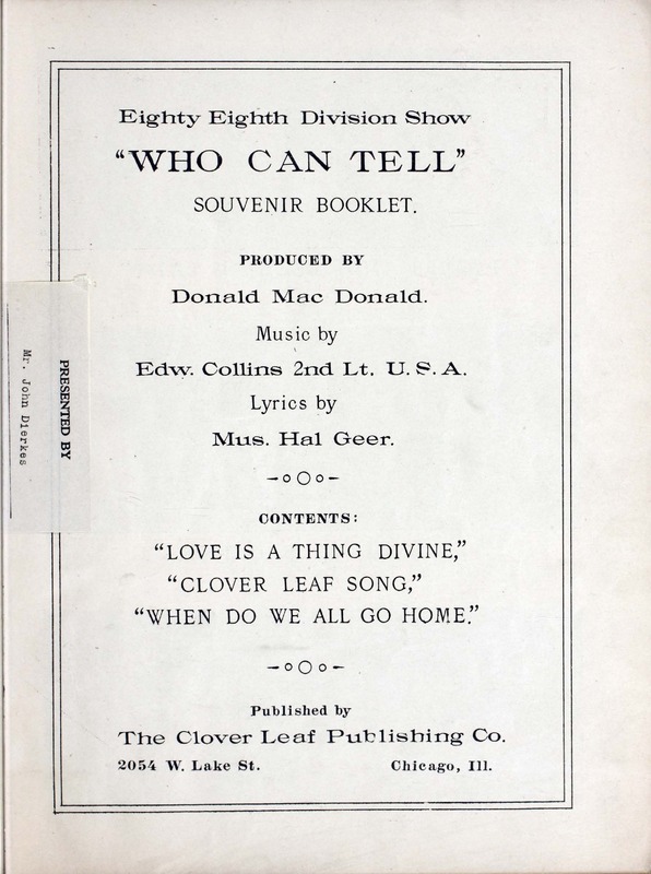 Collins, Edward Joseph, 1889-1951. 2000. “Who Can Tell : Eighty Eighth Division Show : Souvenir Booklet Produced by Donald MacDonald ; Music by Edw. Collins, 2nd Lt. U.S.A. ; Lyrics by Mus. Hal Geer”. Chicago, Ill. (2054 W. Lake St.) : published by The Clover Leaf Publishing Co, World War I Sheet Music, accessed February 11, 2026, https://digitalexhibits.library.wustl.edu/s/wwimusic/item/36360