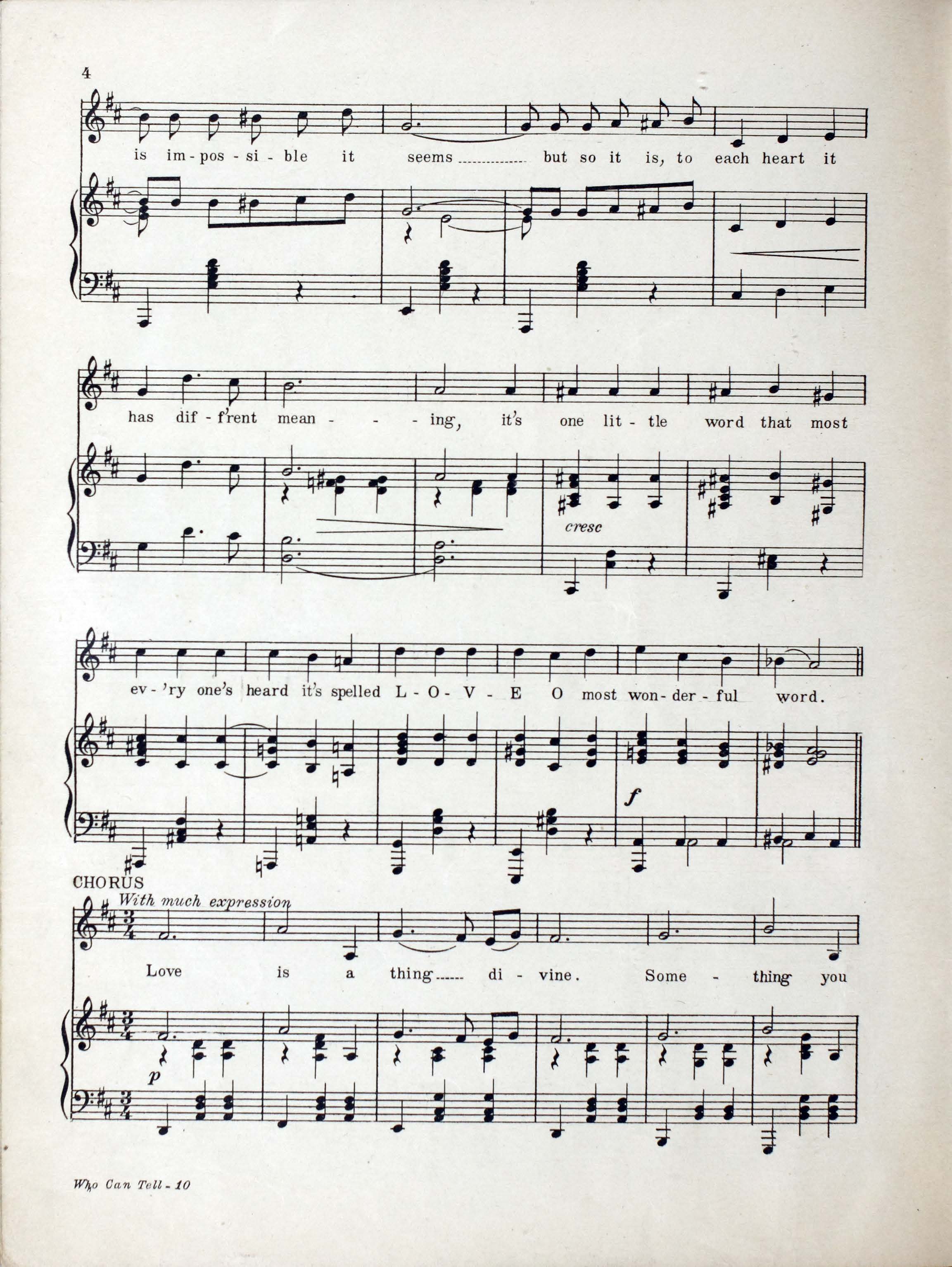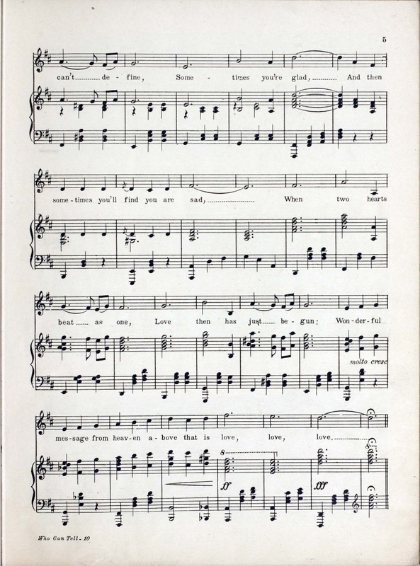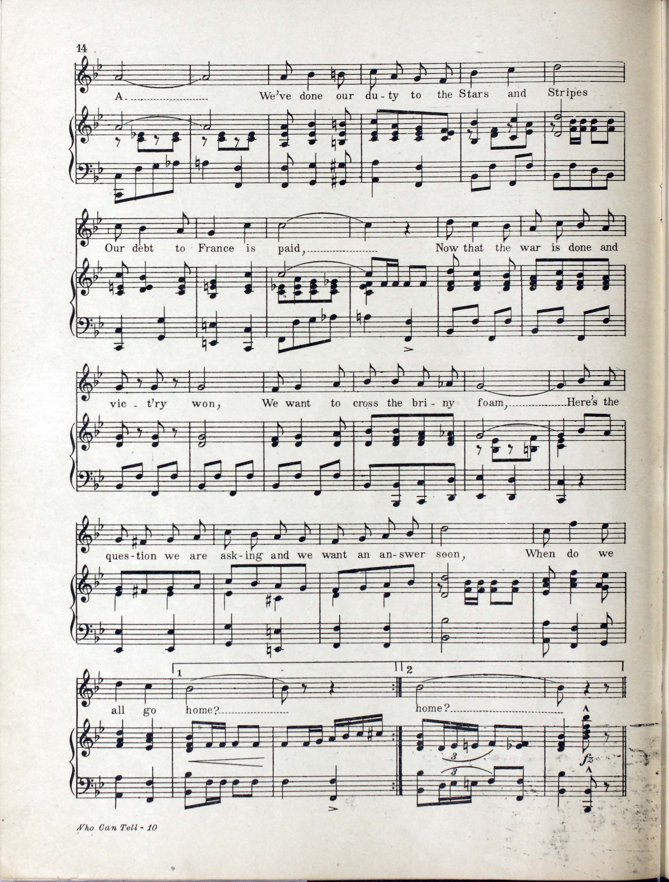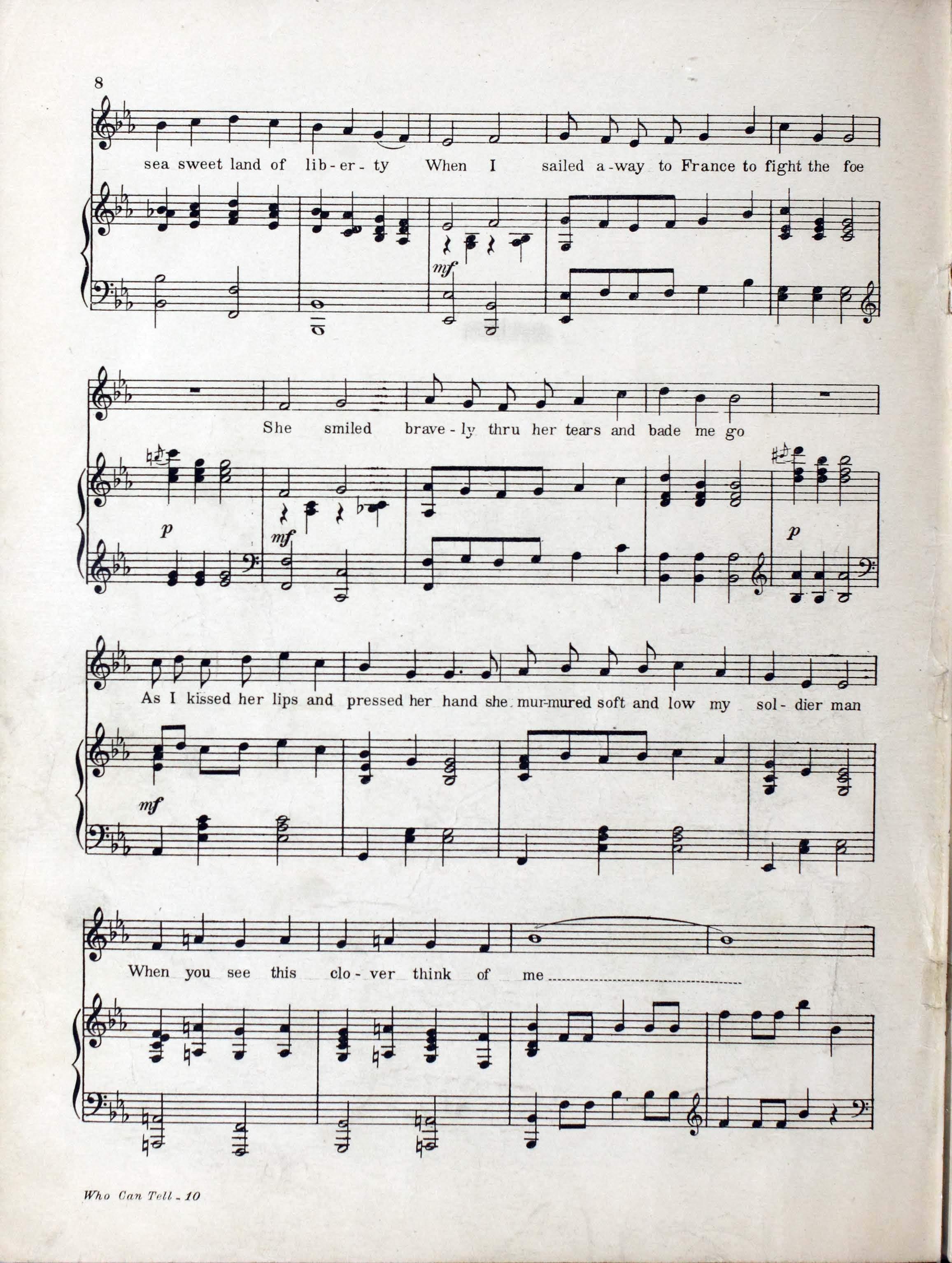Collins, Edward Joseph, 1889-1951. 2000. “Who Can Tell : Eighty Eighth Division Show : Souvenir Booklet Produced by Donald MacDonald ; Music by Edw. Collins, 2nd Lt. U.S.A. ; Lyrics by Mus. Hal Geer”. Chicago, Ill. (2054 W. Lake St.) : published by The Clover Leaf Publishing Co, World War I Sheet Music, accessed February 11, 2026, https://digitalexhibits.library.wustl.edu/s/wwimusic/item/36360