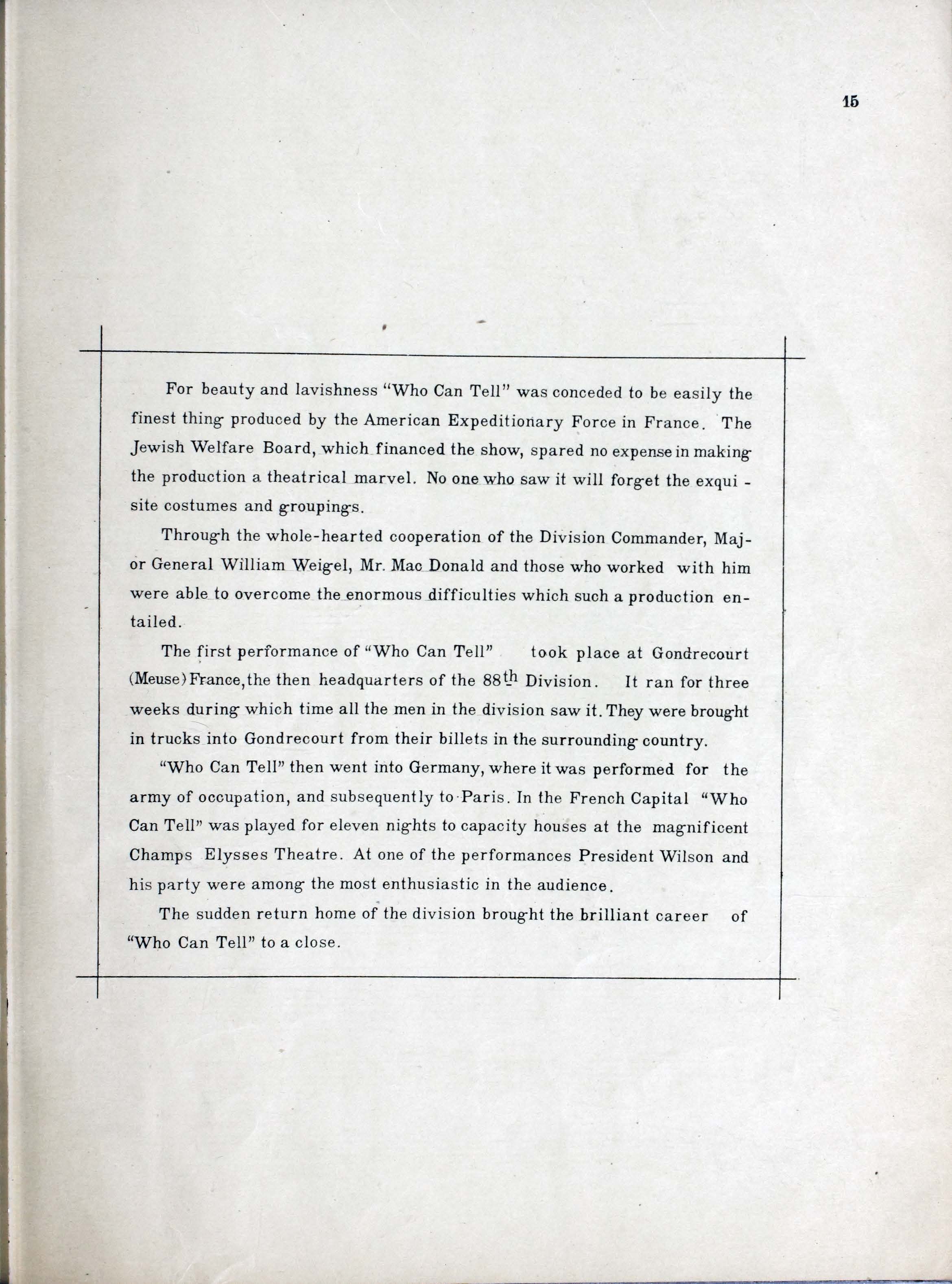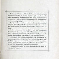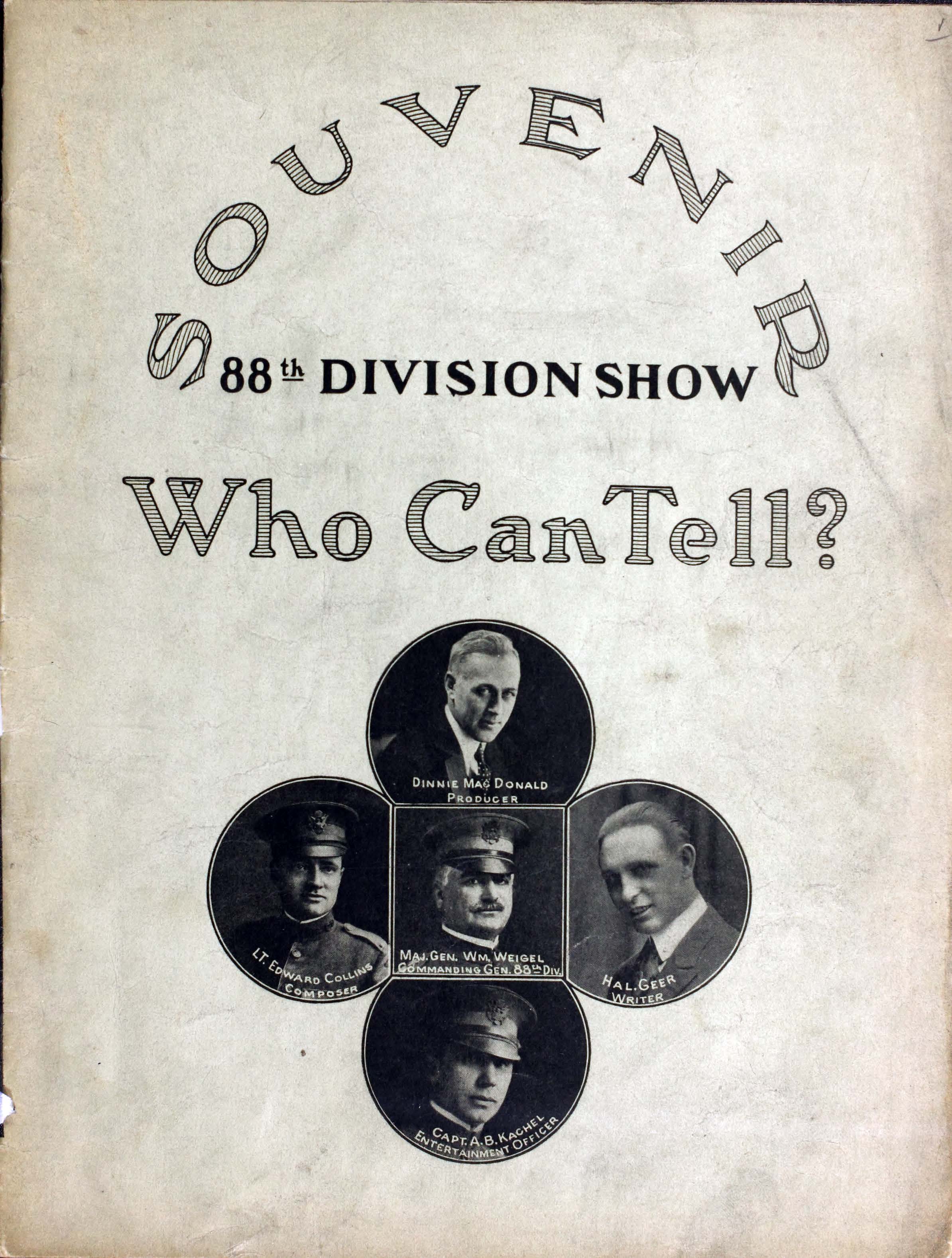 Who can tell : Eighty Eighth Division show : souvenir booklet / produced by Donald MacDonald ; music by Edw. Collins, 2nd Lt. U.S.A. ; lyrics by Mus. Hal Geer.