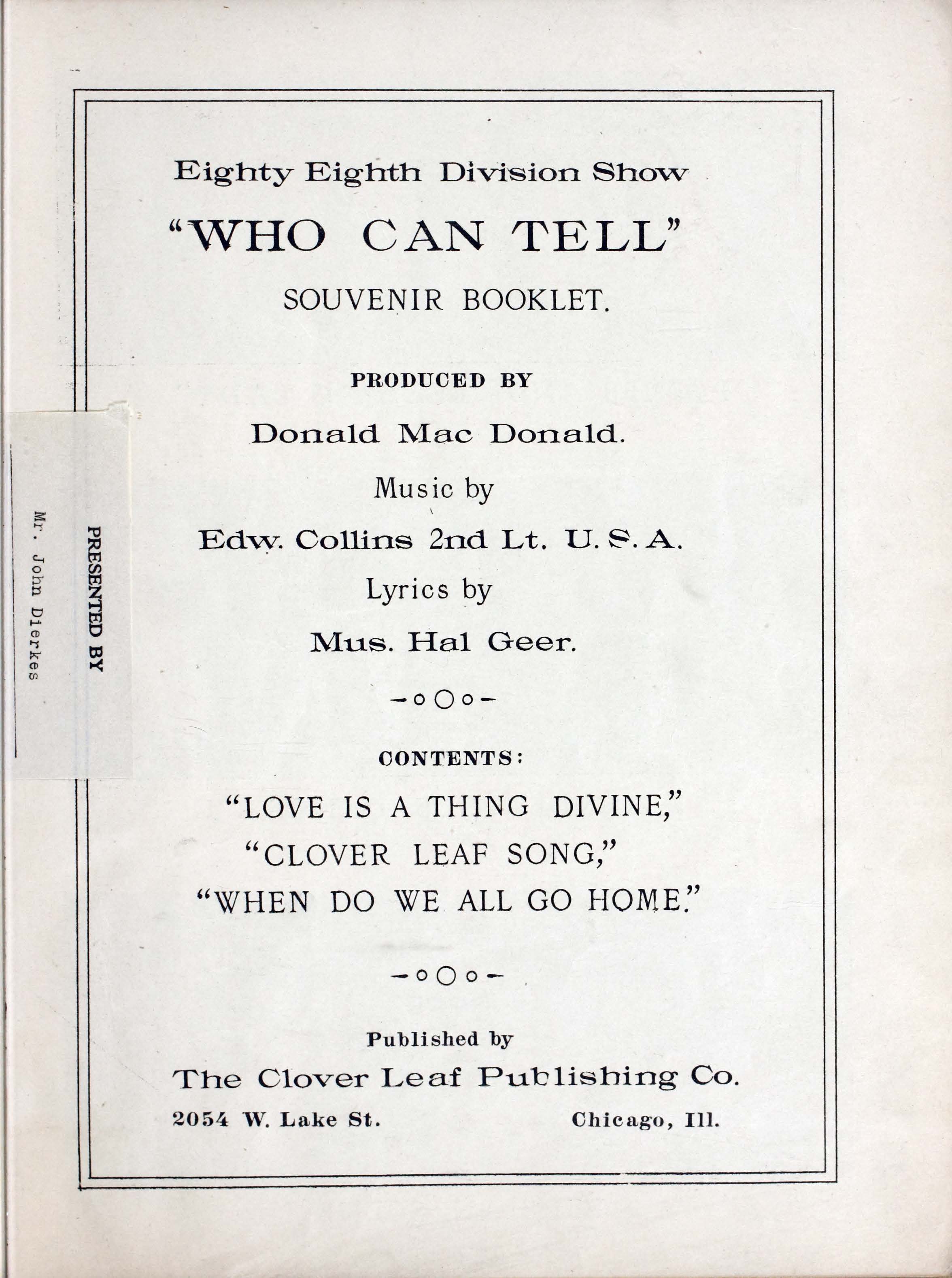 - Who can tell : Eighty Eighth Division show : souvenir booklet / produced by Donald MacDonald ; music by Edw. Collins, 2nd Lt. U.S.A. ; lyrics by Mus. Hal Geer.