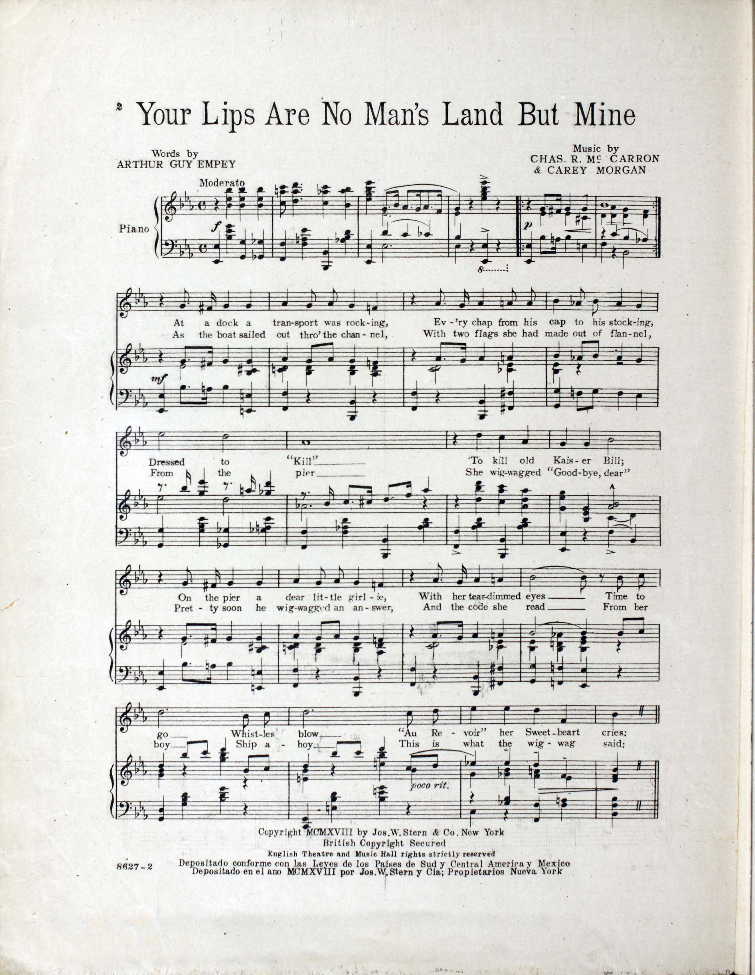 McCarron, Chas. R. (Charles R.), 1891-1919. 2000. “Your Lips Are No man’s Land But Mine Words by Arthur Guy Empey ; Music by Chas. R. McCarron and Carey Morgan”. New York (102-104 W. 38th St.) : Jos. W. Stern and Co, World War I Sheet Music, accessed April 28, 2026, https://digitalexhibits.library.wustl.edu/s/wwimusic/item/36361