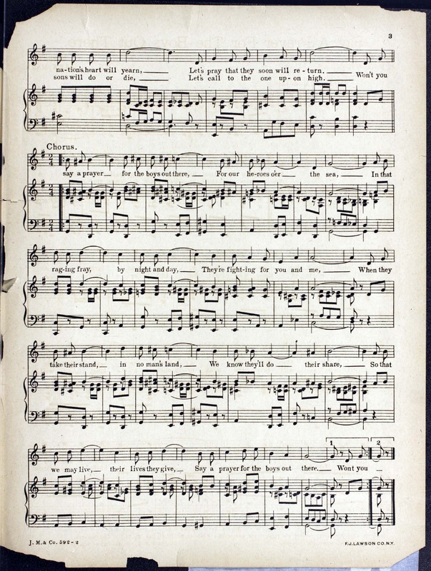 Marr, Alex. 2000. “Say a Prayer for the Boys ‘out There’ Words by Bernie Grossman ; Music by Alex Marr”. New York (145 W. 45th St.) : Joe Morris Music Co, World War I Sheet Music, accessed February 11, 2026, https://digitalexhibits.library.wustl.edu/s/wwimusic/item/36364