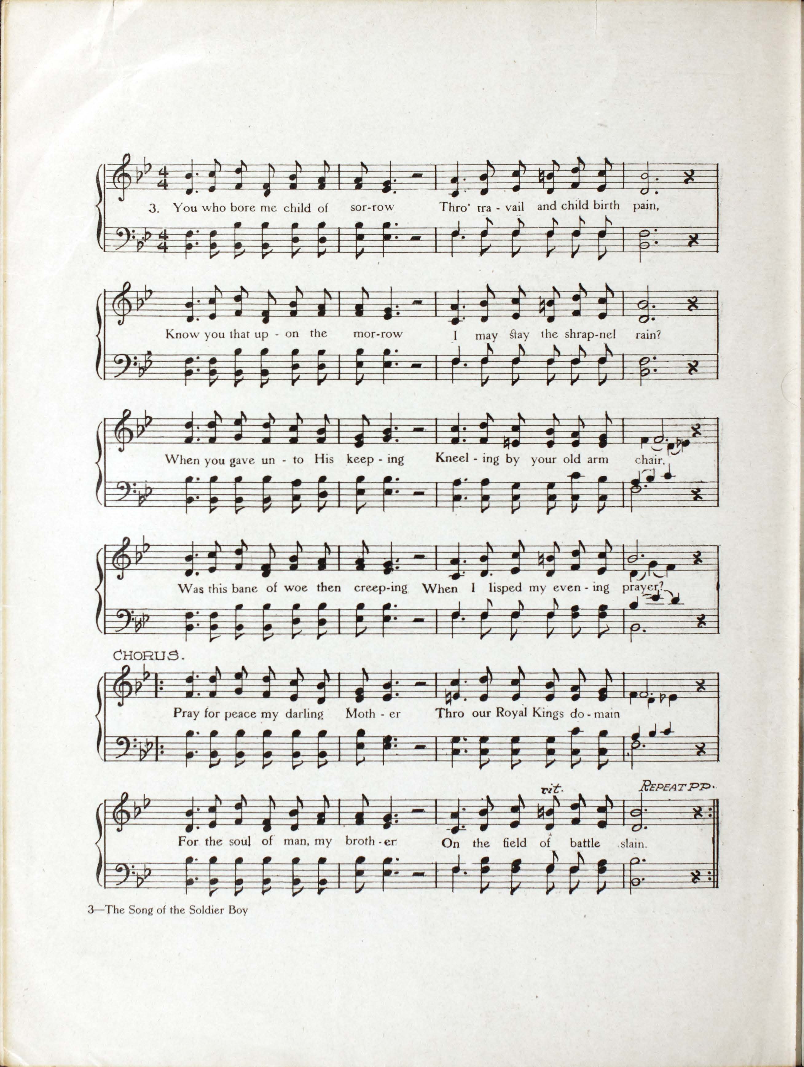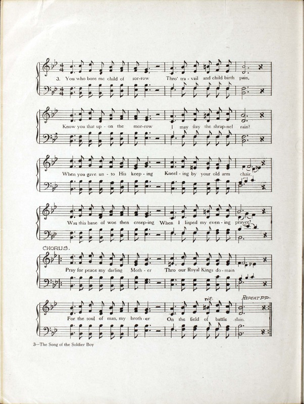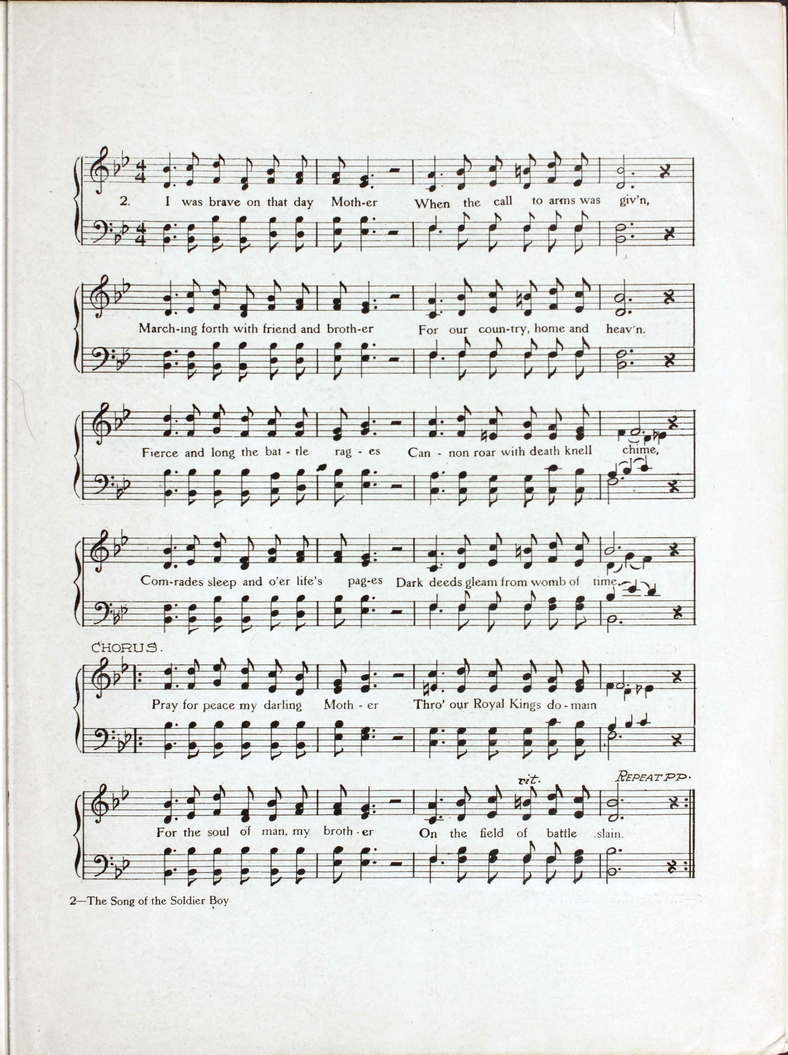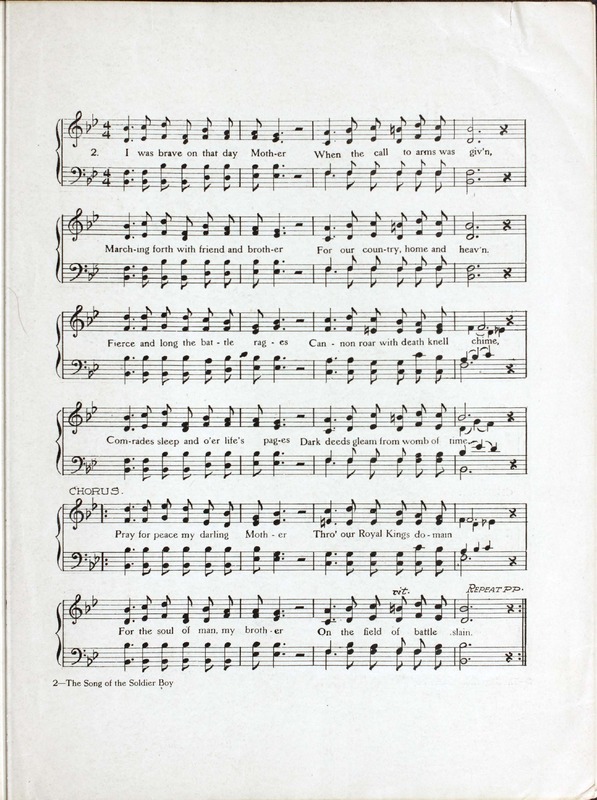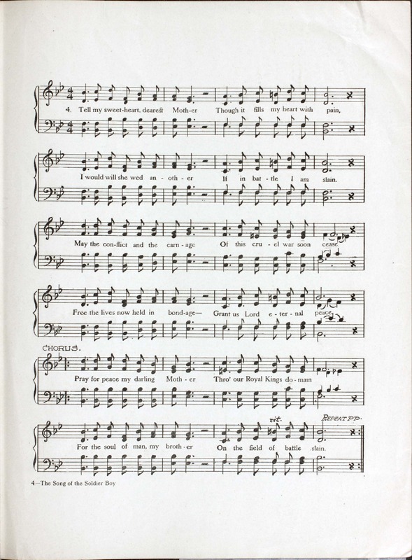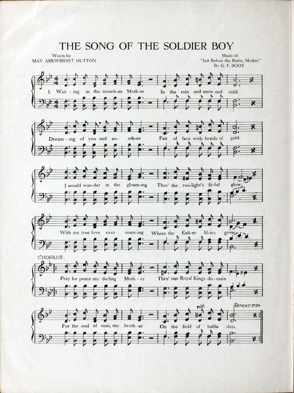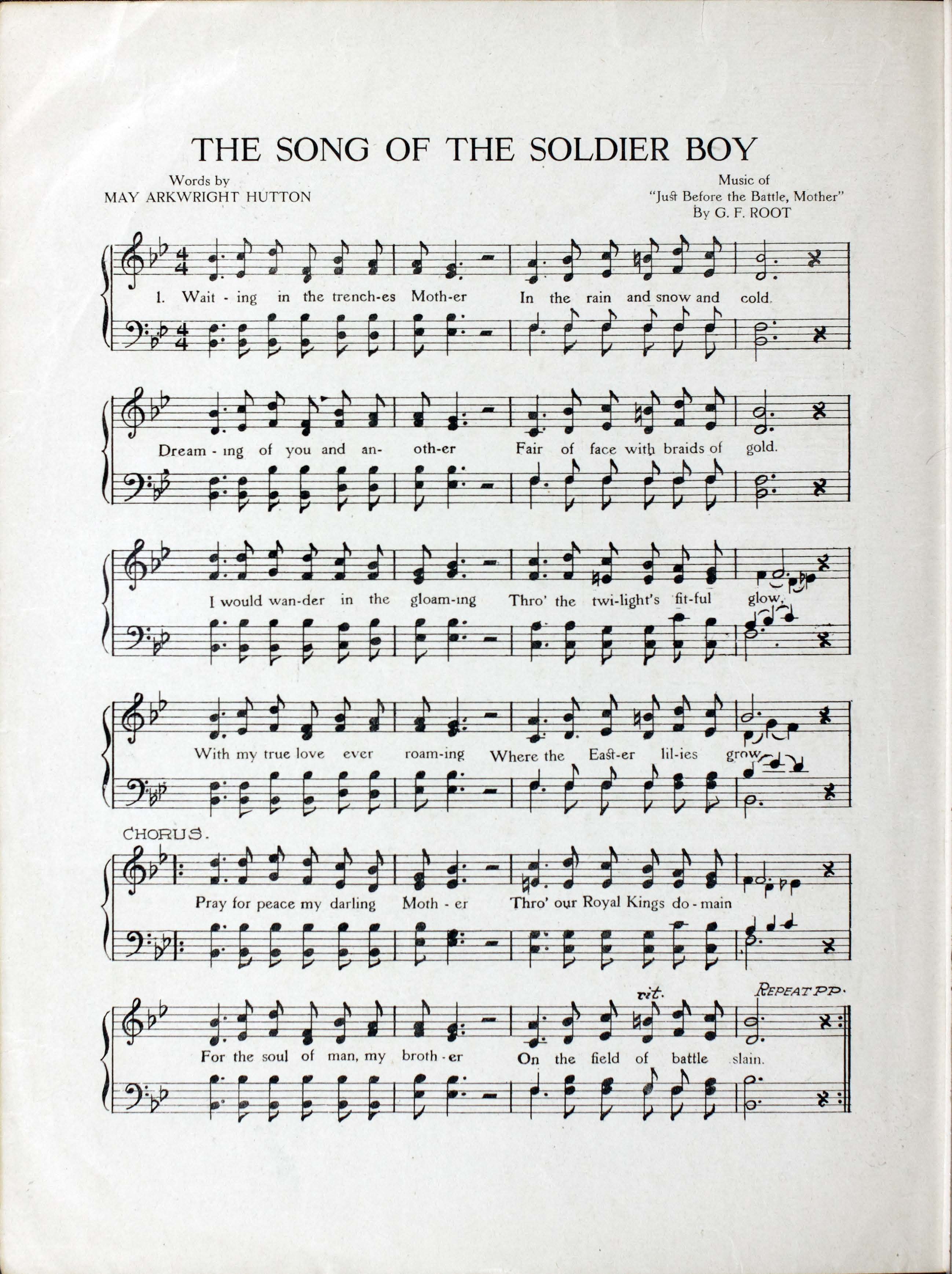Root, George F. (George Frederick), 1820-1895. 2000. “The Song of the Soldier Boy Words by May Arkwright Hutton ; Music ‘Just before the Battle Mother’ by G.F. Root”. Spokane, Wash. : May Arkwright Hutton, World War I Sheet Music, accessed April 2, 2026, https://digitalexhibits.library.wustl.edu/s/wwimusic/item/36366