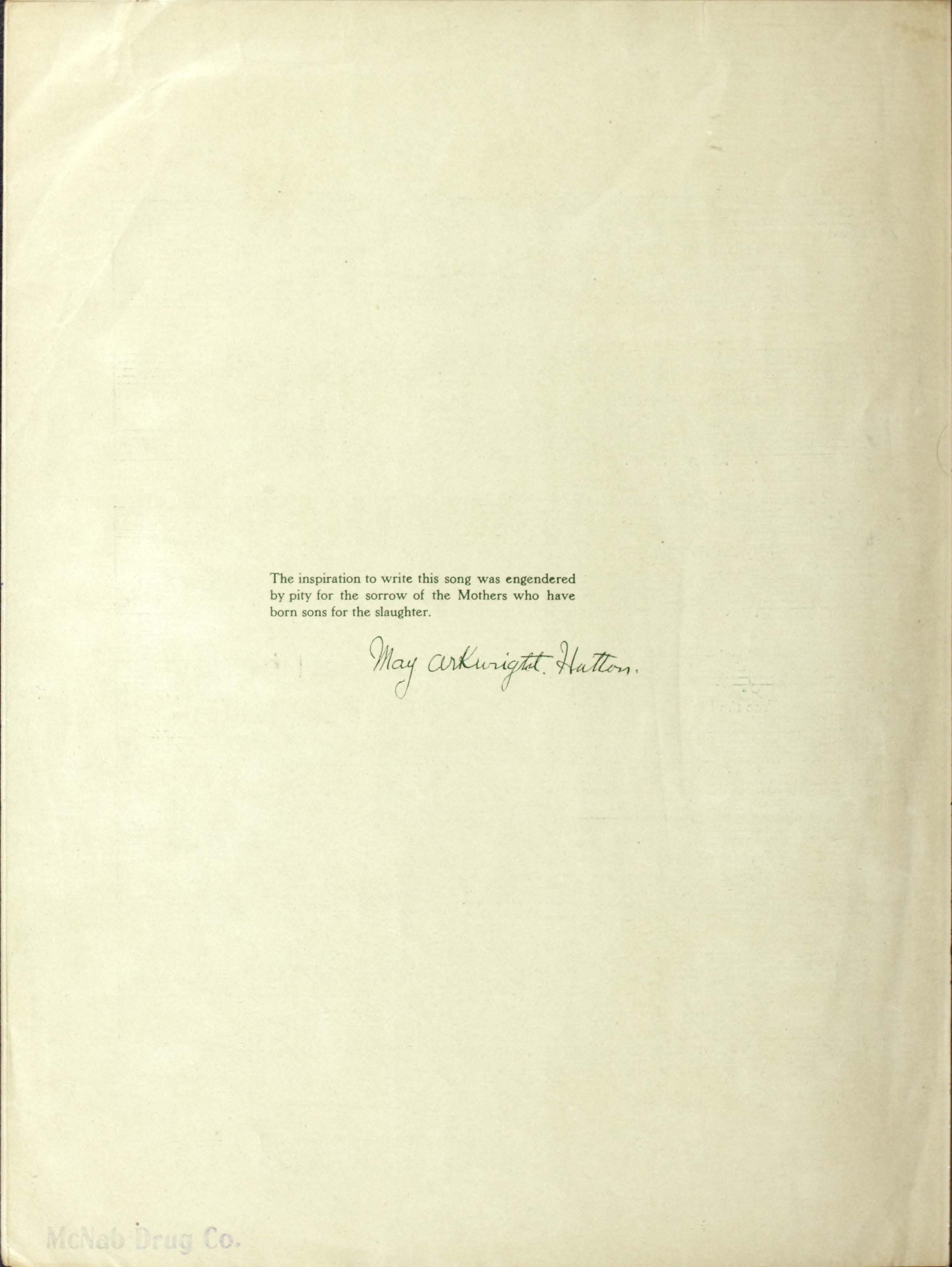 - "The inspiration to write this song was engendered by pity for the sorrow of the Mothers who have born sons for the slaughter. -- May Arkwright Hutton" -- p. [5].