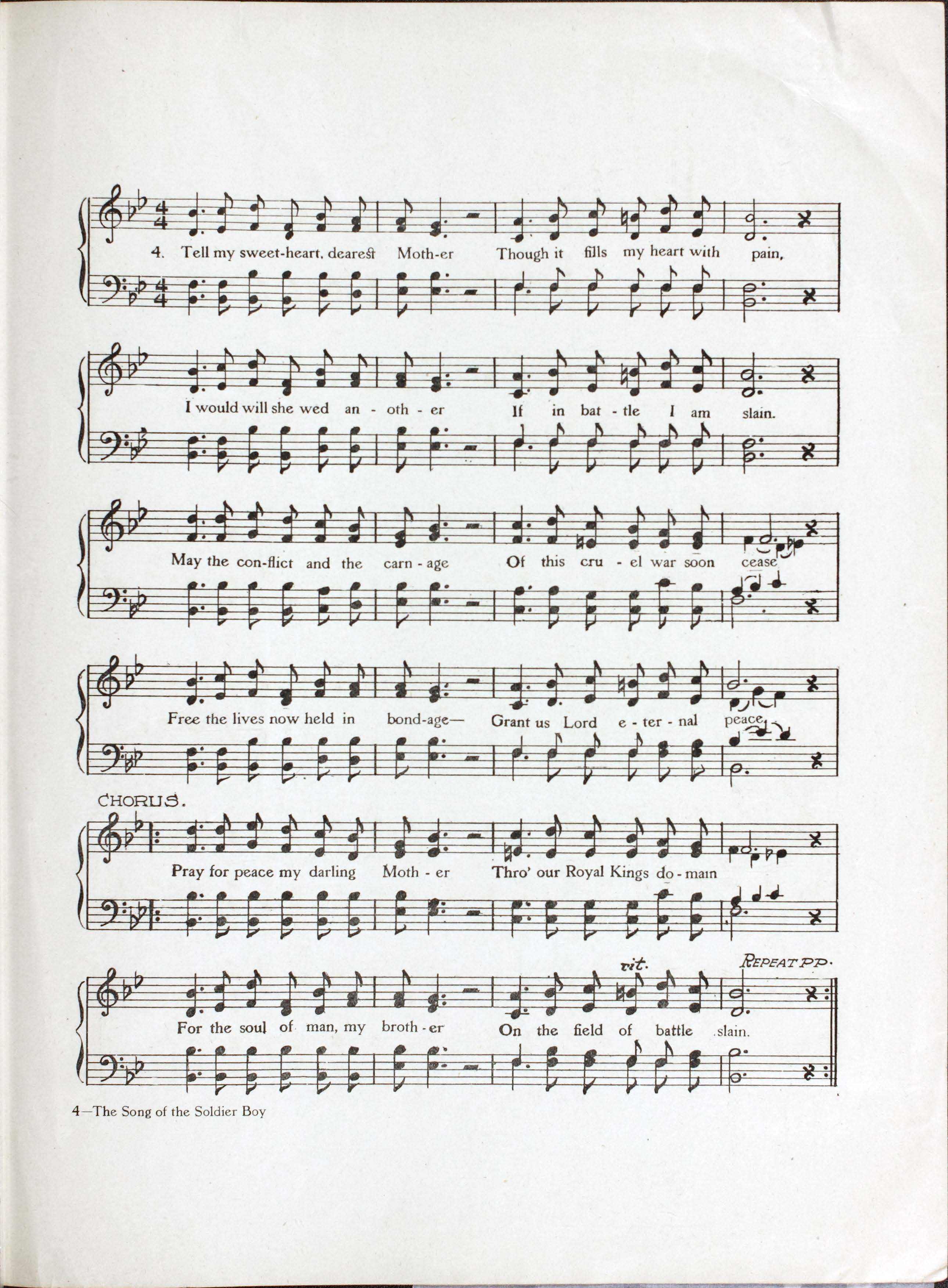 - The song of the soldier boy / words by May Arkwright Hutton ; music "Just before the battle mother" by G.F. Root.