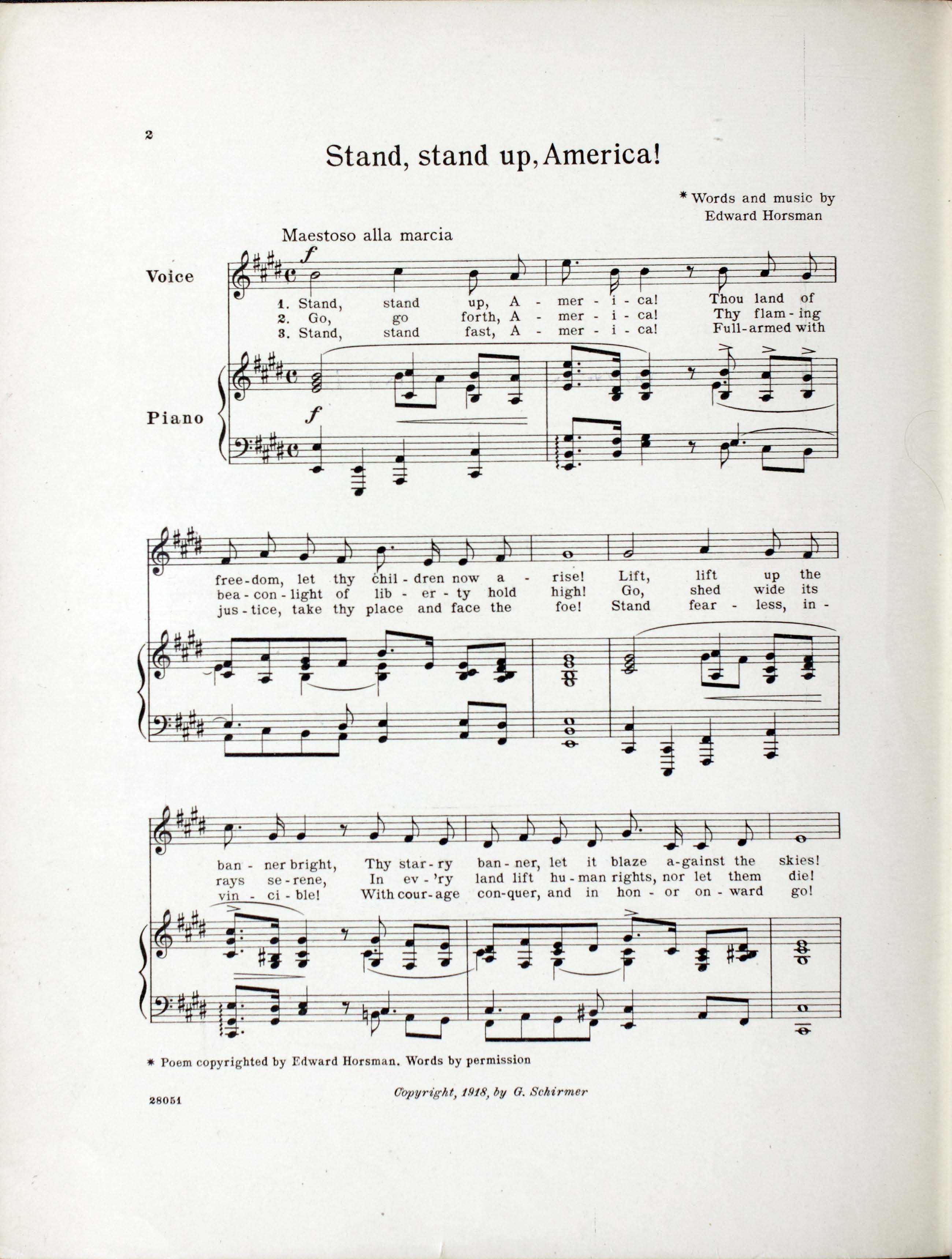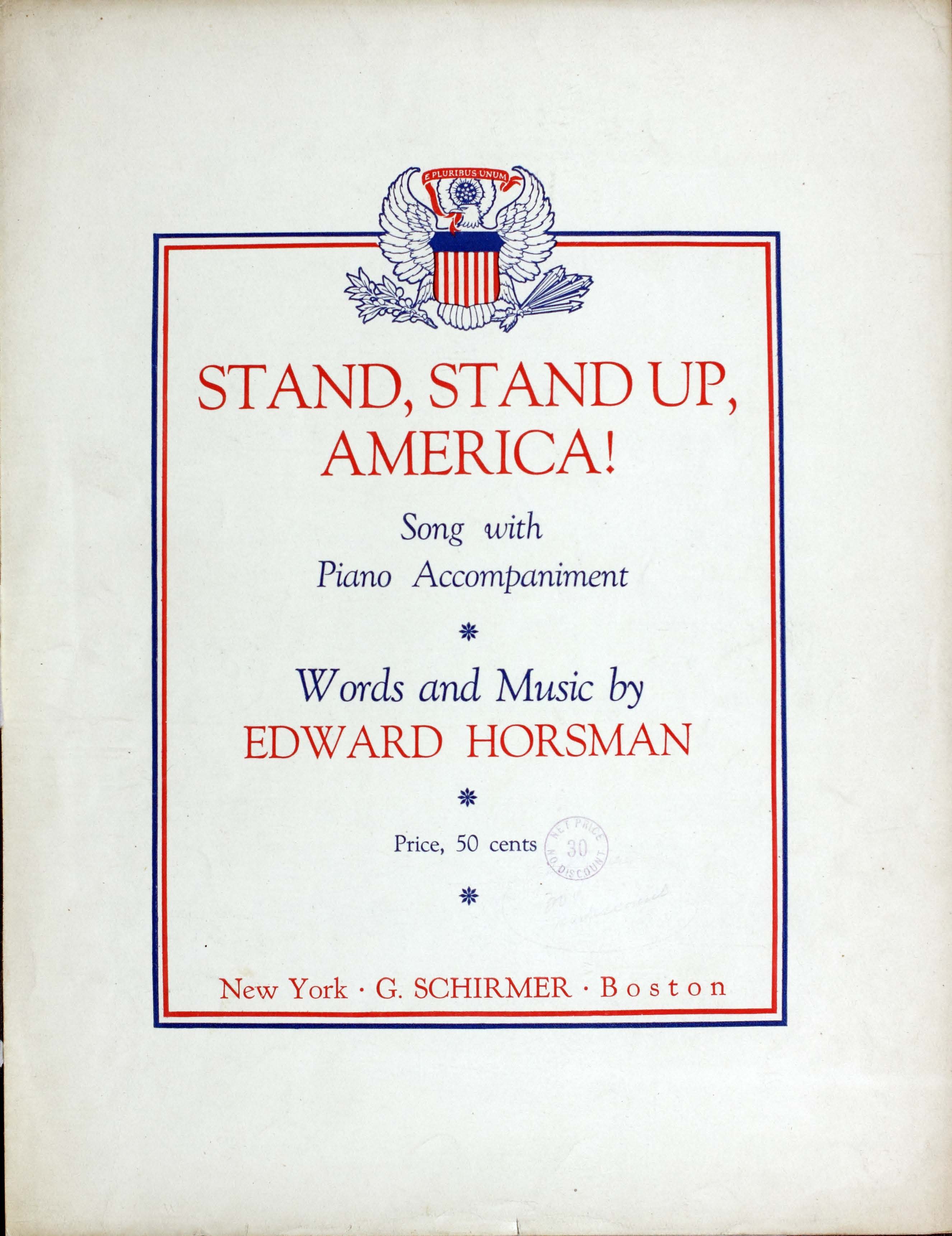 Horsman, Edward, 1873-1918. 2000. “Stand, Stand Up, America! : Song With Piano Accompaniment Words and Music by Edward Horsman”. New York : G. Schirmer, World War I Sheet Music, accessed April 2, 2026, https://digitalexhibits.library.wustl.edu/s/wwimusic/item/36367