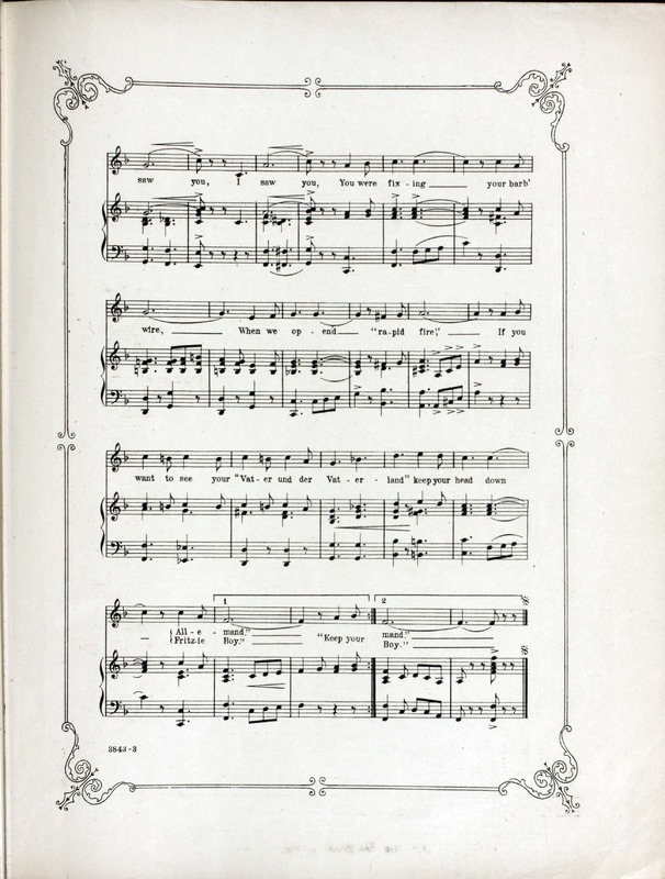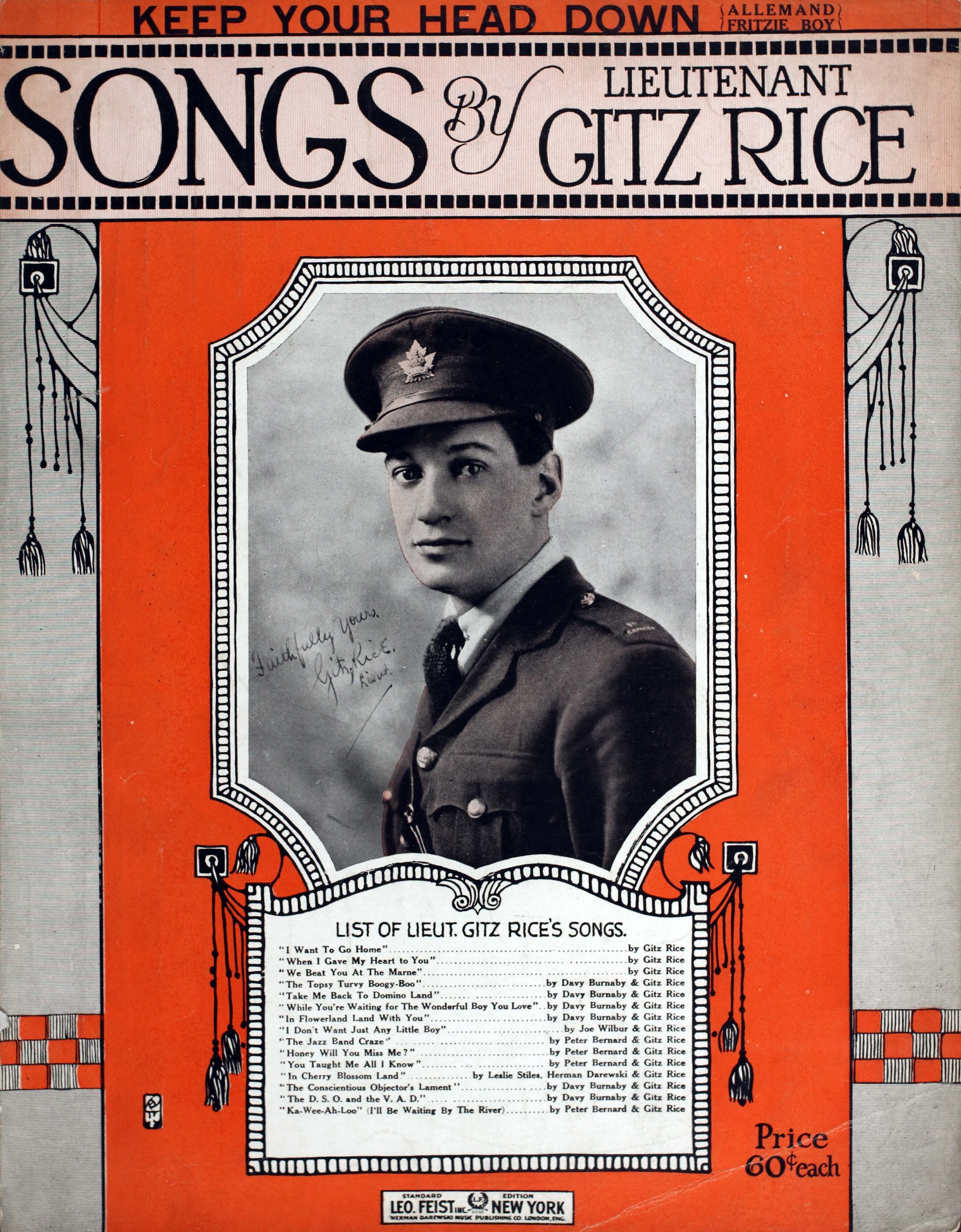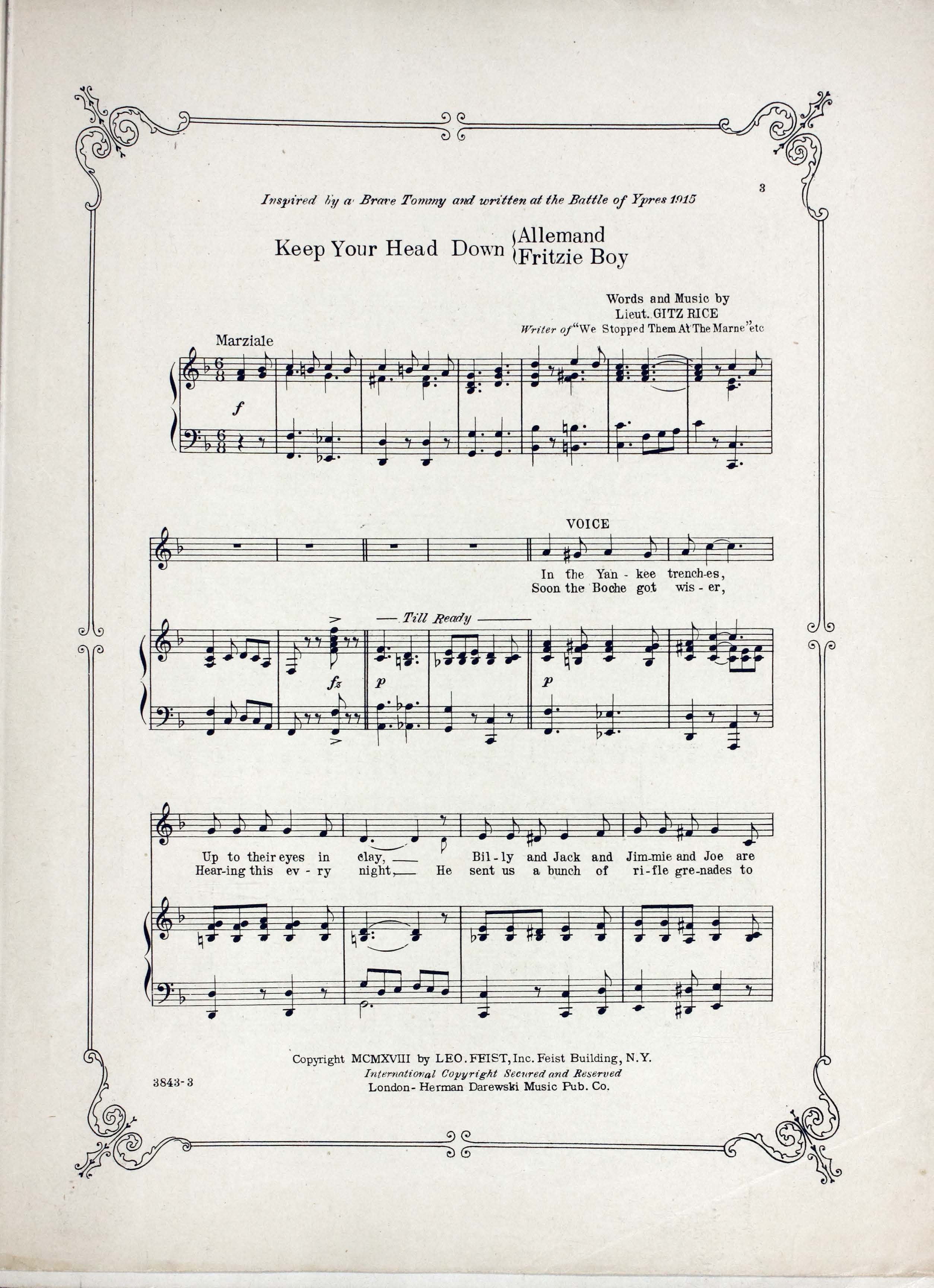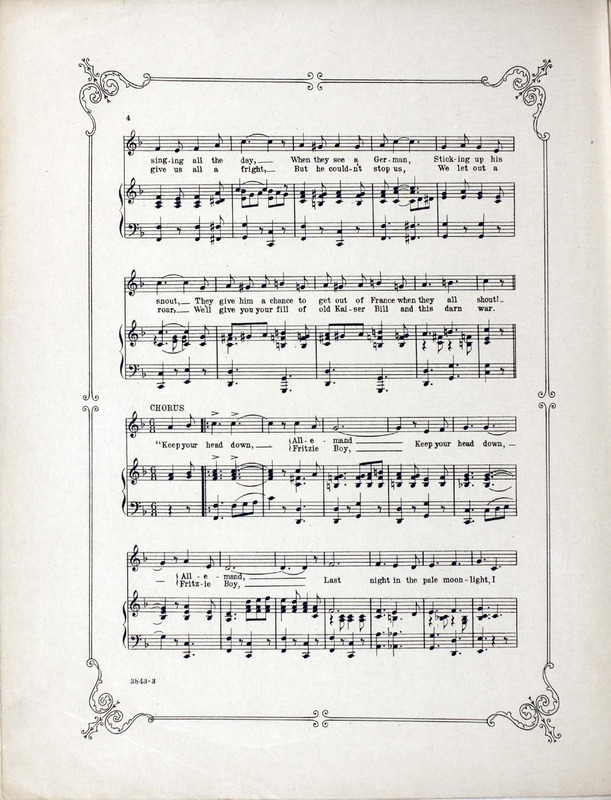 Rice, Gitz, 1891-1947. 2000. “Keep Your Head down Allemand Words and Music by Lieut. Gitz Rice, Writer of ‘We Stopped Them at the Marne’ Etc”. New York : Leo Feist, Inc, World War I Sheet Music, accessed February 11, 2026, https://digitalexhibits.library.wustl.edu/s/wwimusic/item/36666