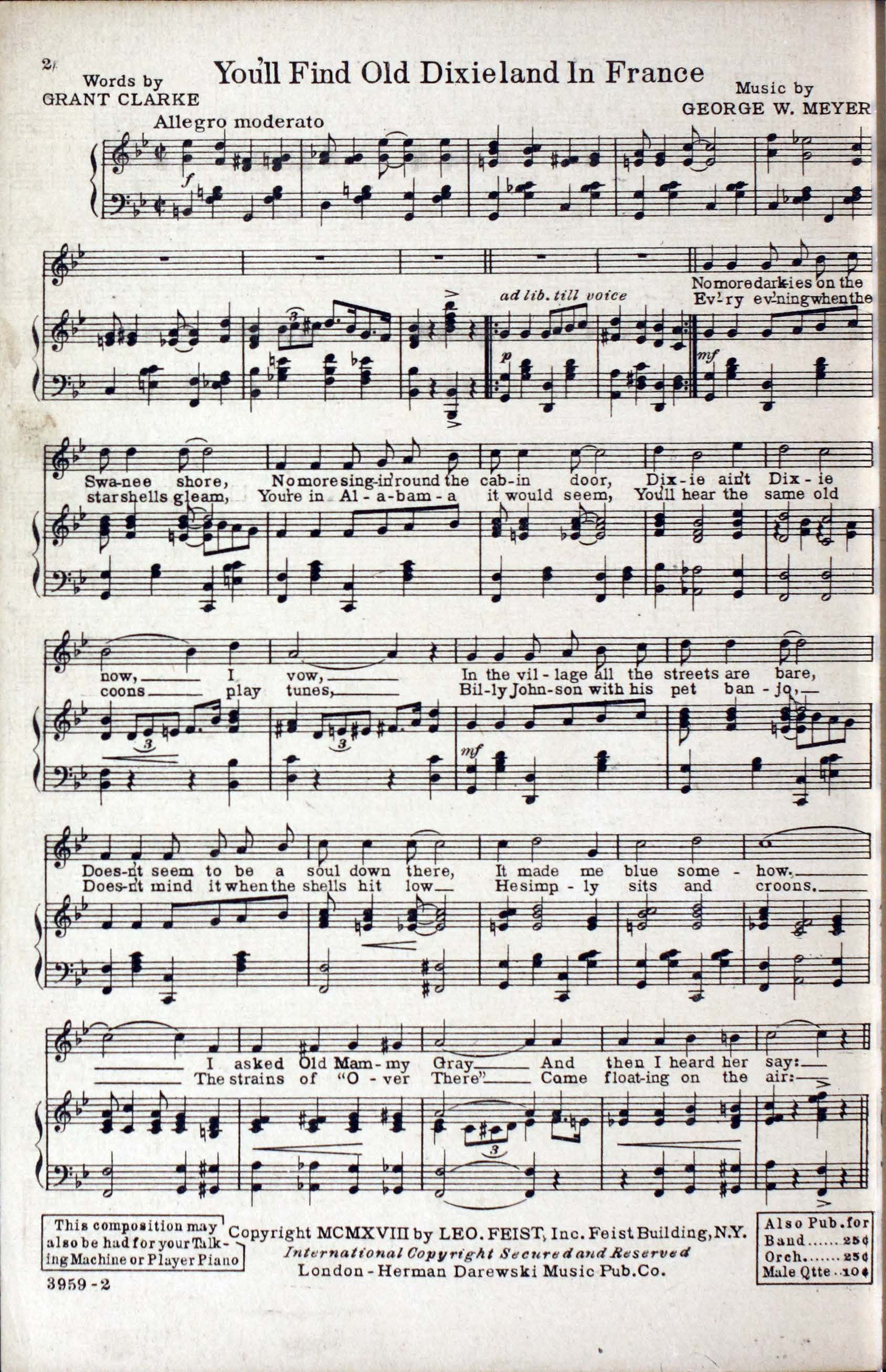 - Plate number -- 3959-2, Leo Feist, Inc.