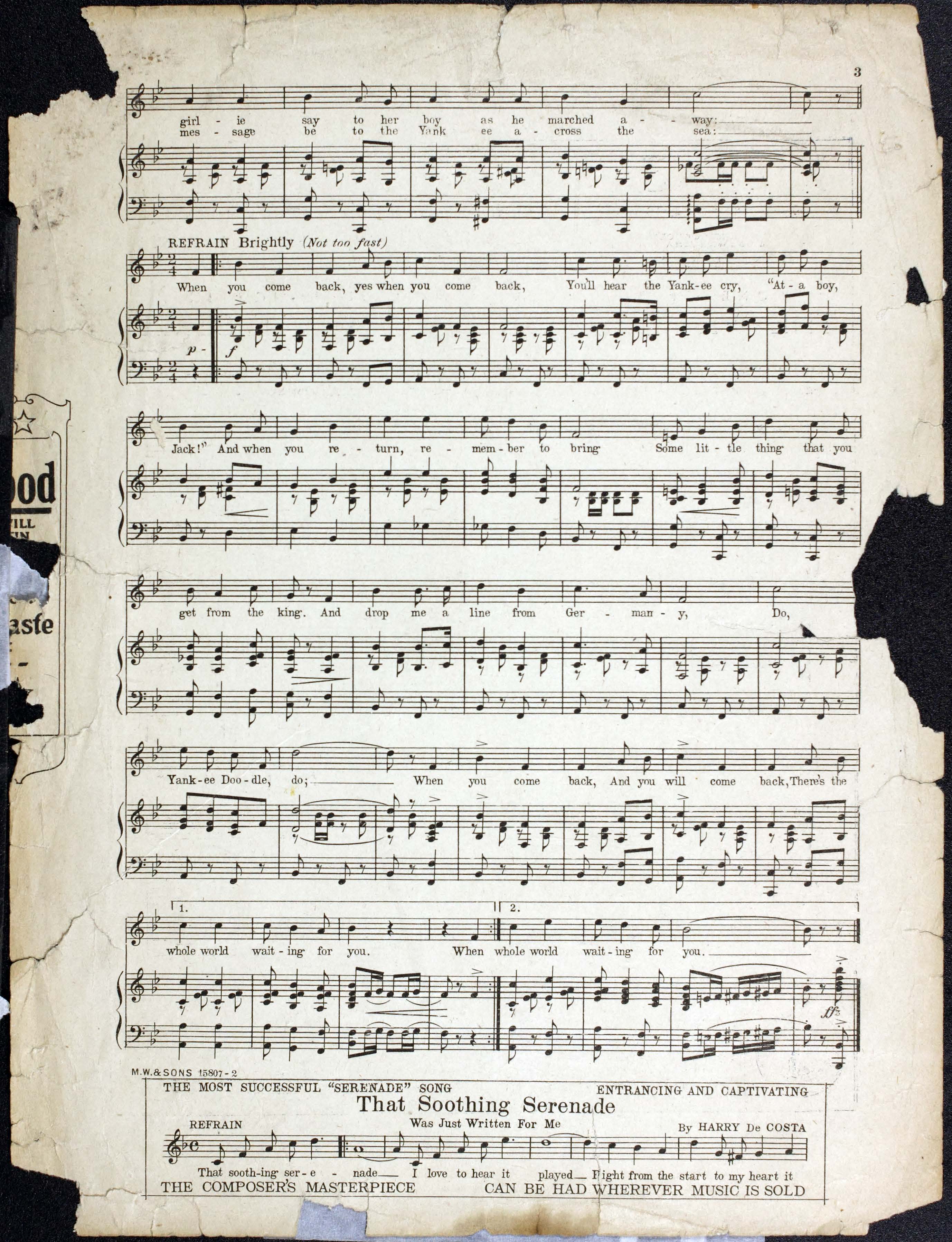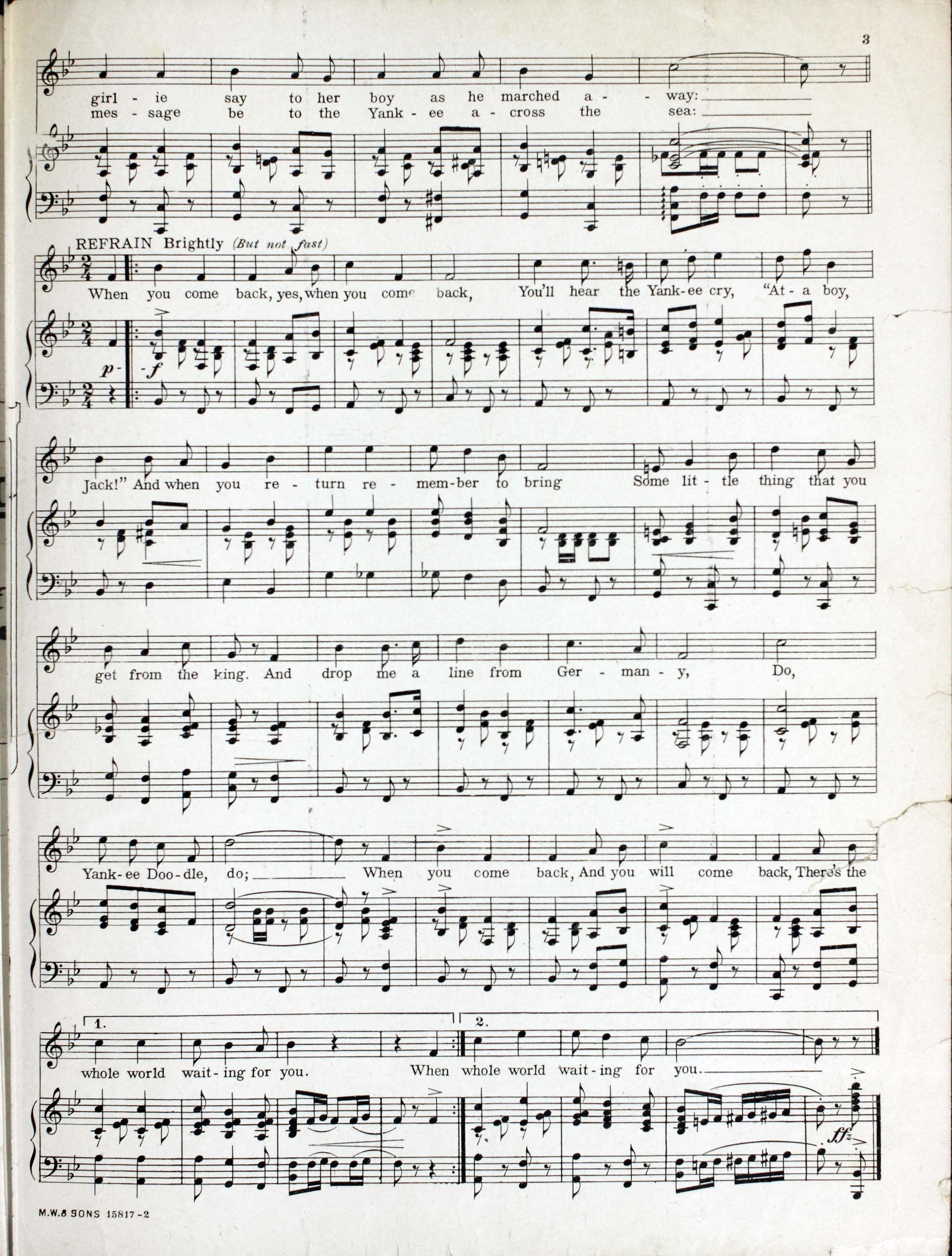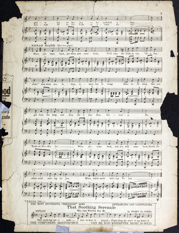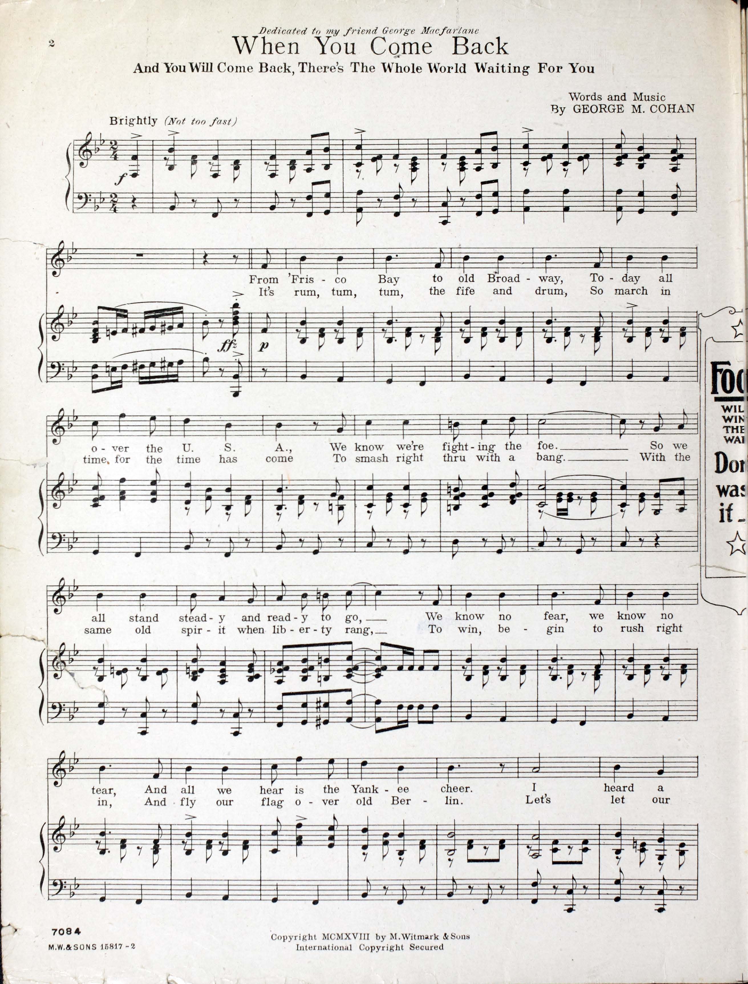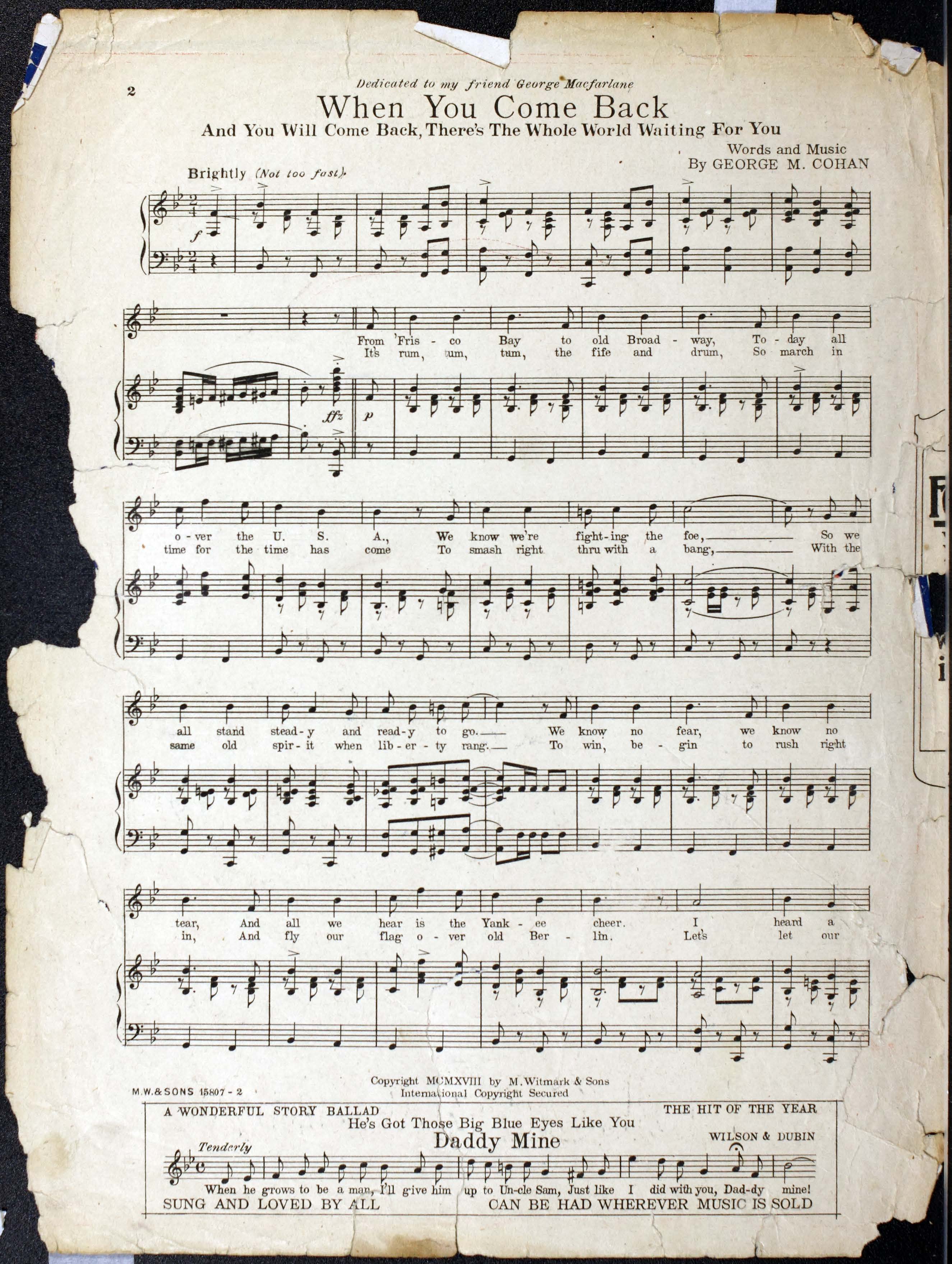 Cohan, George M. (George Michael), 1878-1942. 2000. “When You Come Back : and You Will Come Back, there’s the Whole World Waiting for You : March Song Words and Music by George M. Cohan”. New York : M. Witmark & Sons, World War I Sheet Music, accessed February 11, 2026, https://digitalexhibits.library.wustl.edu/s/wwimusic/item/36673