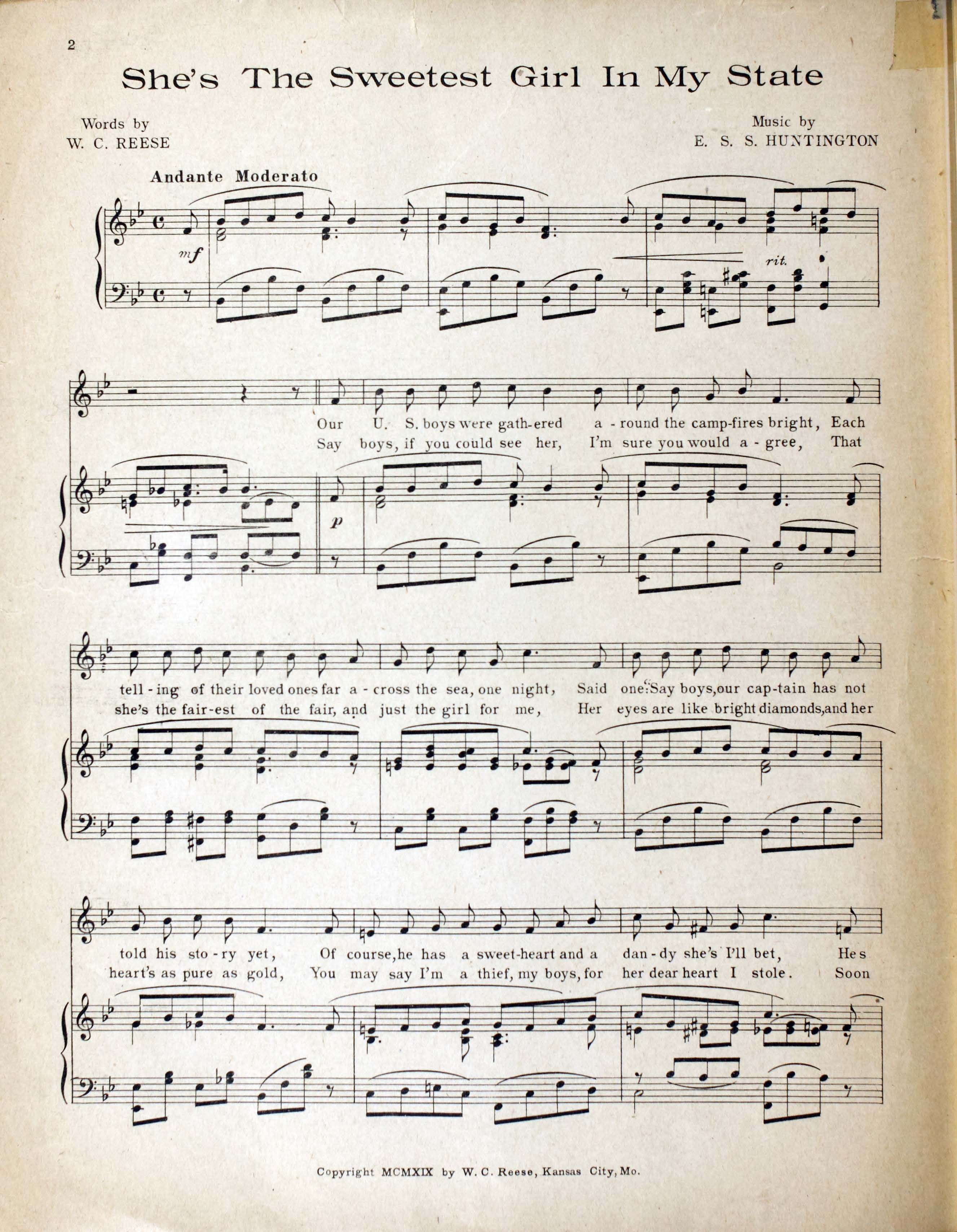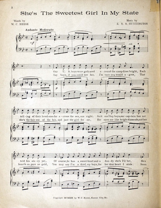 Huntington, E. S. S. 2000. “She’s the Sweetest Girl in My State Words by W.C. Reese ; Music by E.S.S. Huntington”. Kansas City, Mo. : Reese and Reese, World War I Sheet Music, accessed February 11, 2026, https://digitalexhibits.library.wustl.edu/s/wwimusic/item/36677