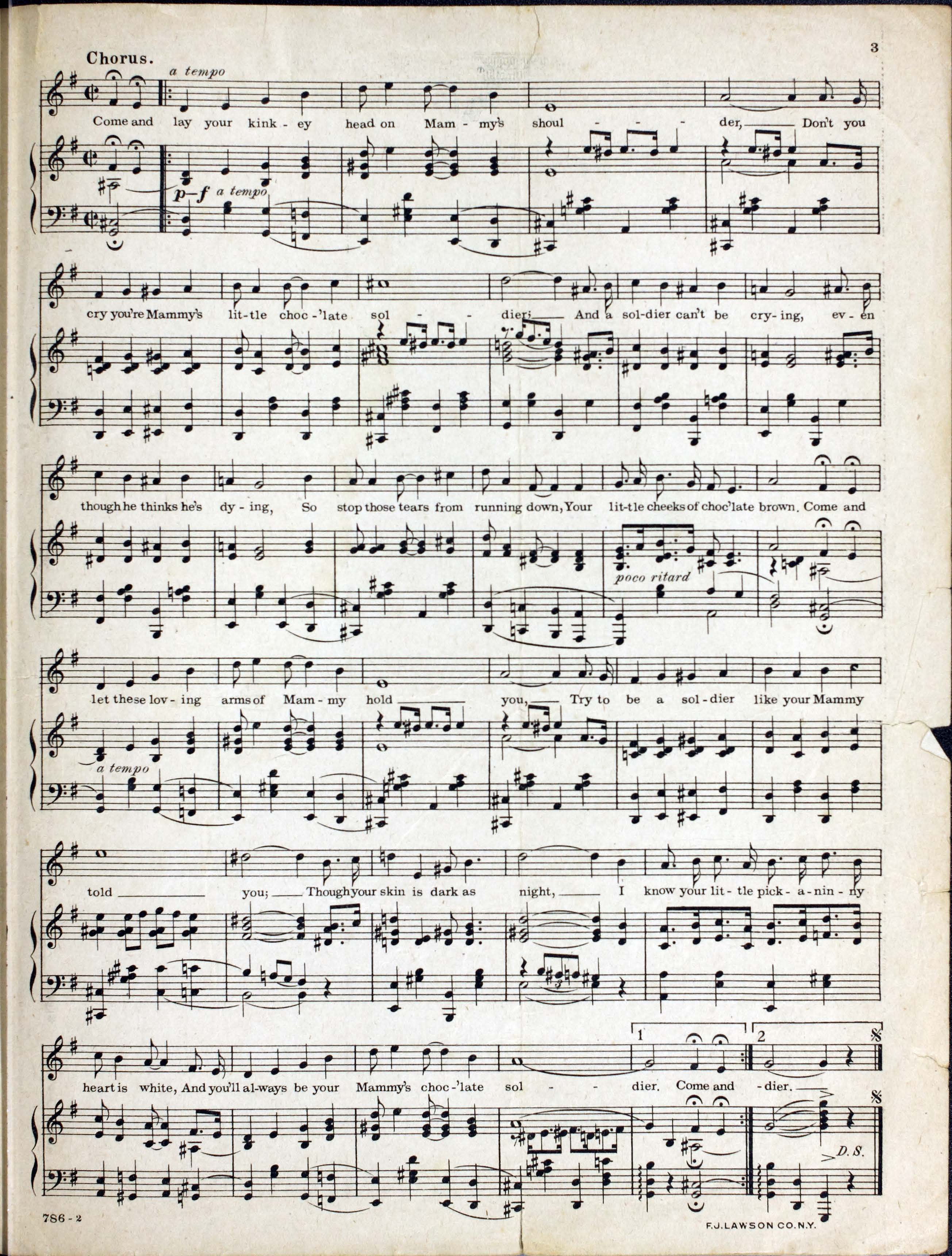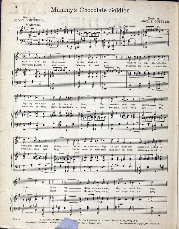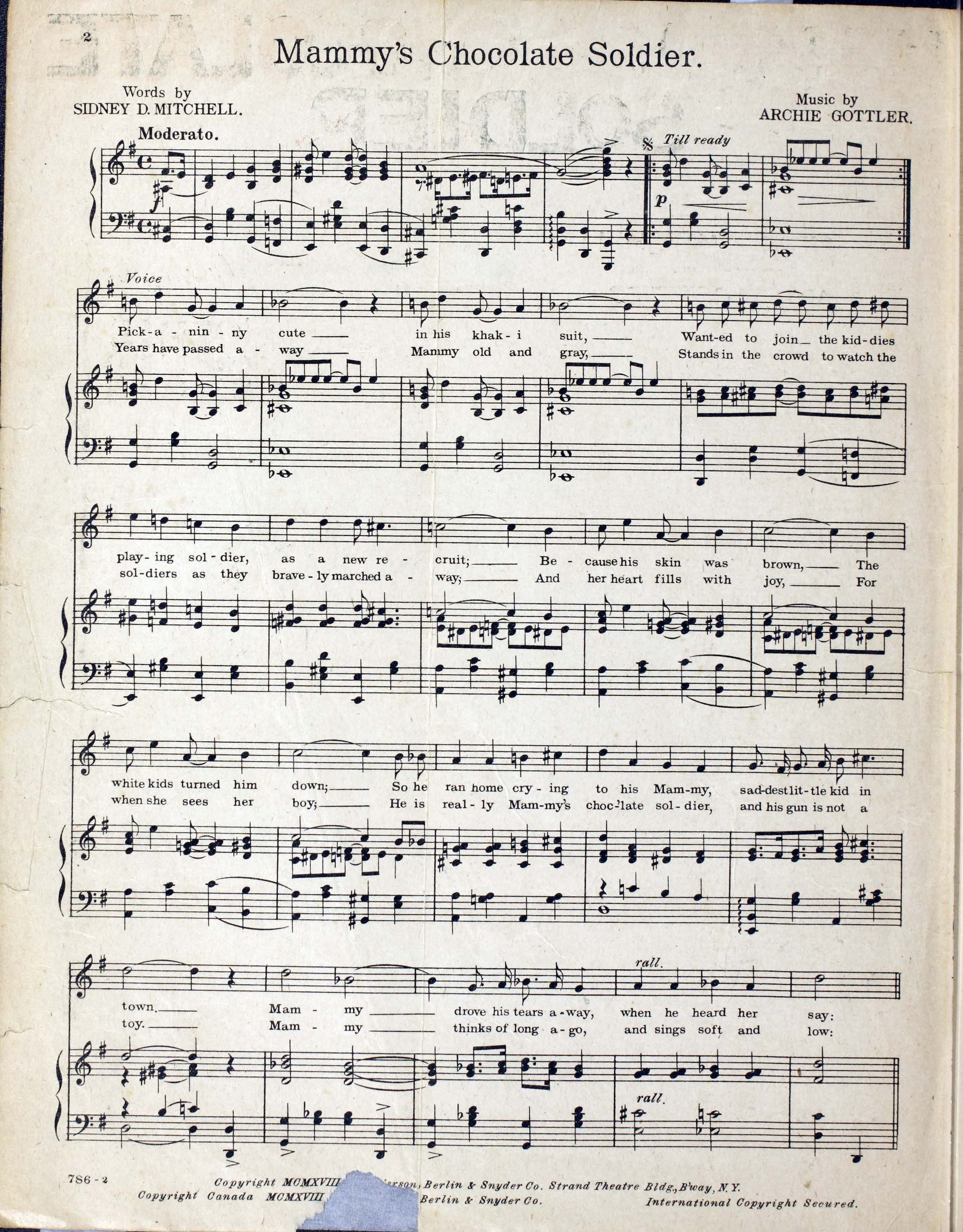 Gottler, Archie, 1896-1959. 2000. “Mammy’s Chocolate Soldier Words by Sidney Mitchell ; Music by Archie Gottler”. New York (Strand Theatre Bldg., Broadway at 47th St.) : Waterson, Berlin and Snyder Co., music publishers, World War I Sheet Music, accessed February 11, 2026, https://digitalexhibits.library.wustl.edu/s/wwimusic/item/36683