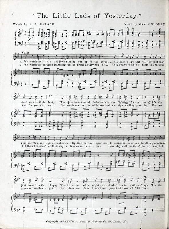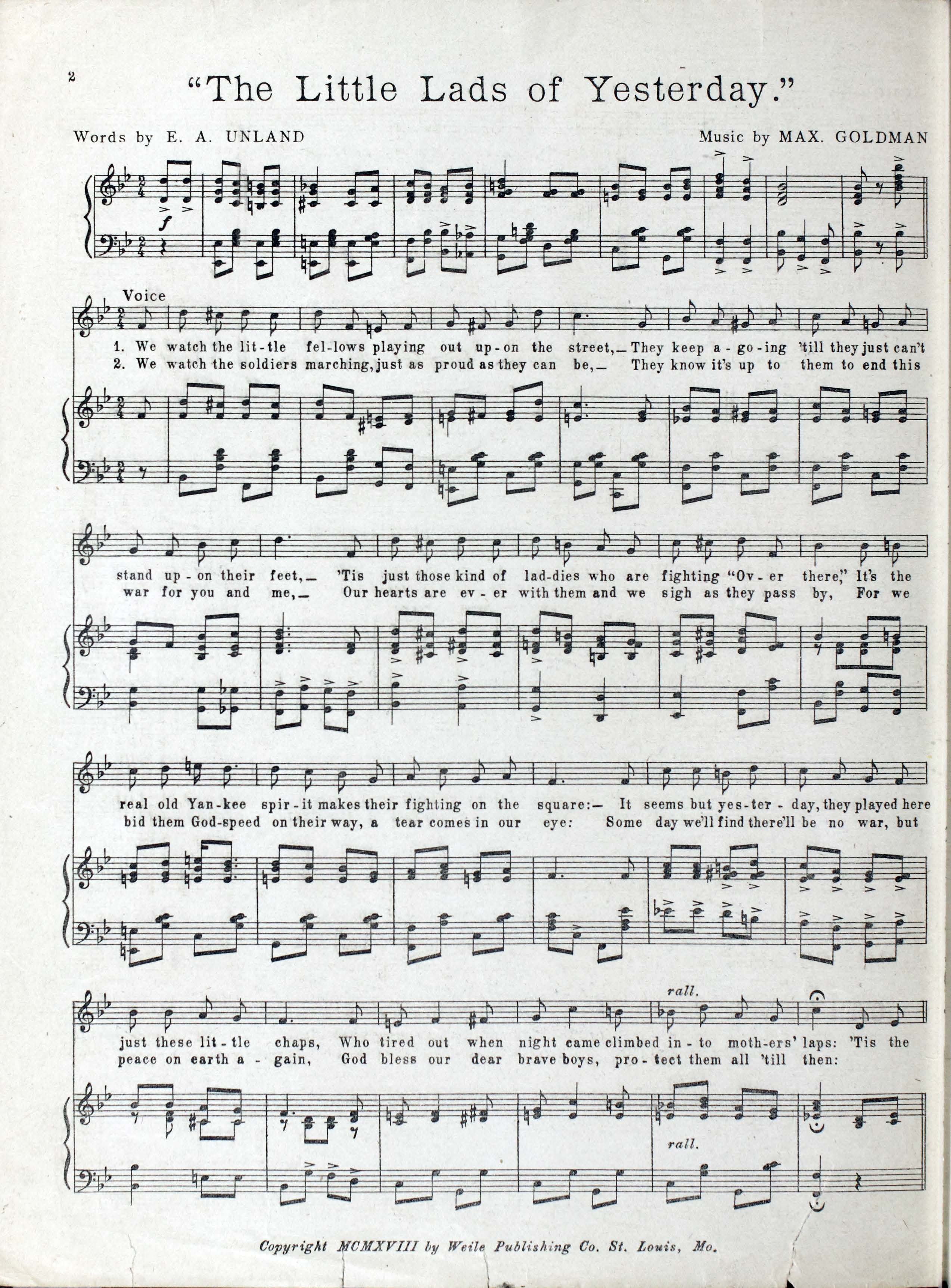 Goldman, Maxwell. 2000. “The Little Lads of Yesterday : Soldiers of the U.S.A. [words By] B.A. Unland ; [music By] Max Goldman”. St. Louis, Mo. : Weille [sic] Pub. Co, World War I Sheet Music, accessed February 11, 2026, https://digitalexhibits.library.wustl.edu/s/wwimusic/item/36687
