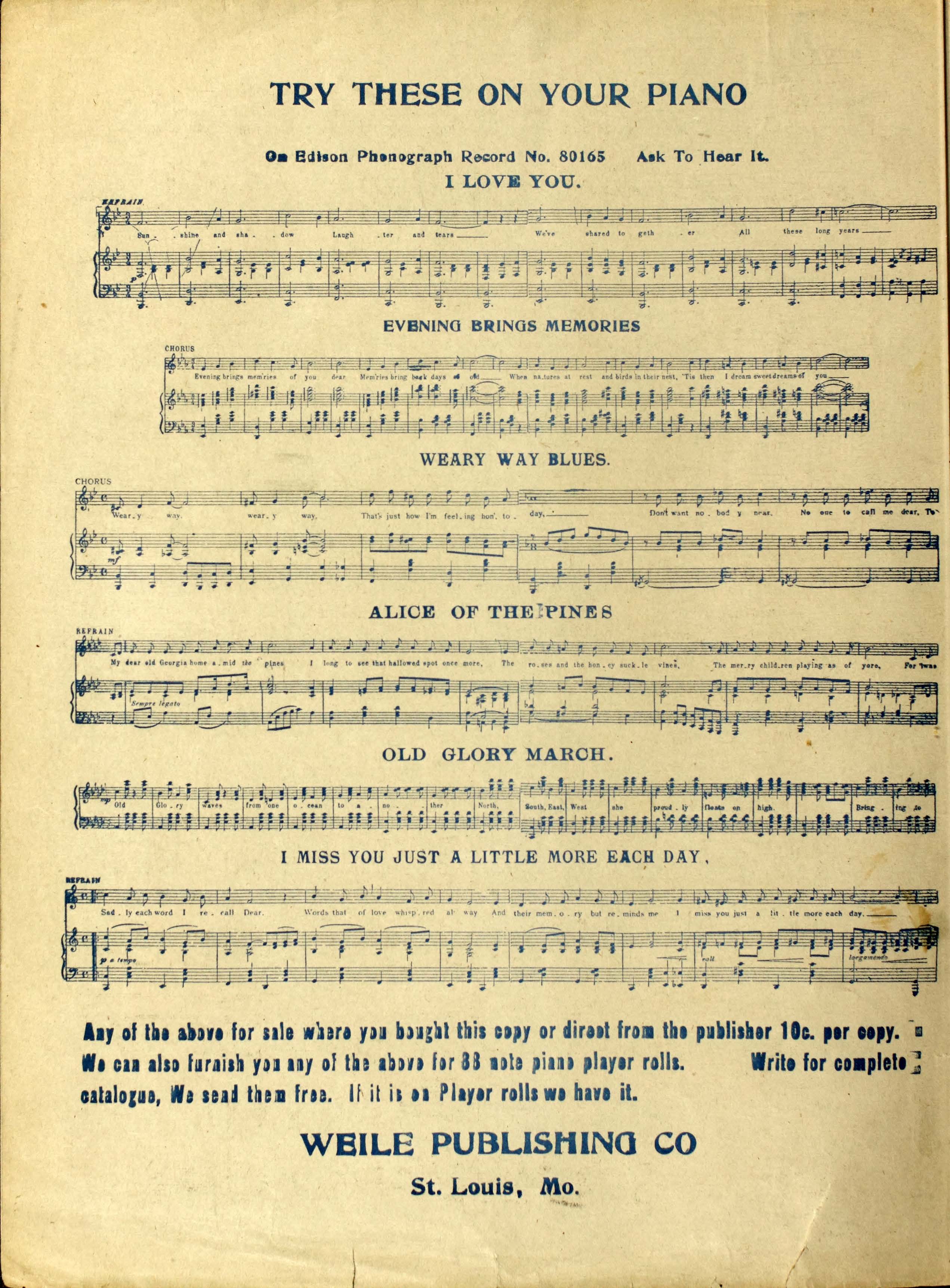 - Publisher's name given as Weile Publishing Co. in copyright statement and in advertising matter.