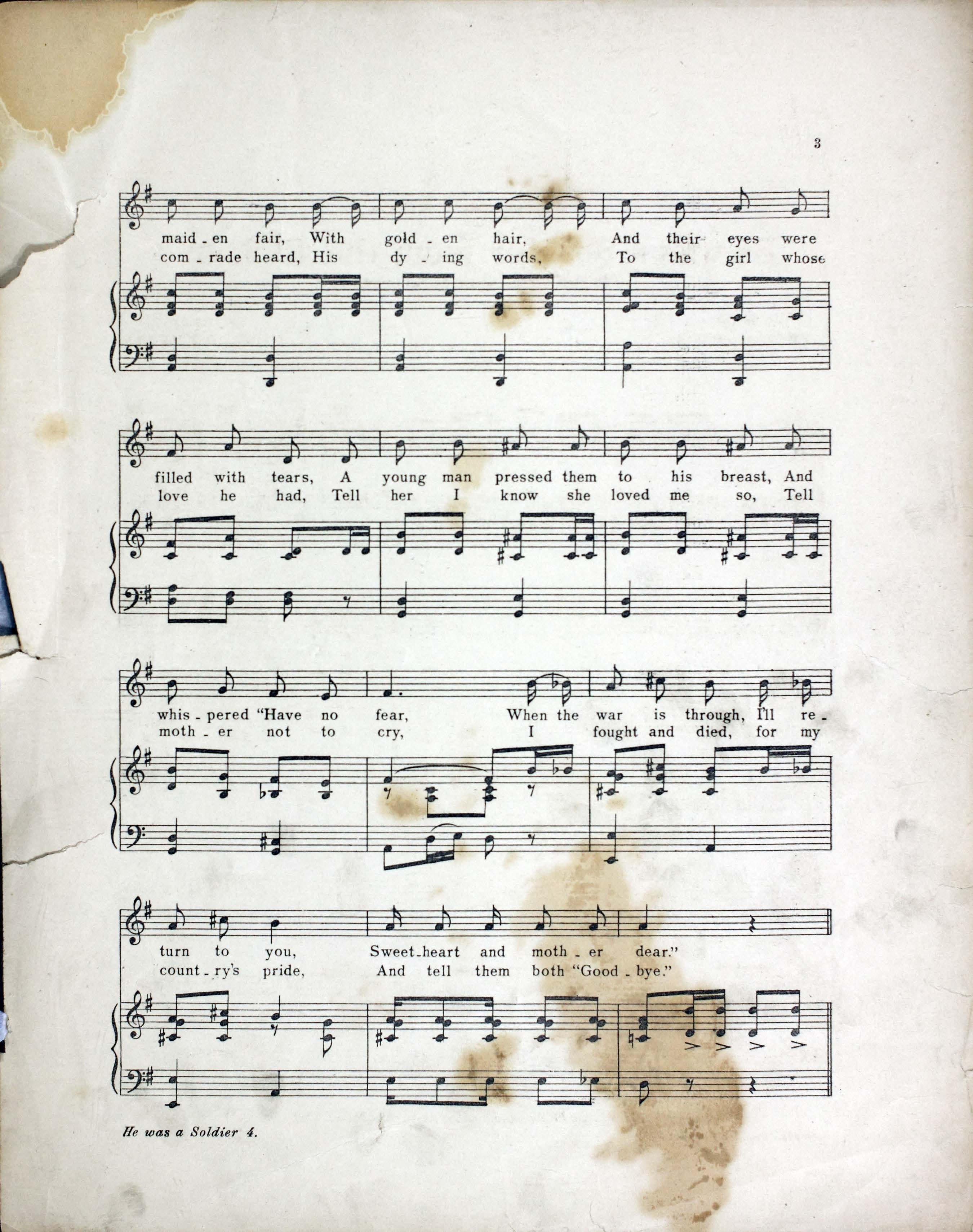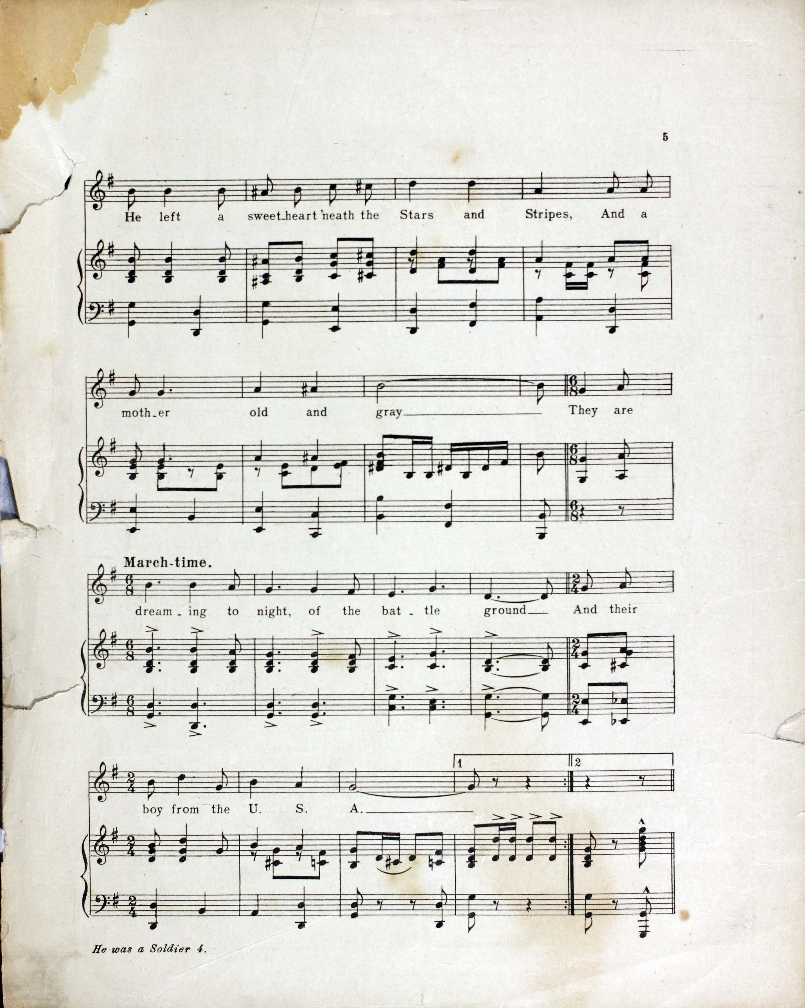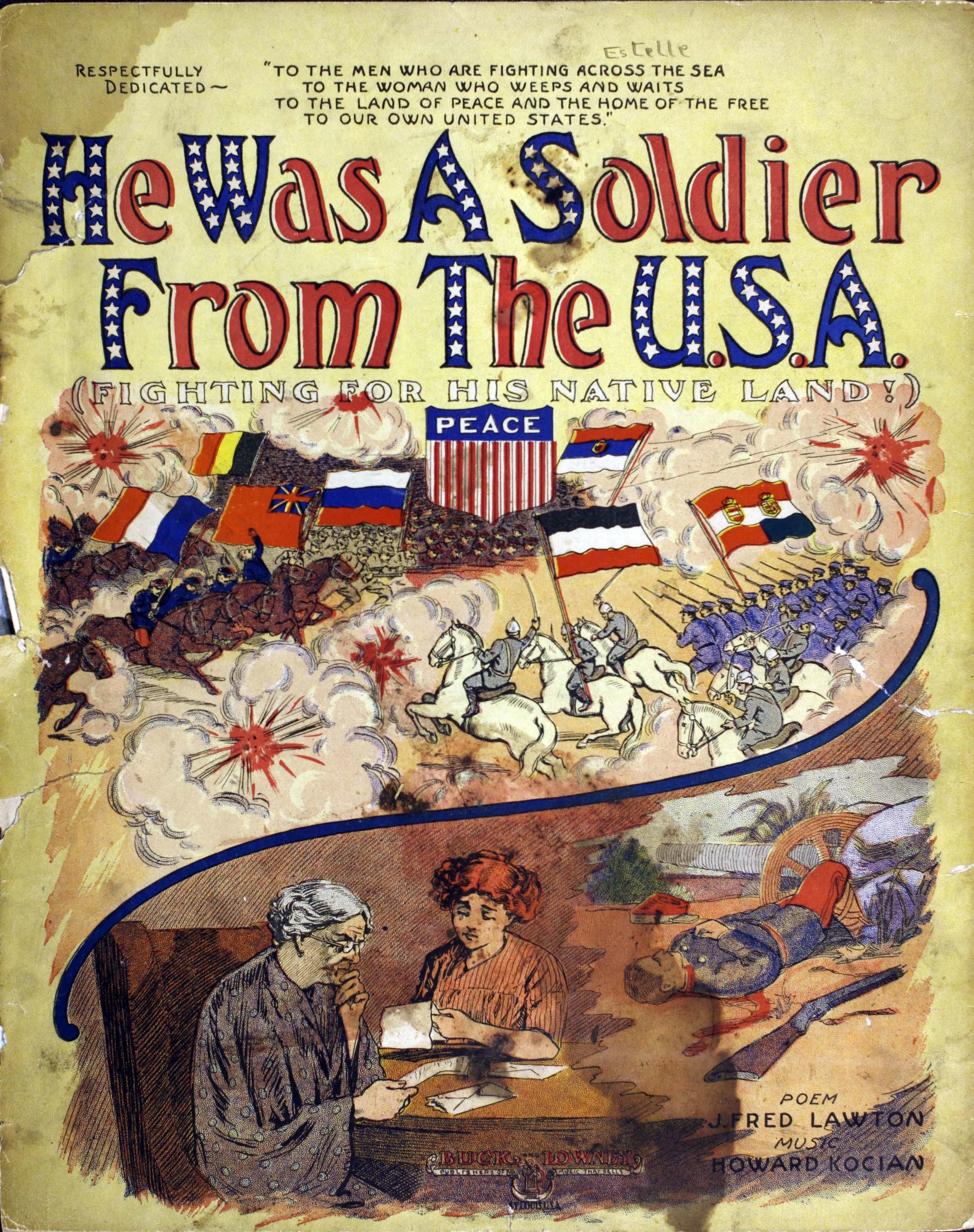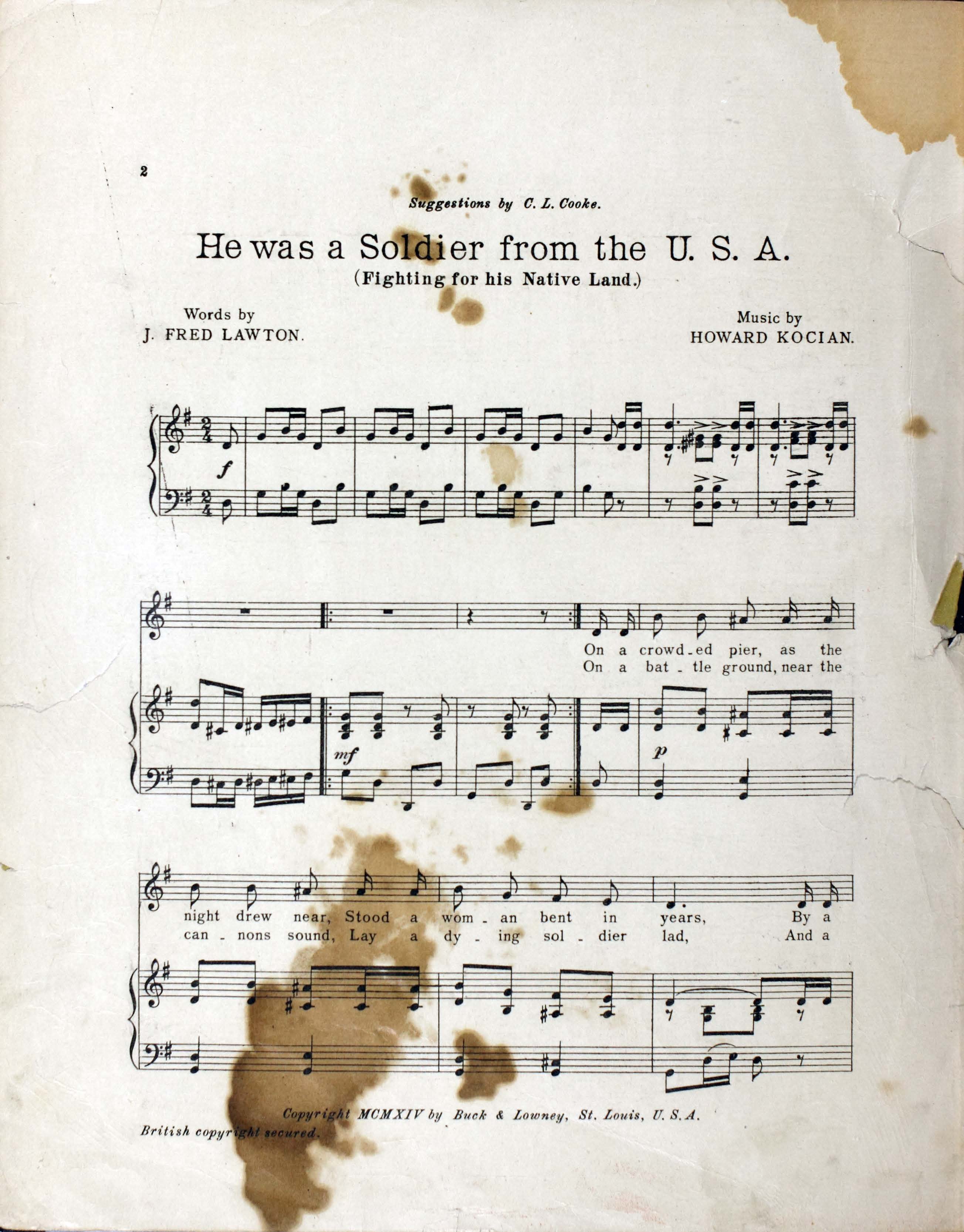 Kocian, Howard. 2000. “He Was a Soldier from the U.S.A. (fighting for His Native Land) Poem, J. Fred Lawton ; Music, Howard Kocian”. St. Louis, U.S.A. : Buck and Lowney, World War I Sheet Music, accessed February 11, 2026, https://digitalexhibits.library.wustl.edu/s/wwimusic/item/36689