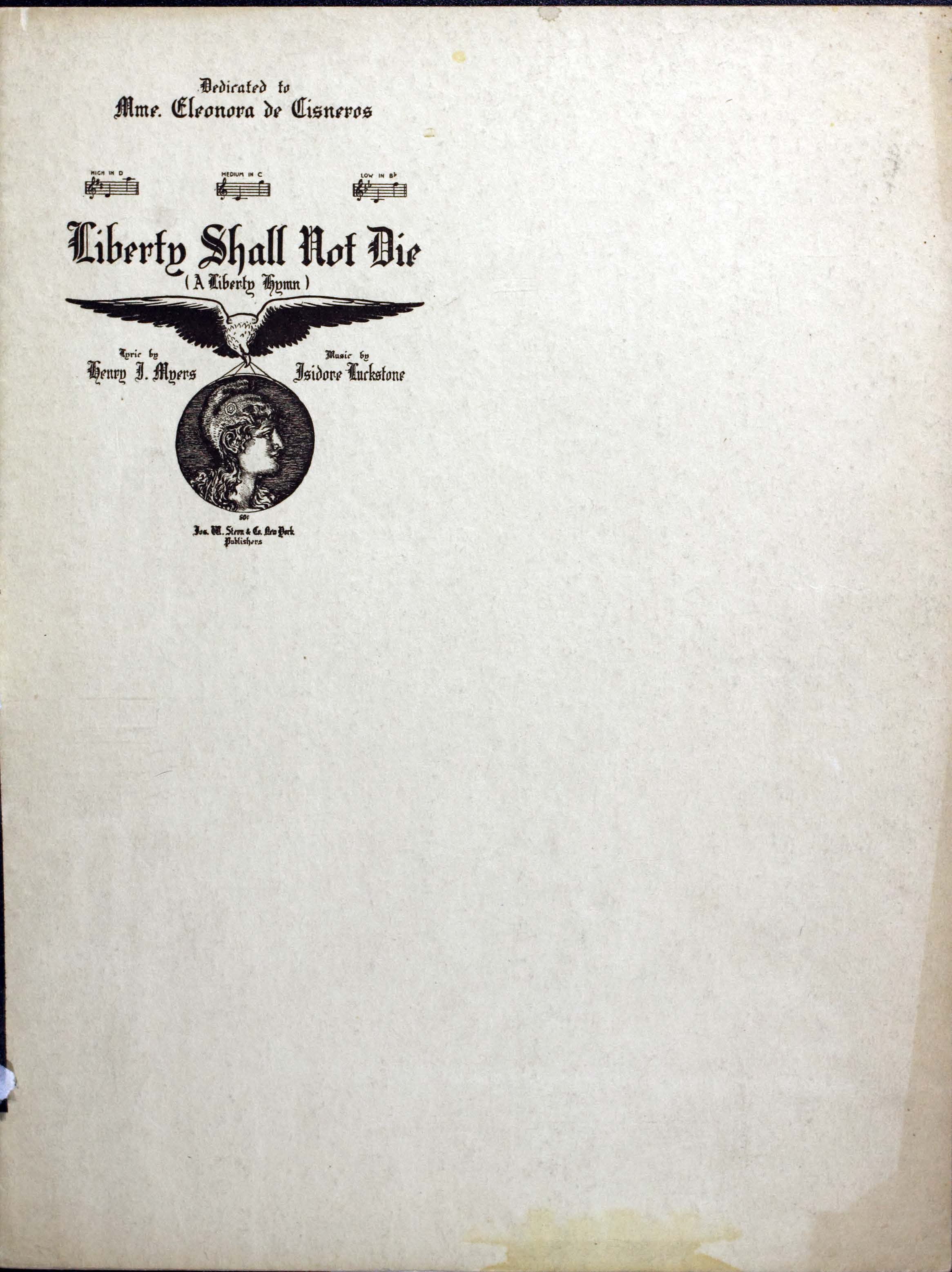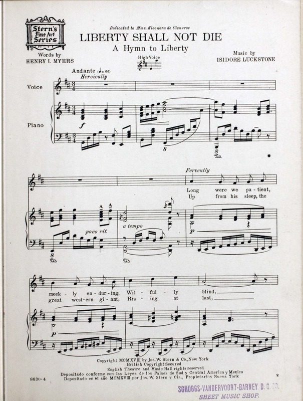 Luckstone, Isidore, 1861-1941. 2000. “Liberty Shall Not Die : a Liberty Hymn Lyric by Henry I. Myers ; Music by Isidore Luckstone”. New York : Jos. W. Stern & Co., publishers, World War I Sheet Music, accessed February 11, 2026, https://digitalexhibits.library.wustl.edu/s/wwimusic/item/36693