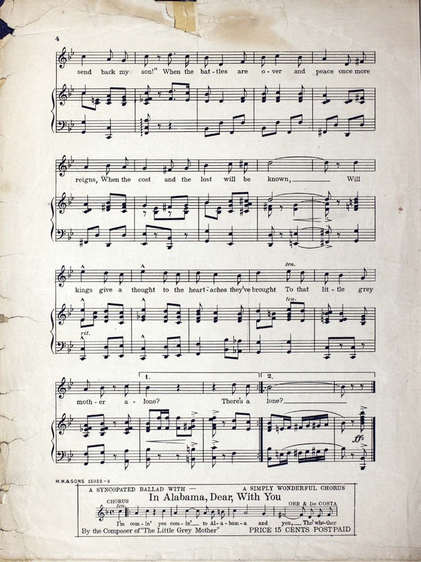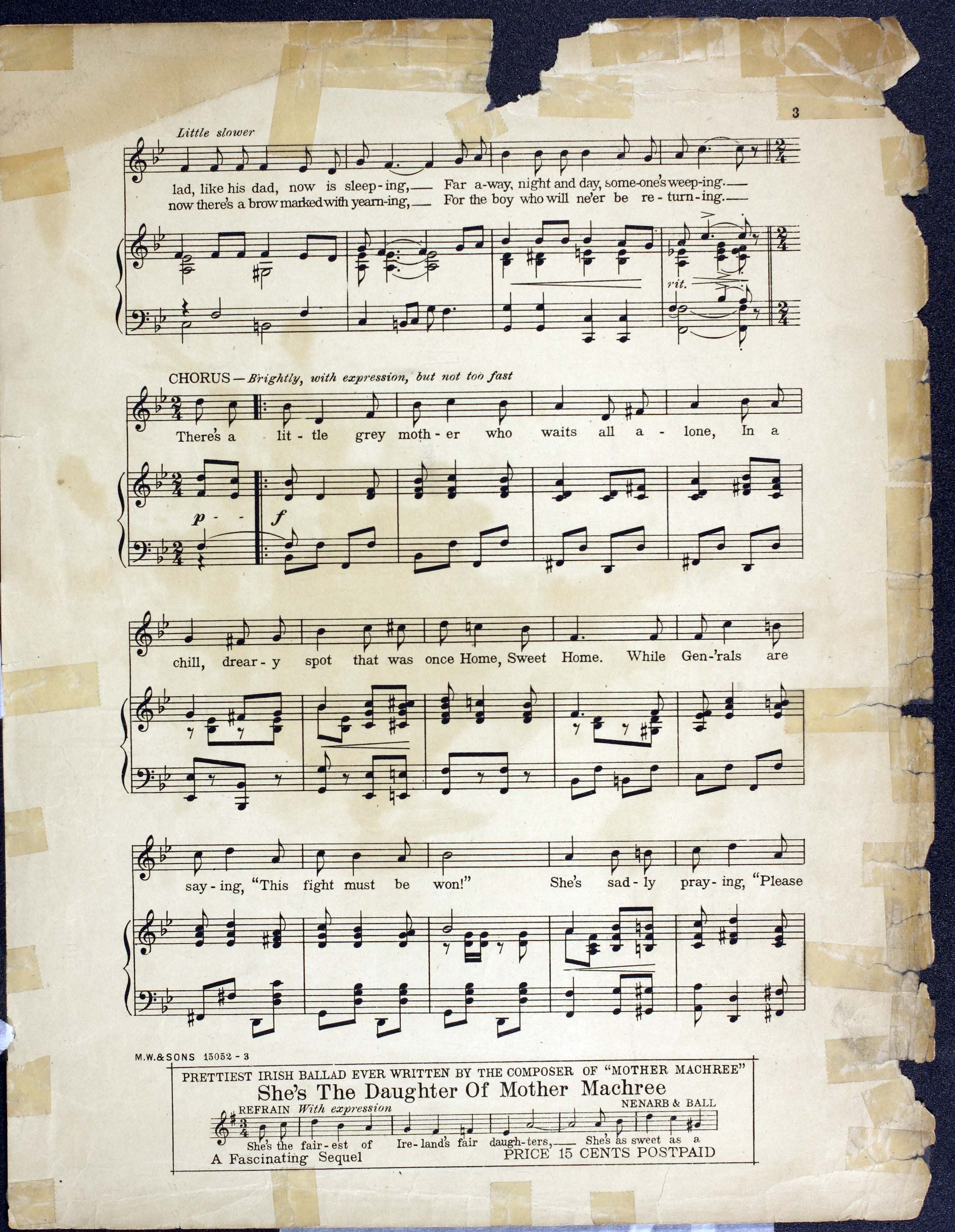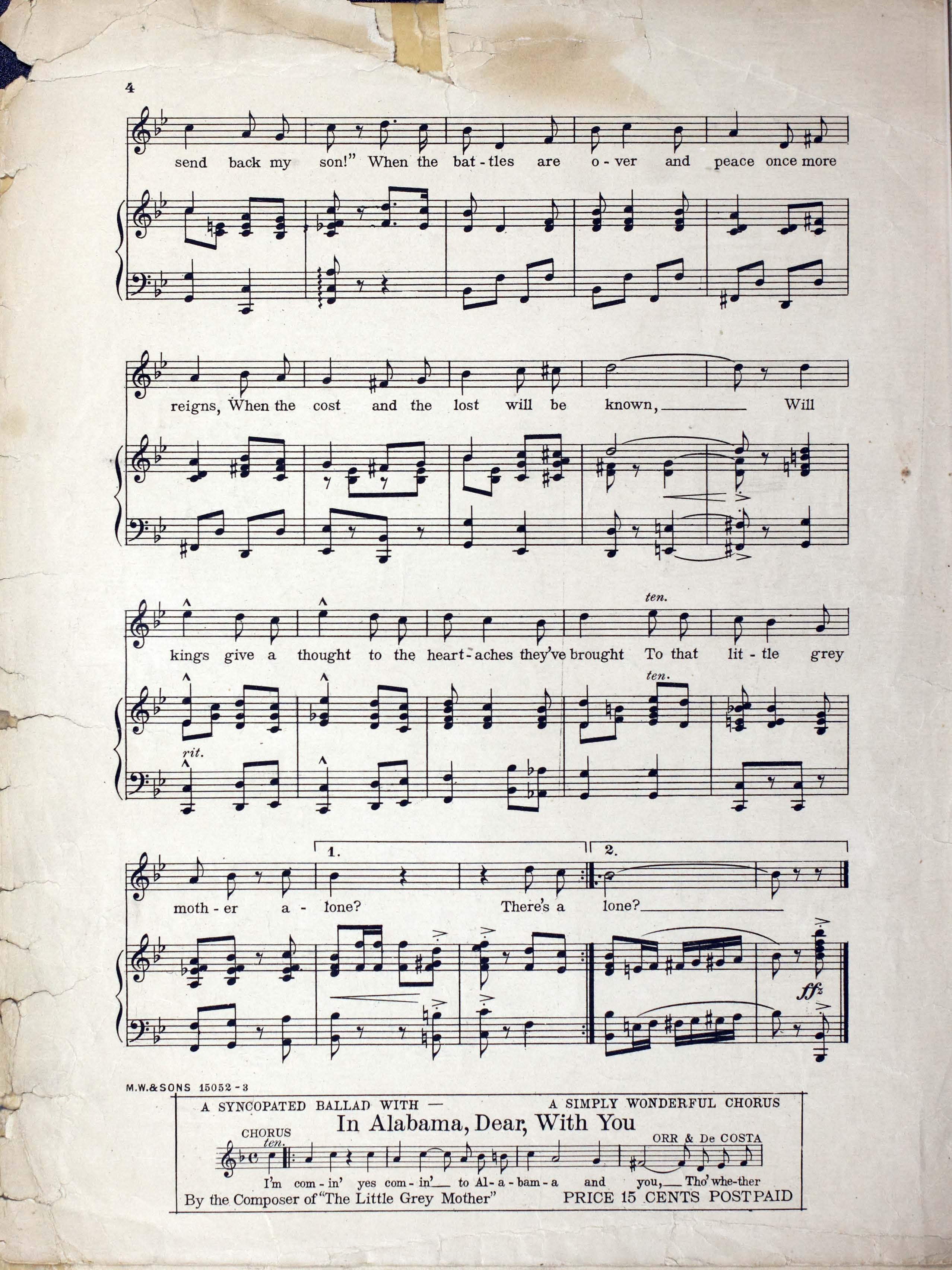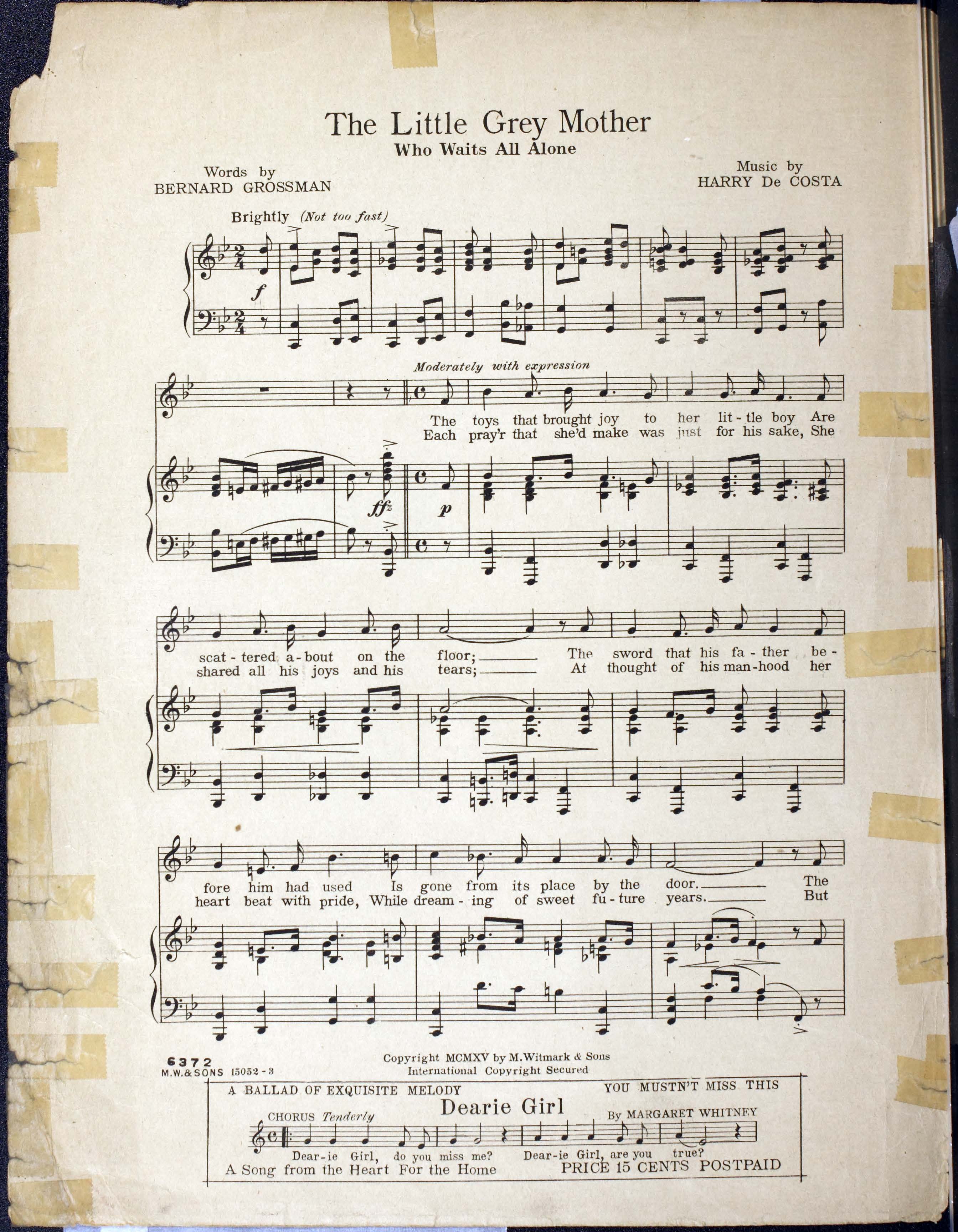 De Costa, Harry, 1885-1964. 2000. “The Little Grey Mother Who Waits All Alone : March Ballad Words by Bernard Grossman ; Music by Harry De Costa”. New York : M. Witmark and Sons, World War I Sheet Music, accessed February 11, 2026, https://digitalexhibits.library.wustl.edu/s/wwimusic/item/36694