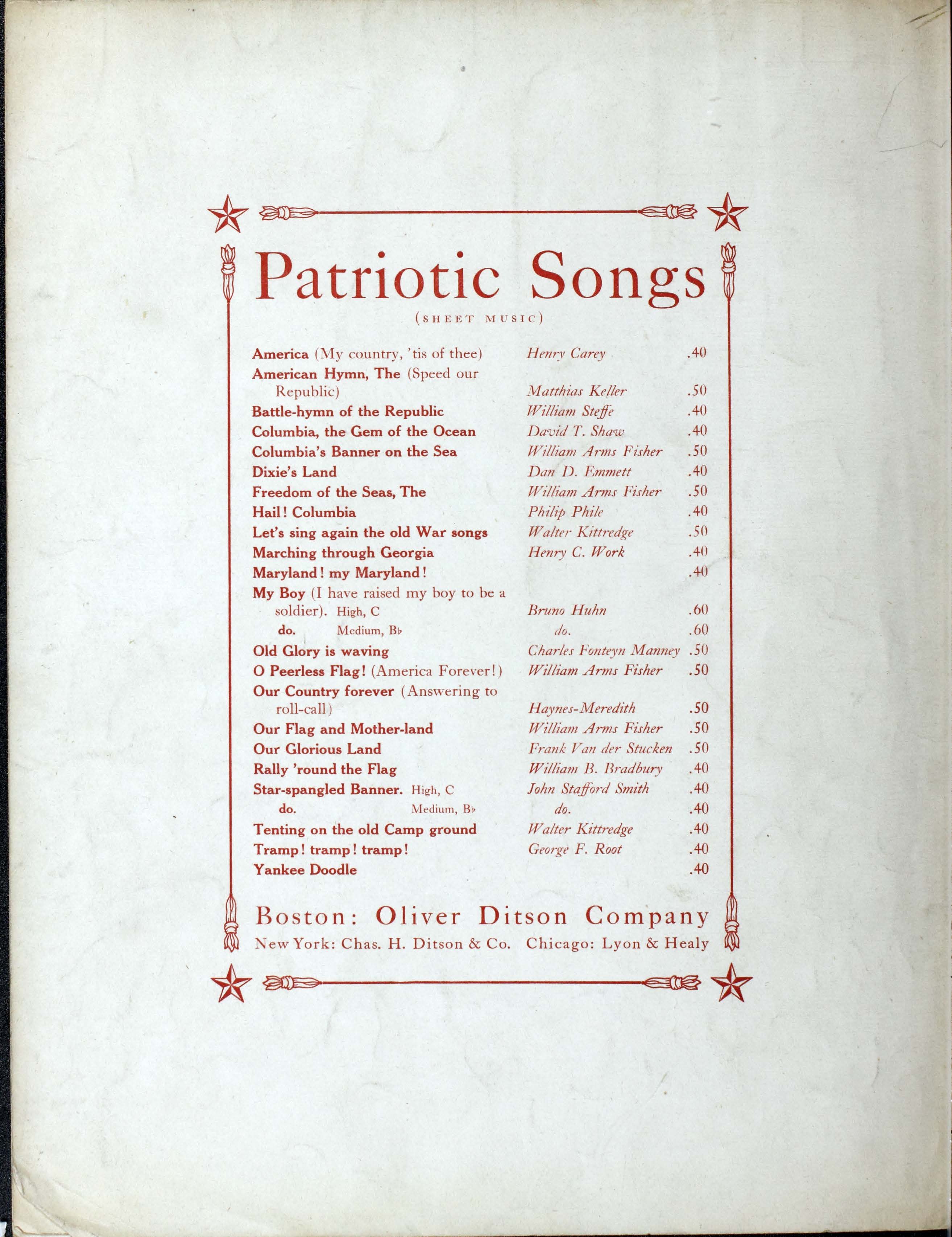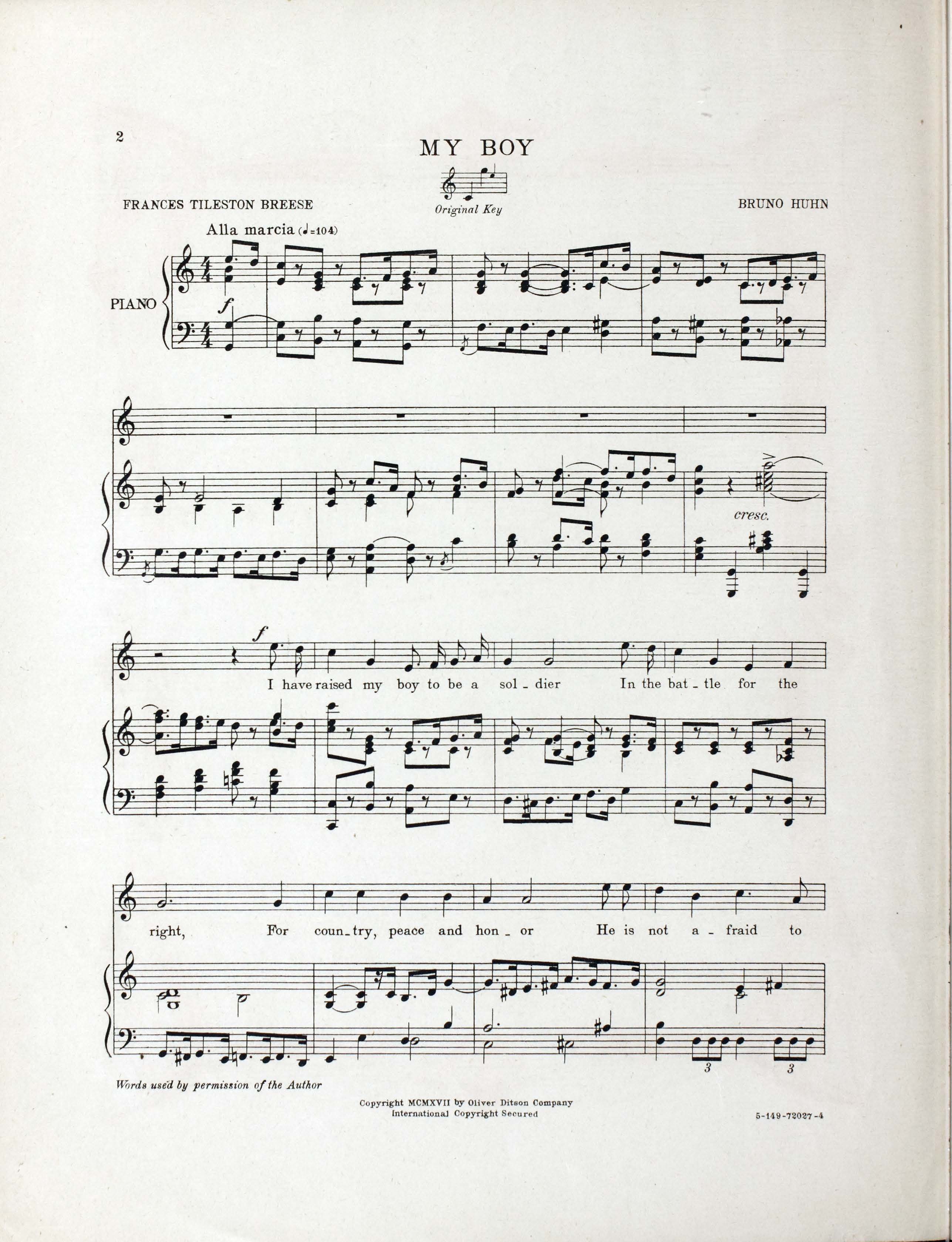 Huhn, B. 2000. “My Boy Words by Frances Tileston Breese ; Music by Bruno Huhn”. Boston : Oliver Ditson Company, World War I Sheet Music, accessed February 11, 2026, https://digitalexhibits.library.wustl.edu/s/wwimusic/item/36705