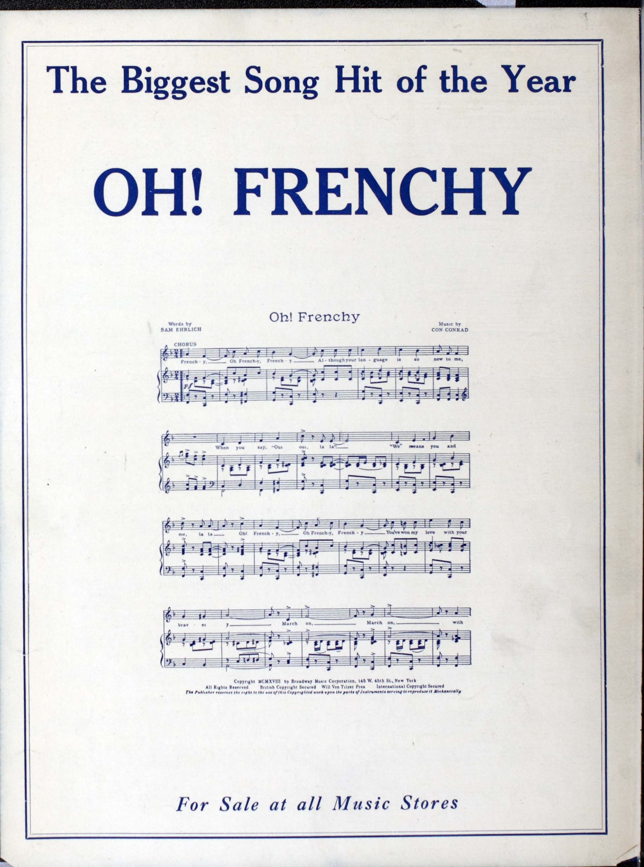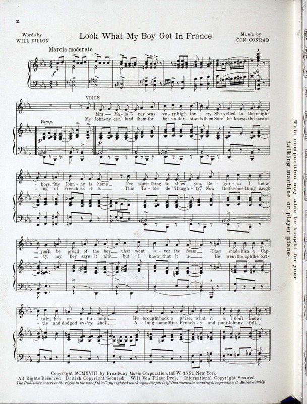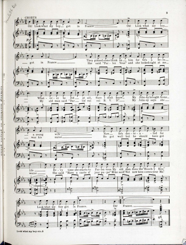 “Look What My Boy Got in France Words by Will Dillon ; Music by Con Conrad”. 2000. New York (145 West 45th St.) : Broadway Music Corporation, World War I Sheet Music, accessed February 11, 2026, https://digitalexhibits.library.wustl.edu/s/wwimusic/item/36706