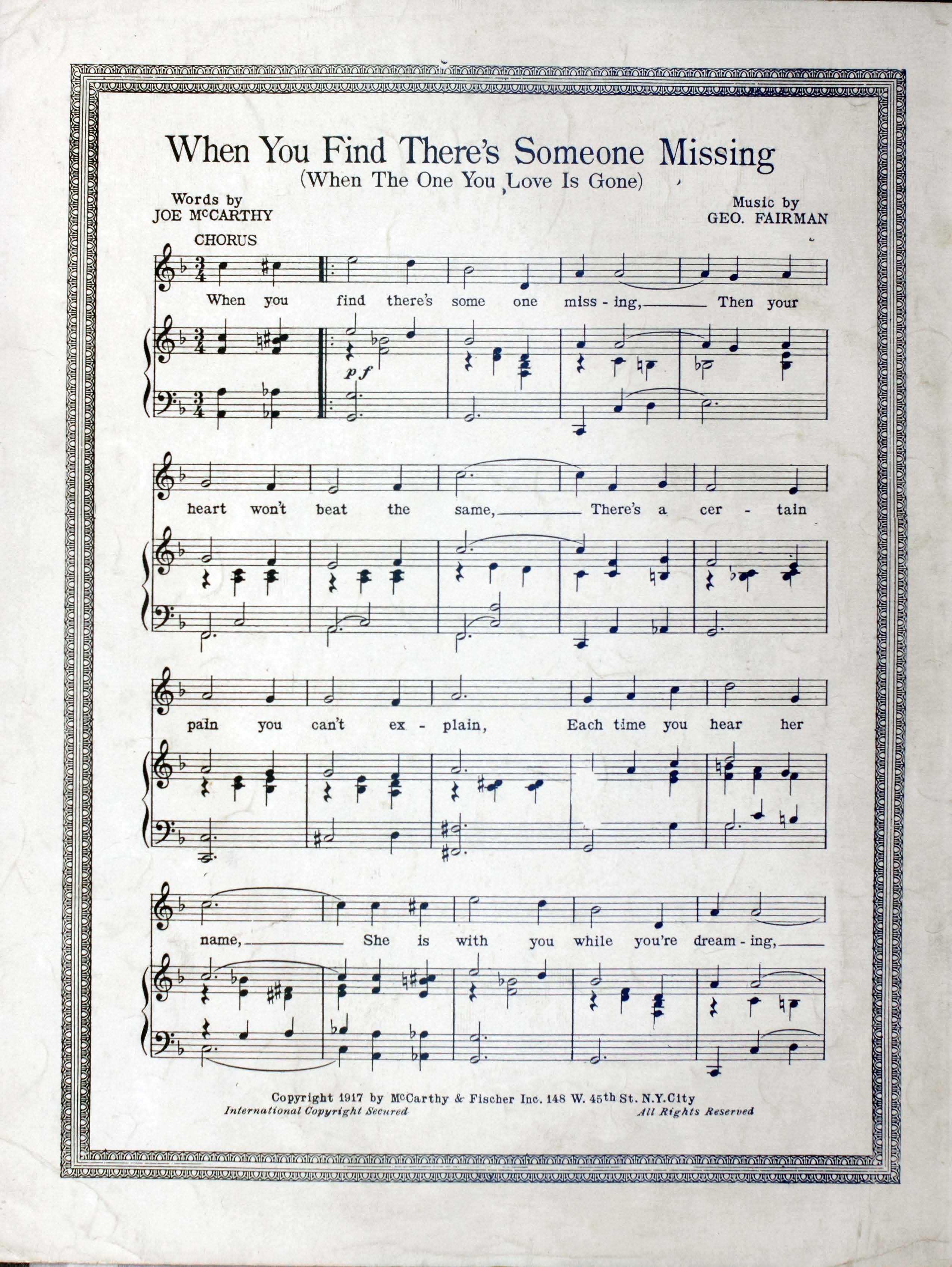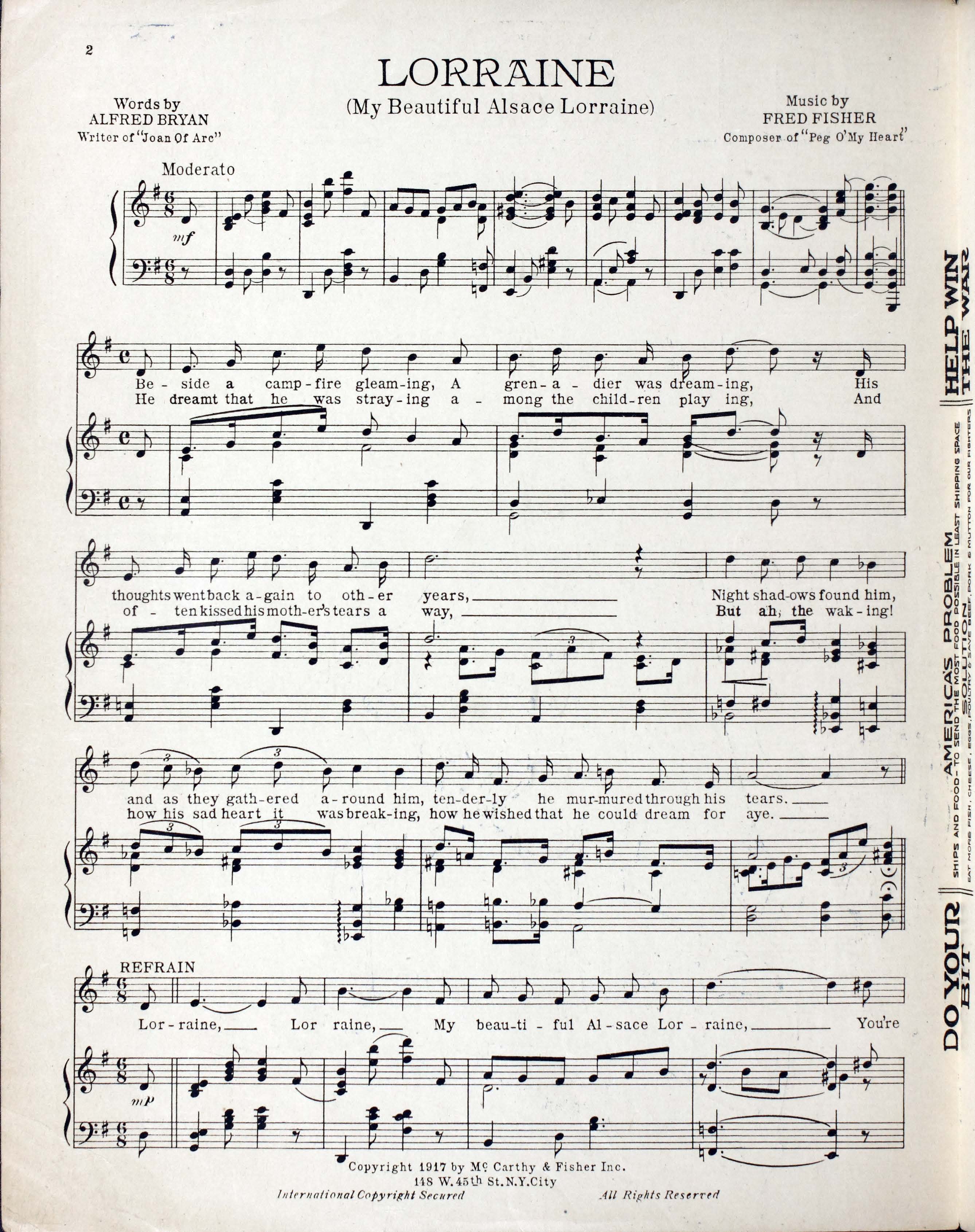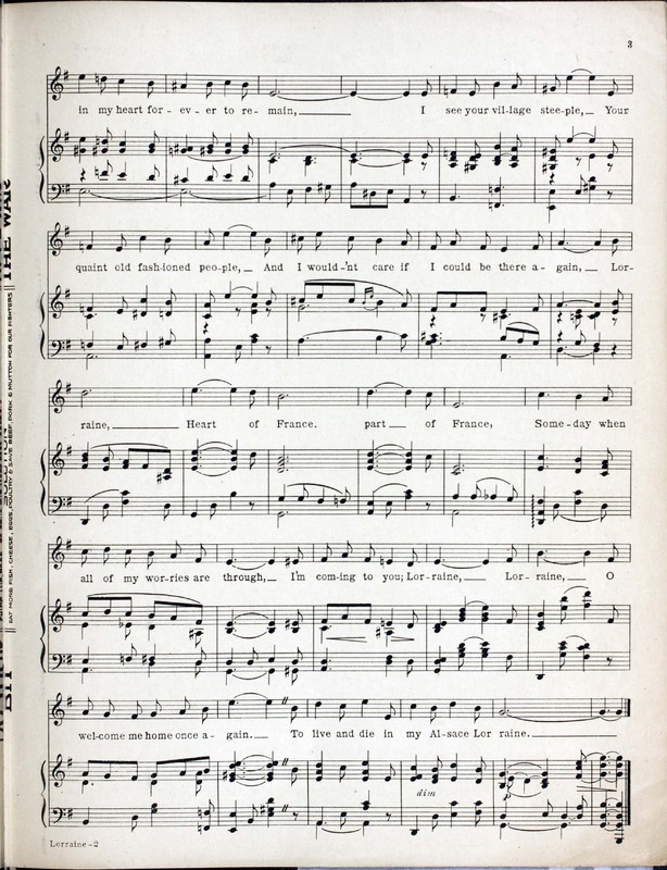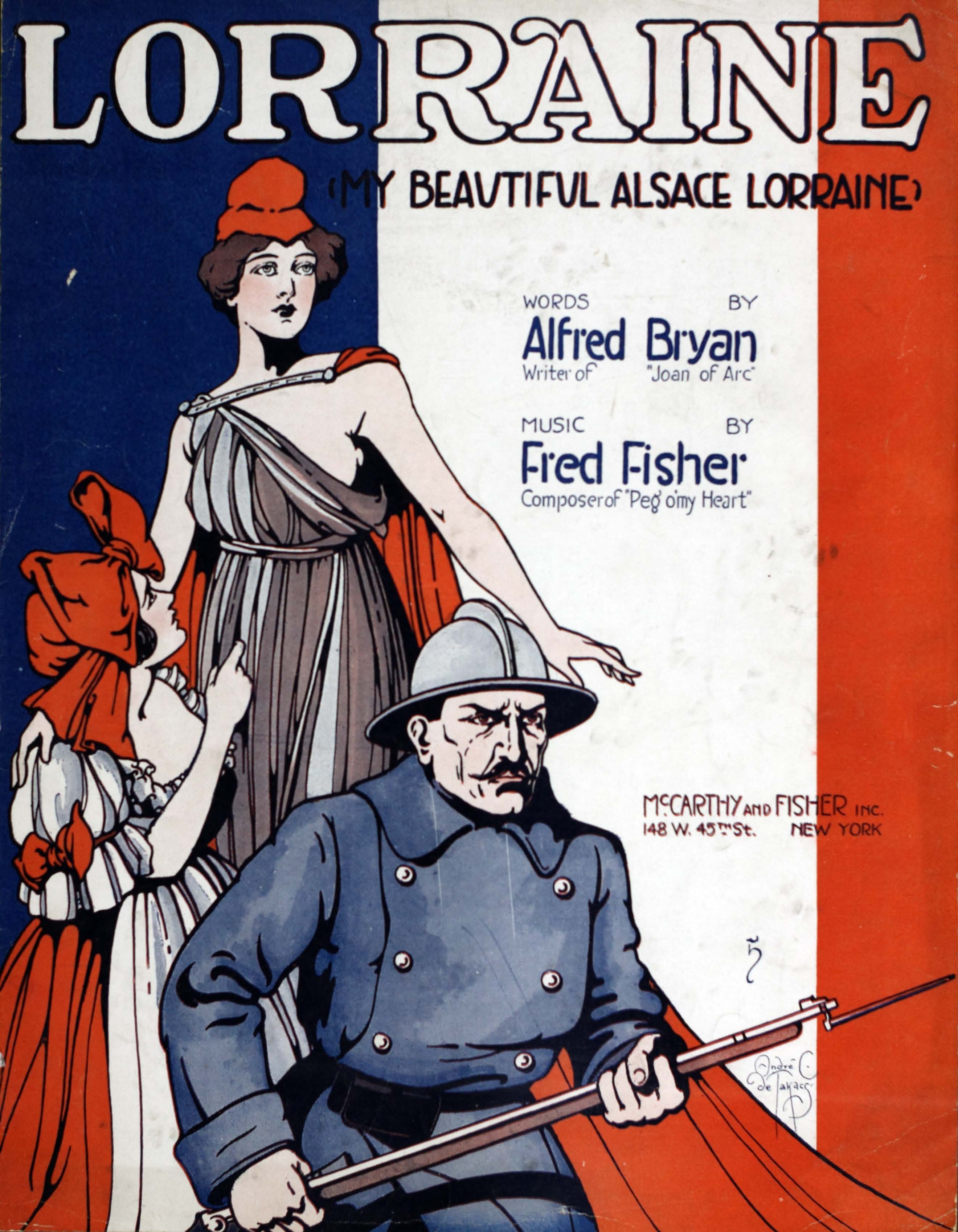 Fisher, Fred, 1875-1942. 2000. “Lorraine : (my Beautiful Alsace Lorraine) Words by Alfred Bryan ; Music by Fred Fisher”. New York (148 W. 45th St.) : McCarthy and Fisher, Inc, World War I Sheet Music, accessed February 11, 2026, https://digitalexhibits.library.wustl.edu/s/wwimusic/item/36710