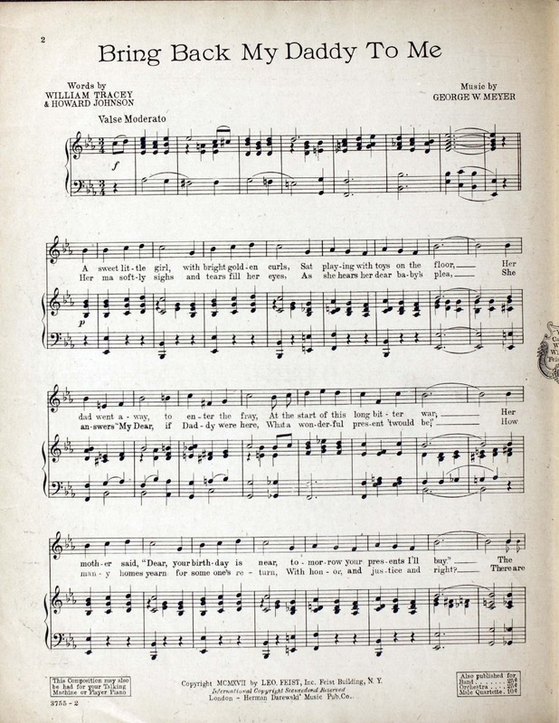 Meyer, George W., 1884-1959. 2000. “Bring Back My Daddy to Me Words by William Tracy and Howard Johnson ; Music by George W. Meyer”. New York : Leo Feist, Inc, World War I Sheet Music, accessed April 2, 2026, https://digitalexhibits.library.wustl.edu/s/wwimusic/item/36713