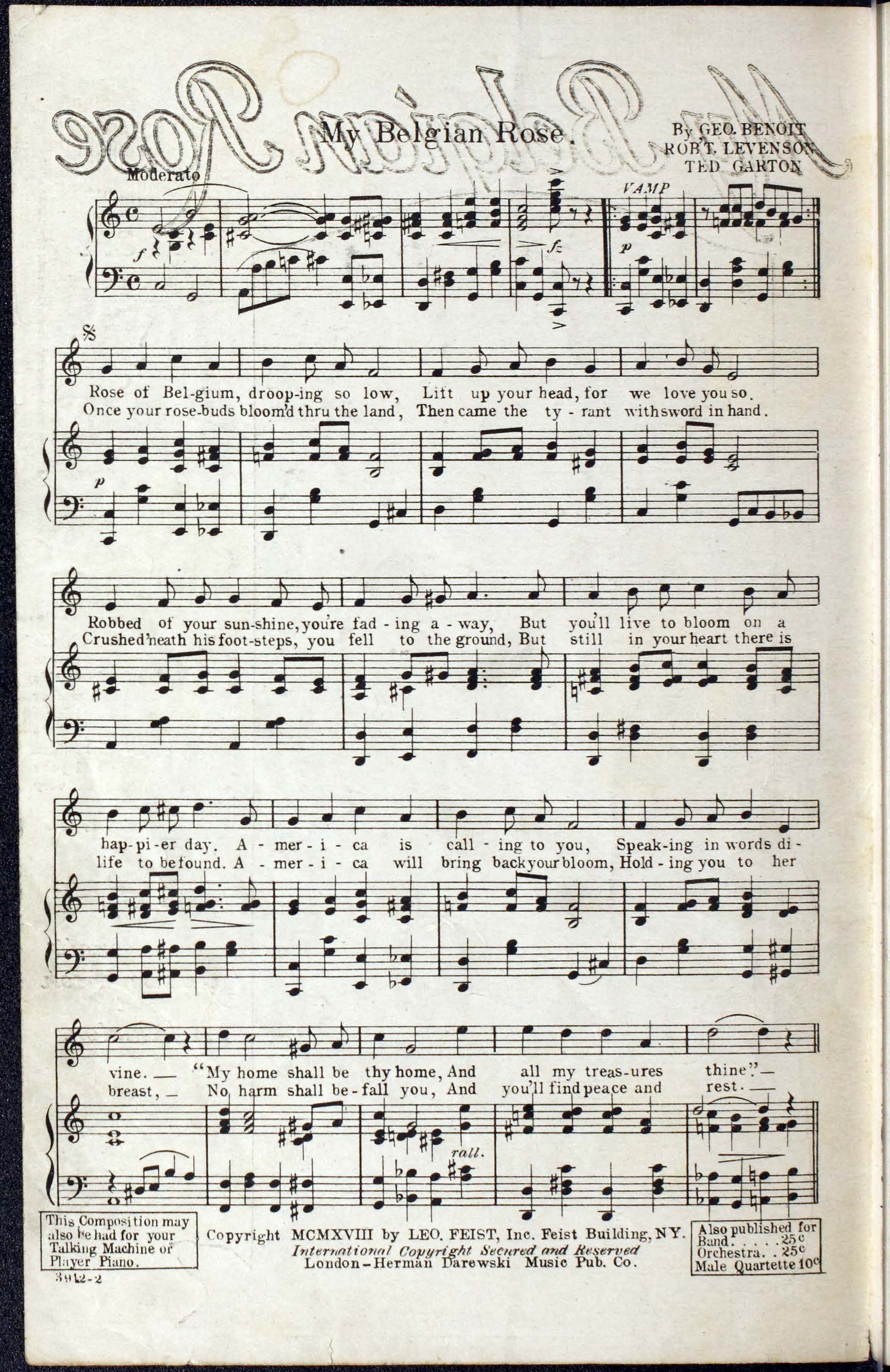 Garton, Ted. 2000. “My Belgian Rose By Geo. Benoit, Rob’t Levenson and Ted Garton”. New York (Feist Building) : Leo Feist, Inc, World War I Sheet Music, accessed April 2, 2026, https://digitalexhibits.library.wustl.edu/s/wwimusic/item/36935